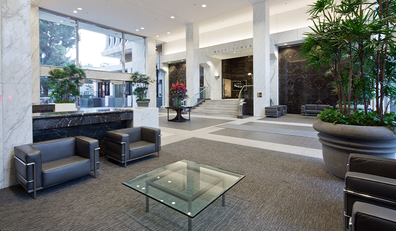 9100 Wilshire, one of the most coveted office buildings in the heart of Beverly Hills. This distinguished property features twin office towers seamlessly connected by a beautifully updated central lobby, creating an ambiance of sophistication and modernity.