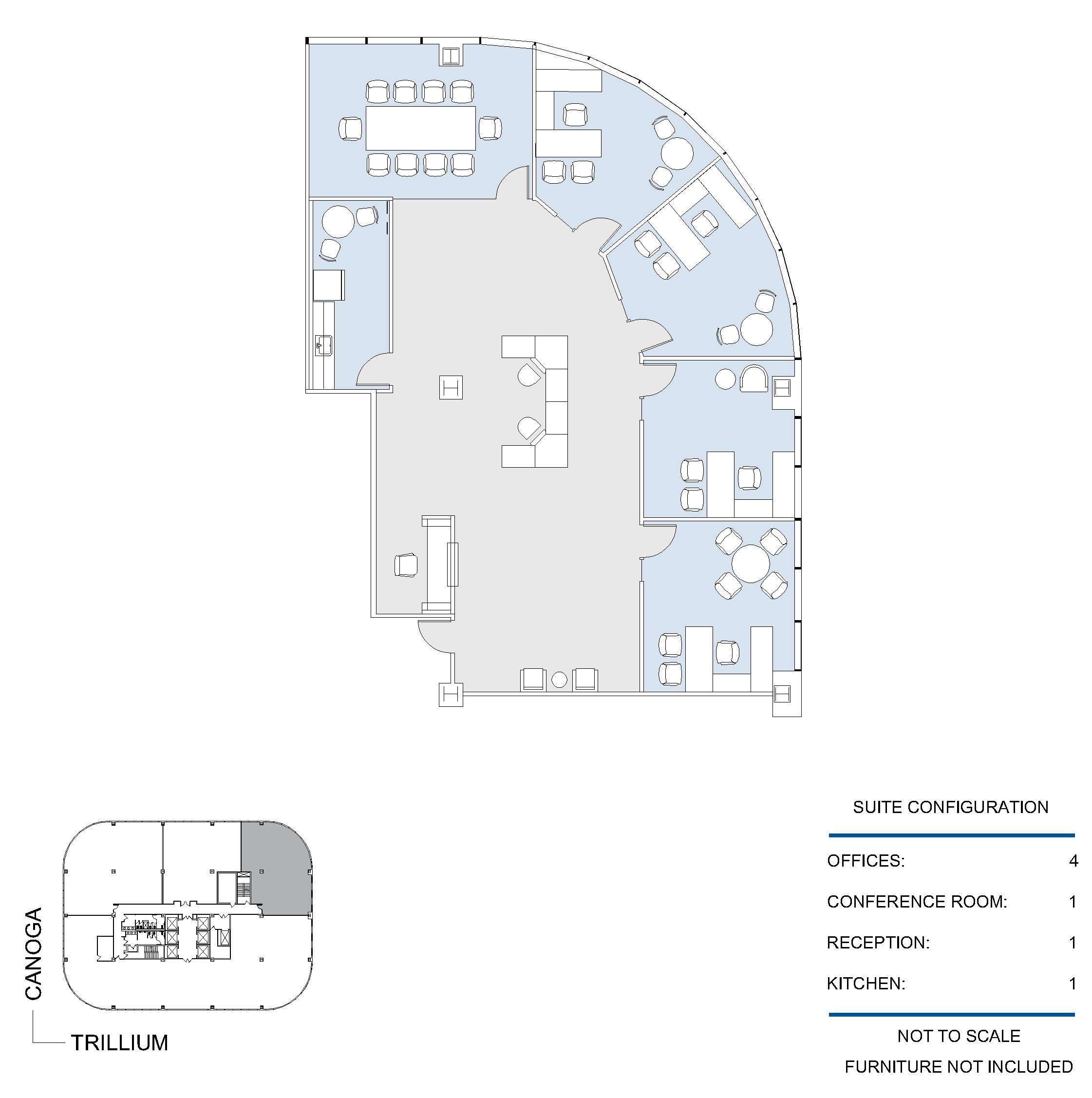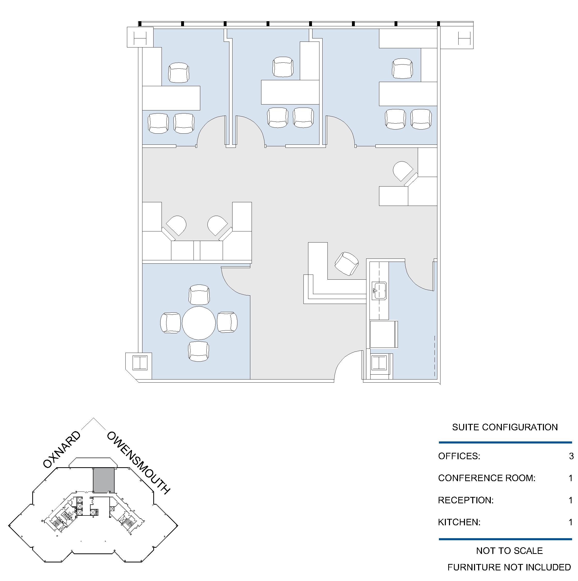 3 window offices, window line conference room, open work area, kitchen and reception area.
