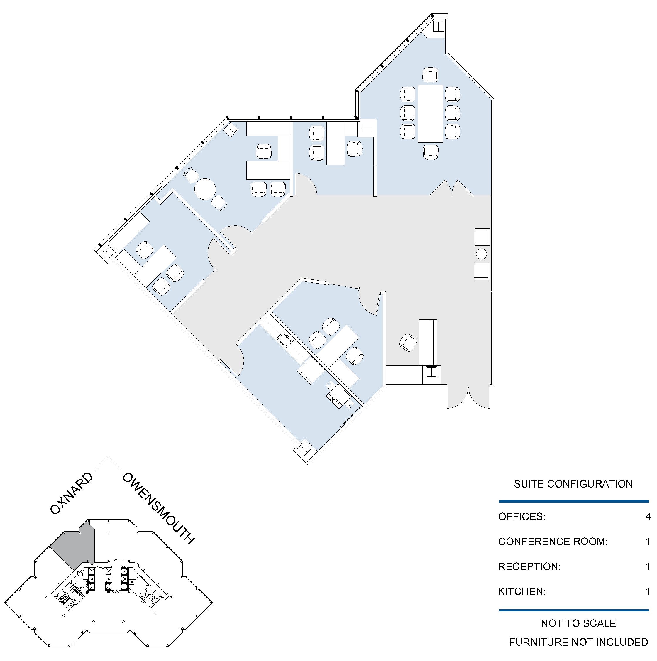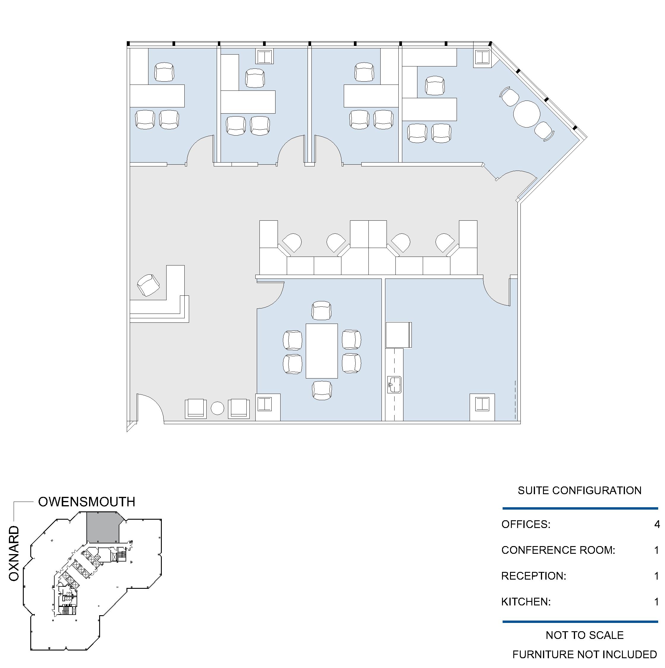 4 window offices, 2 conference rooms, kitchen, file store room, and reception area.