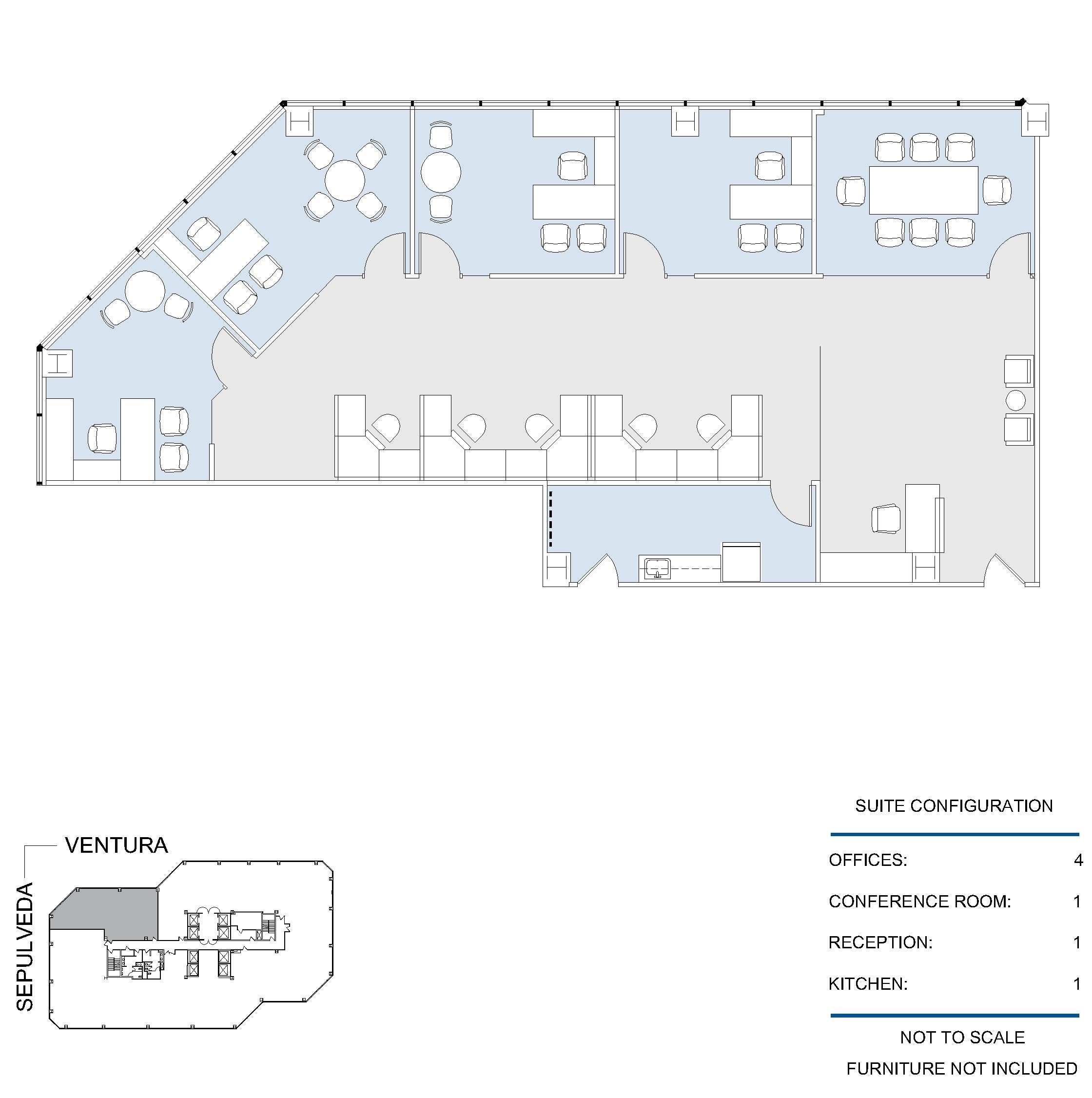 Corner Suite! 4 window offices, window line conference room, large open work area, kitchen, and reception area.