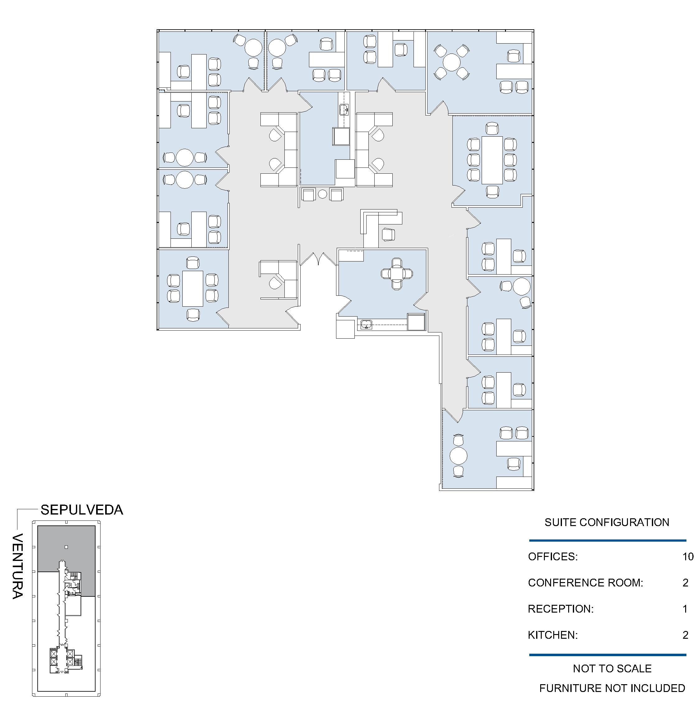 10 private offices, conference room, large open work area, kitchen/file room and reception area.