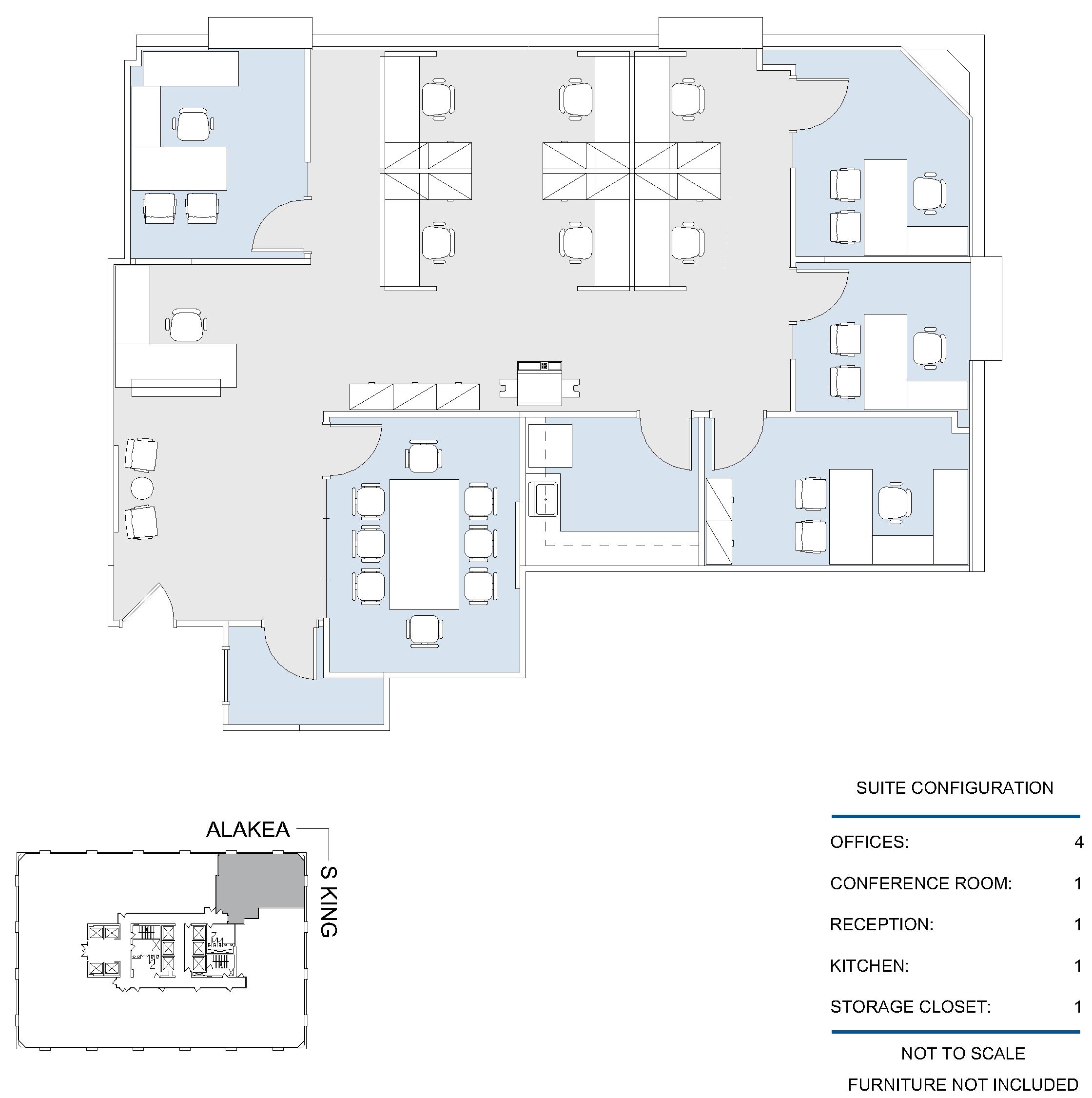 4 window offices, conference room, open work area, storage room, kitchen, and reception area.