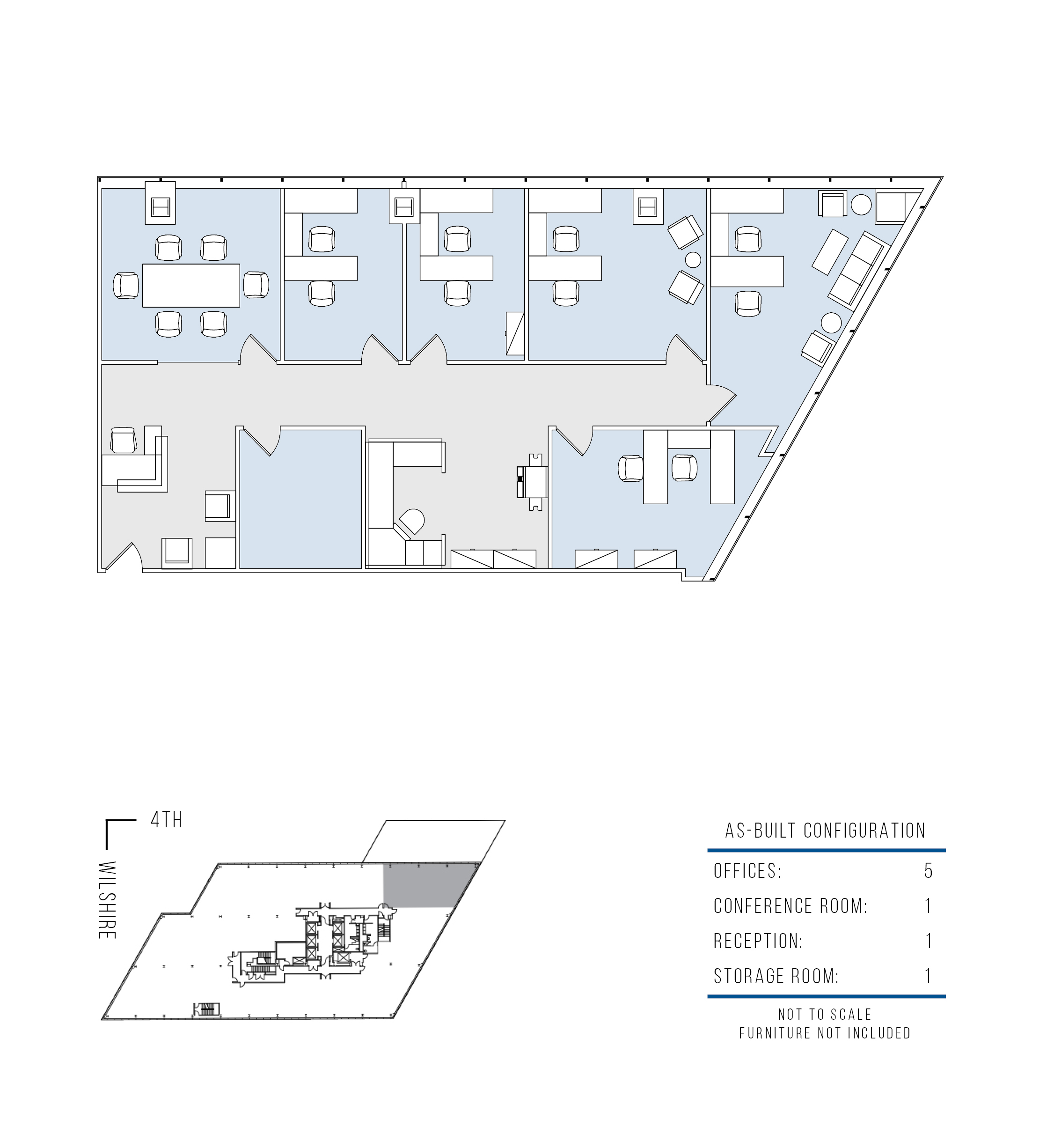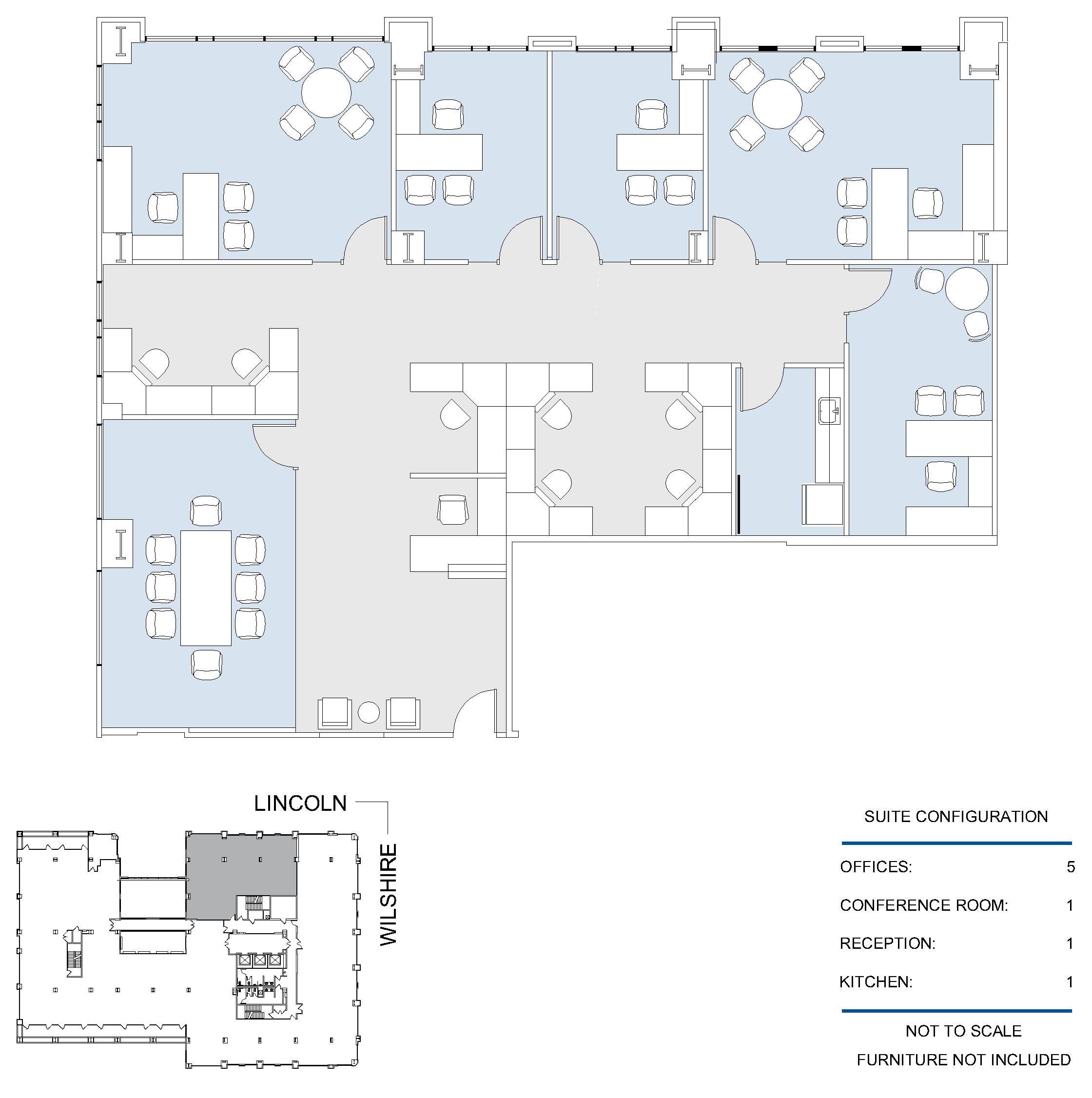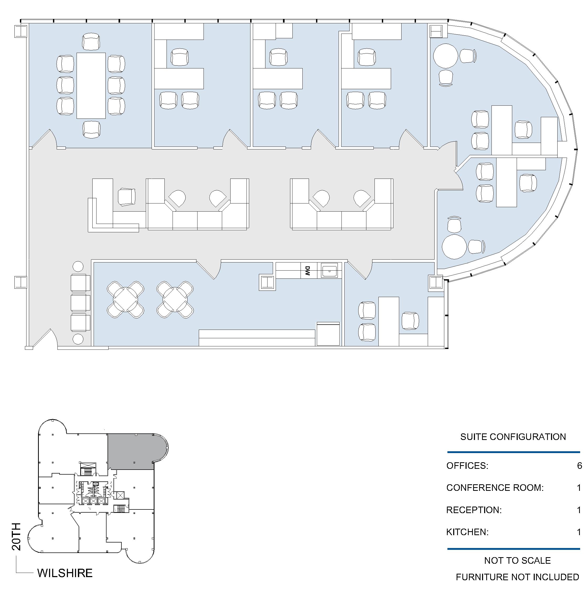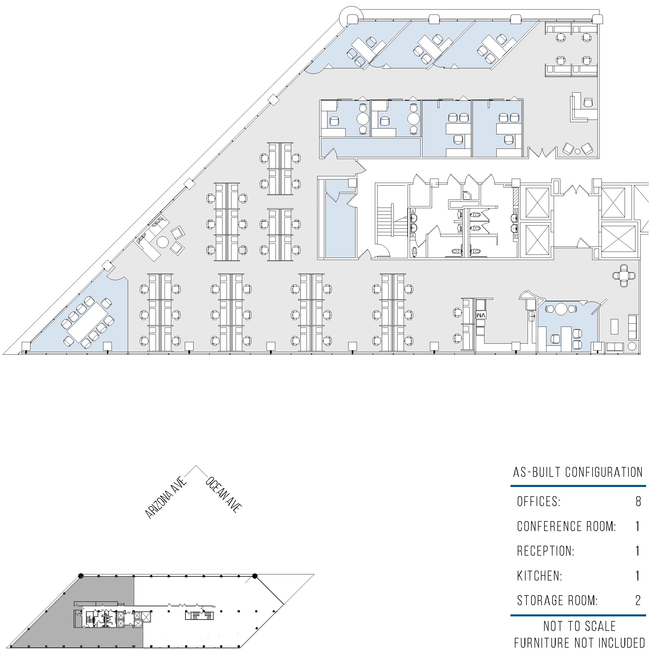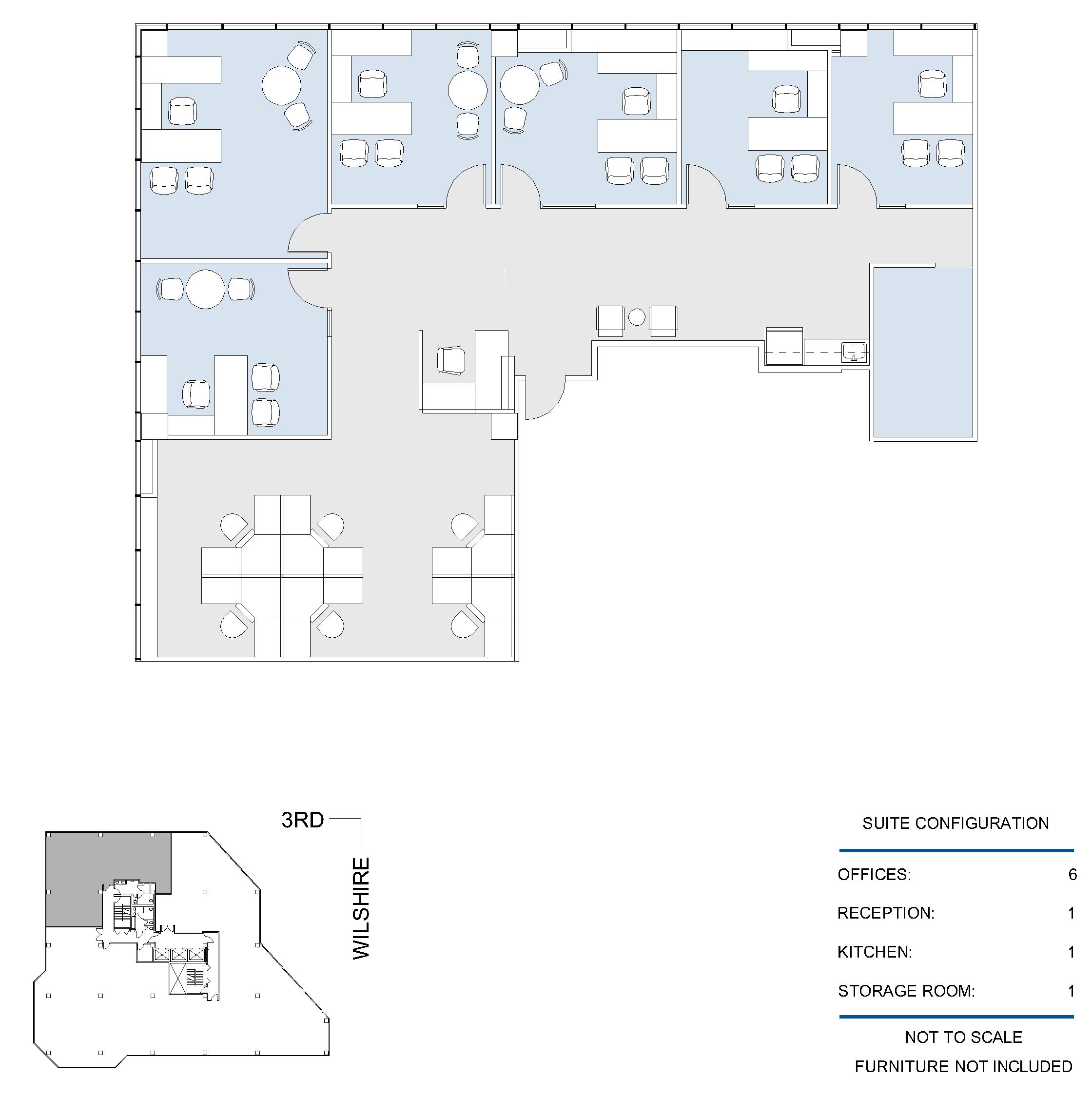 6 window offices, open work area, open kitchen, storage room, and reception area.