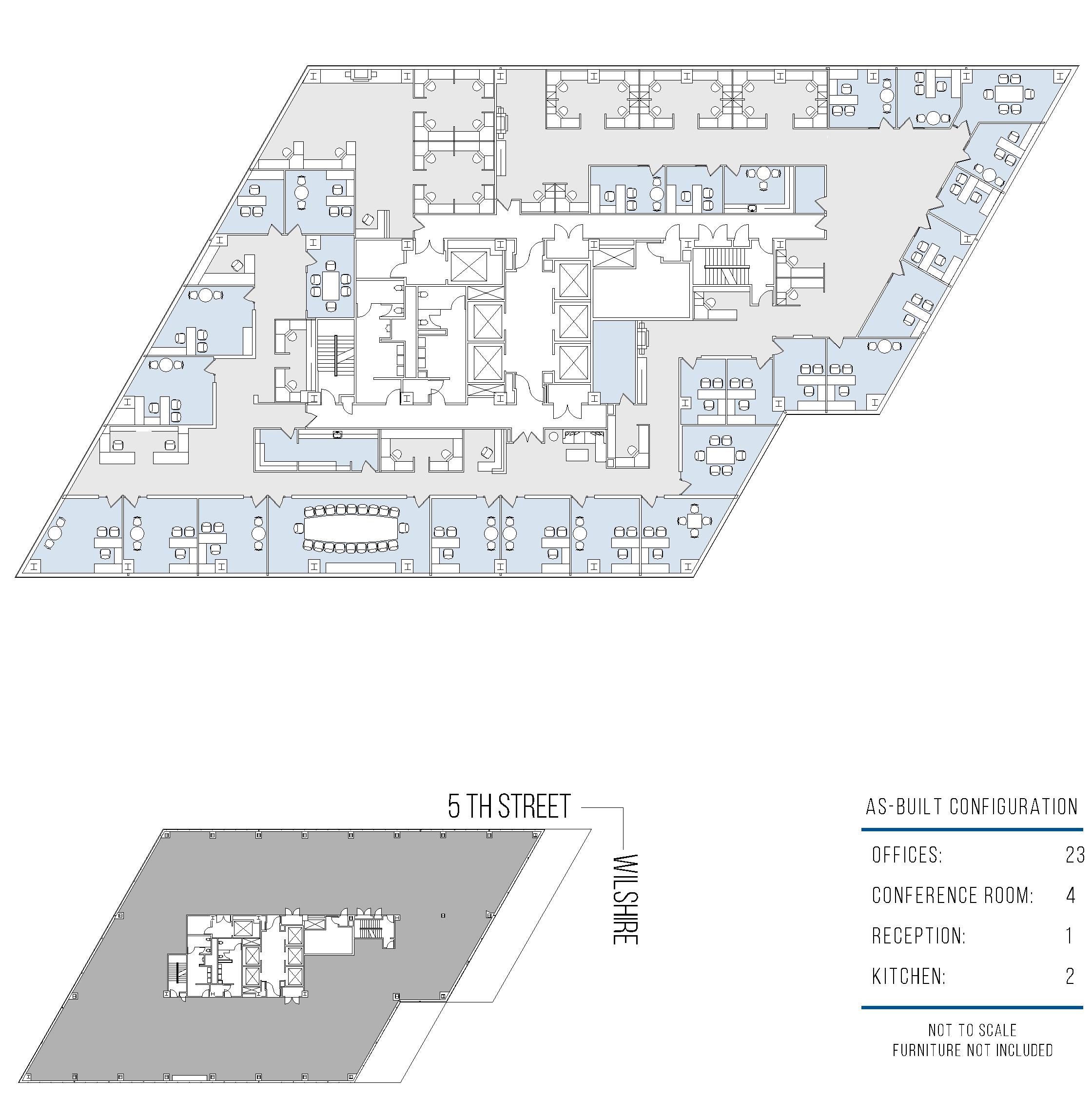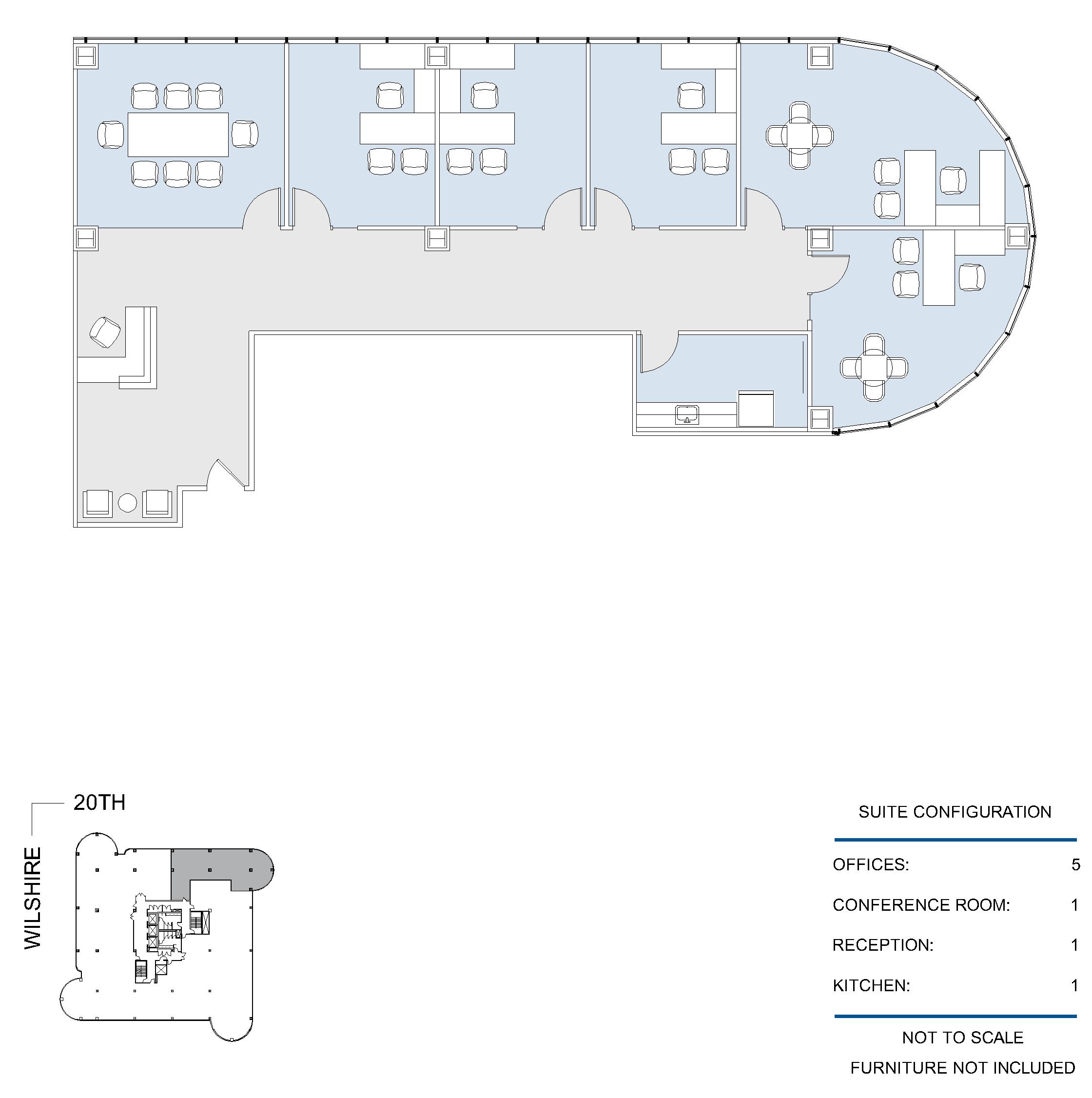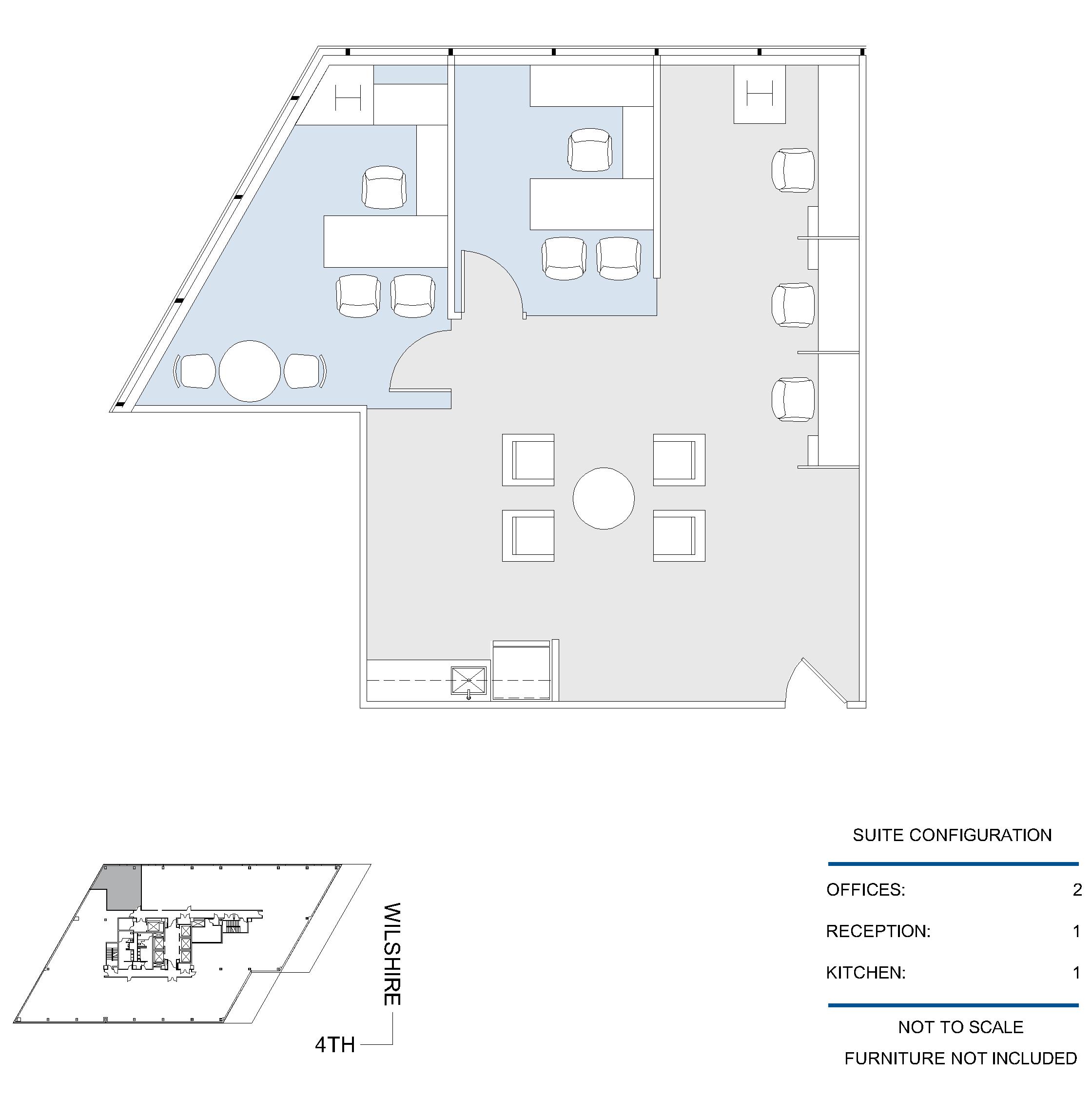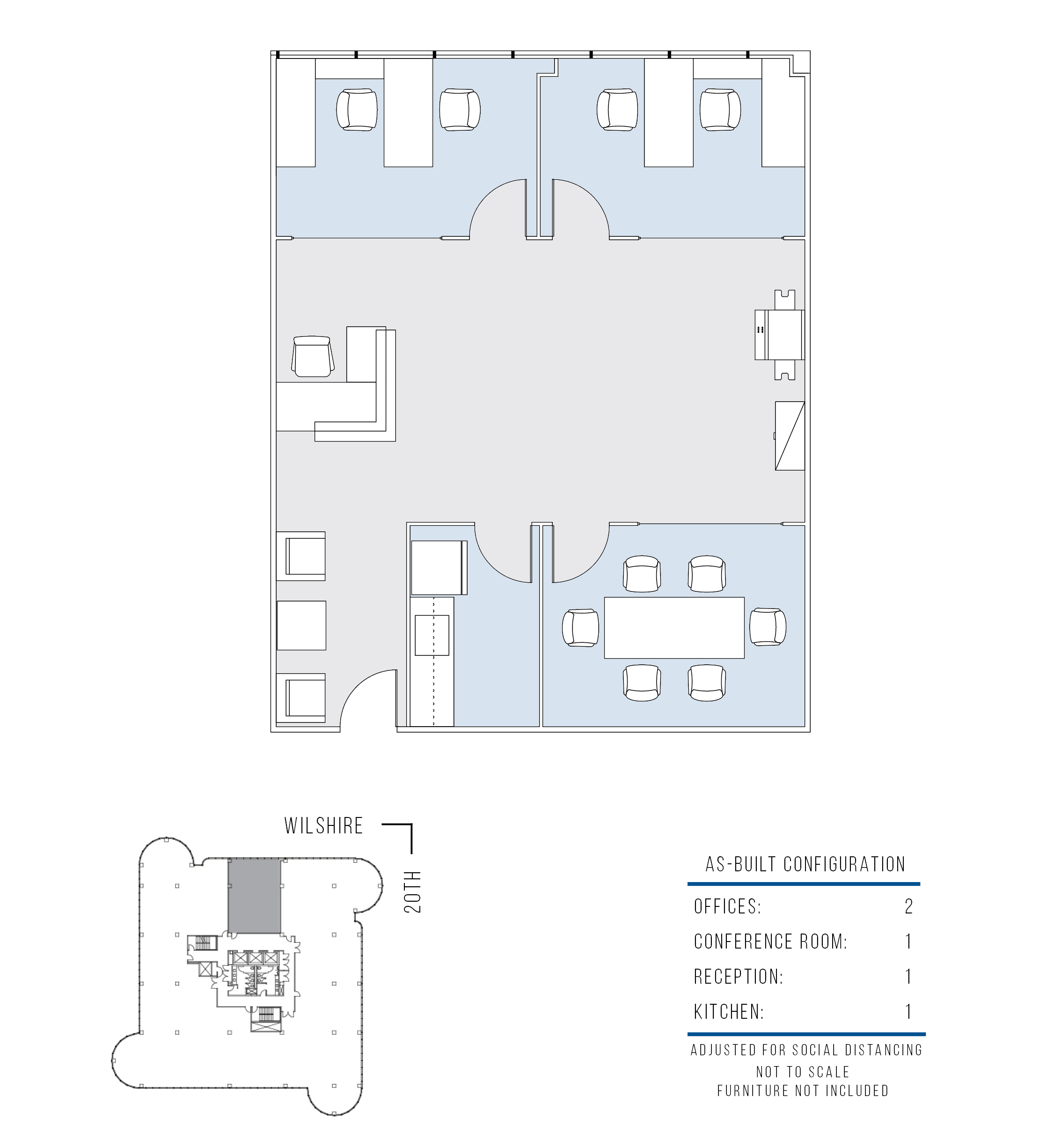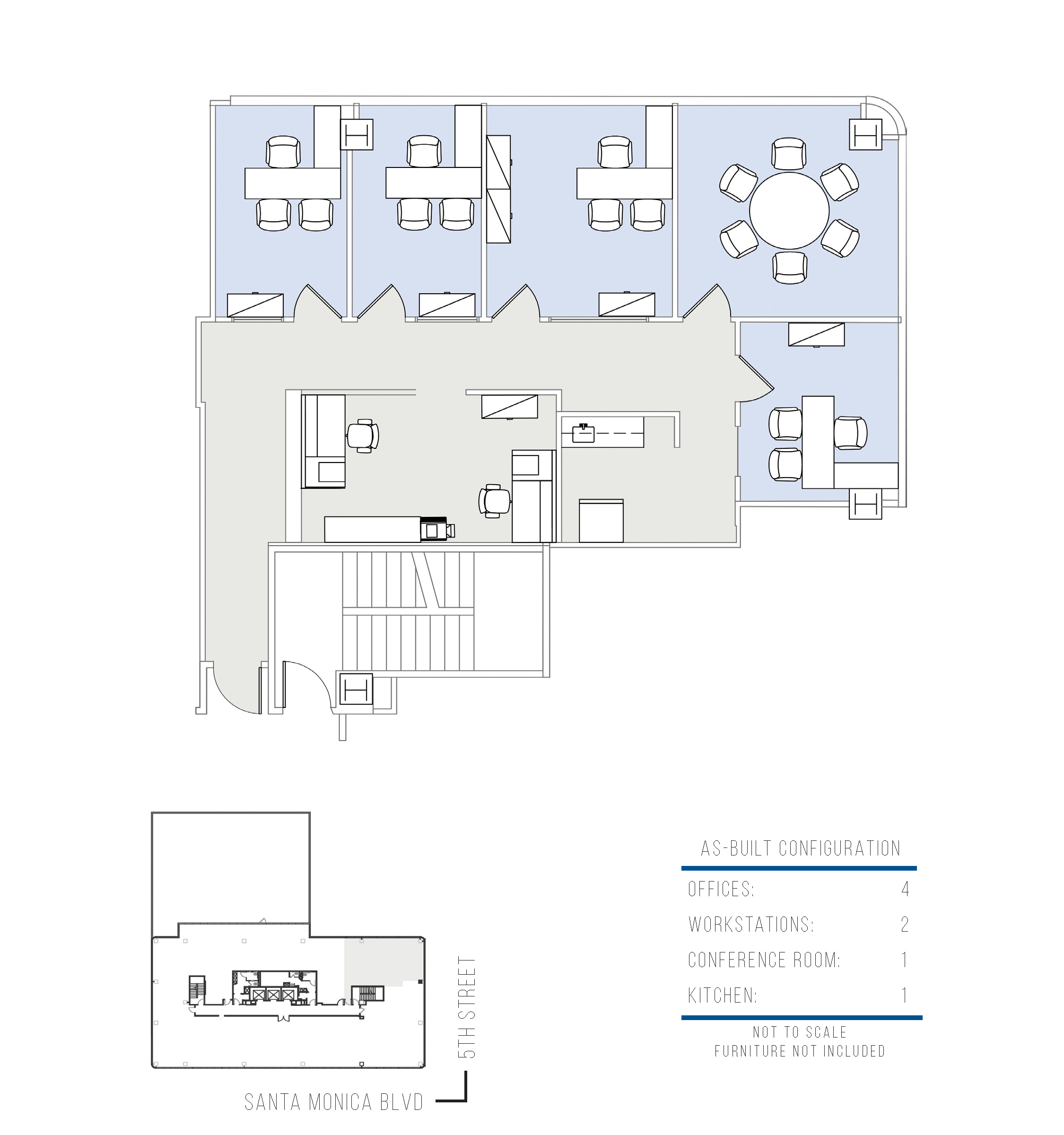 6 window offices, open work area, open kitchen, storage room, and reception area.