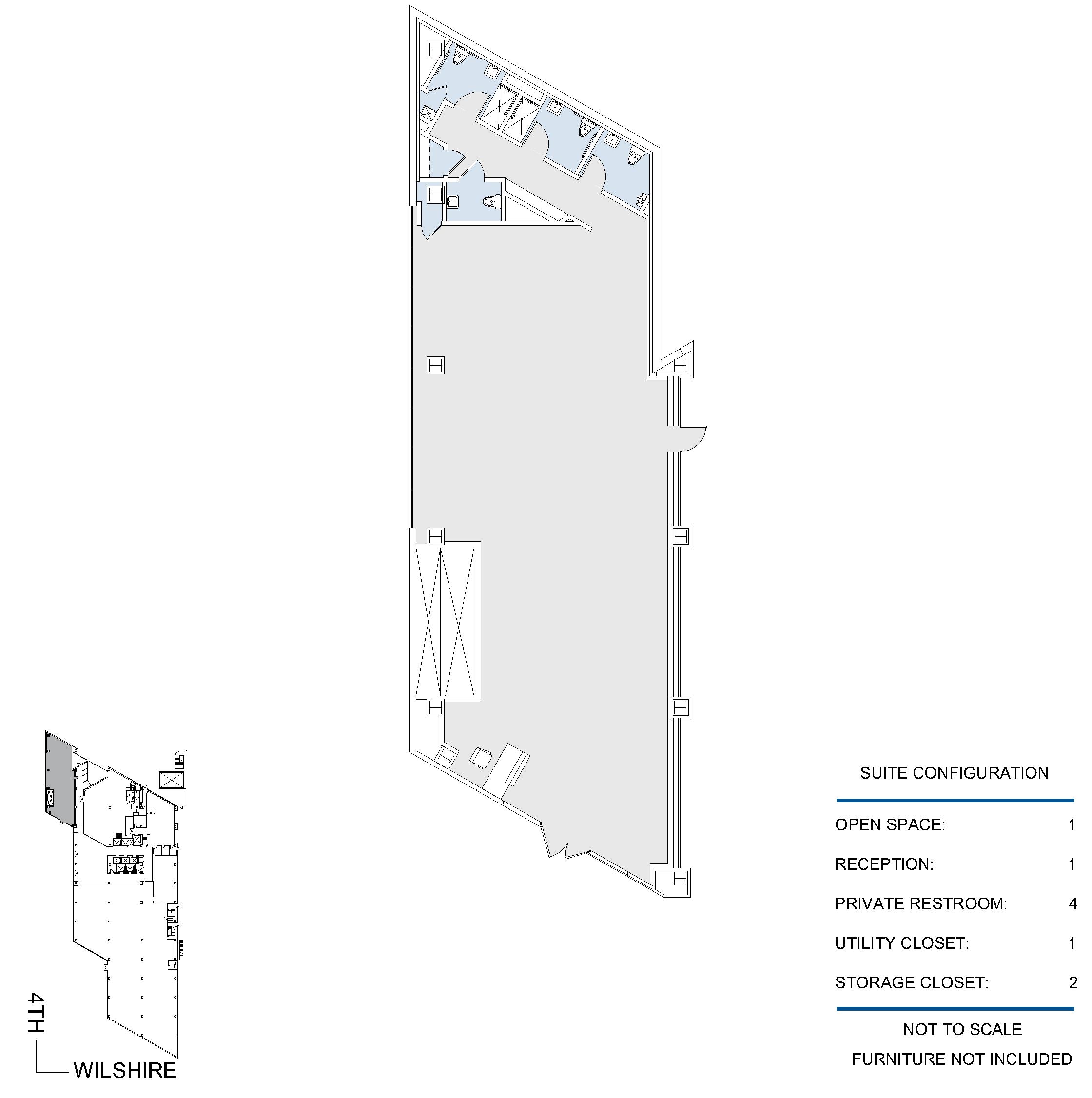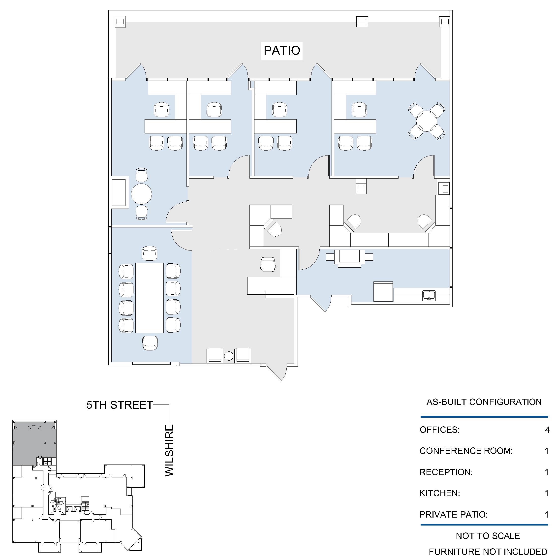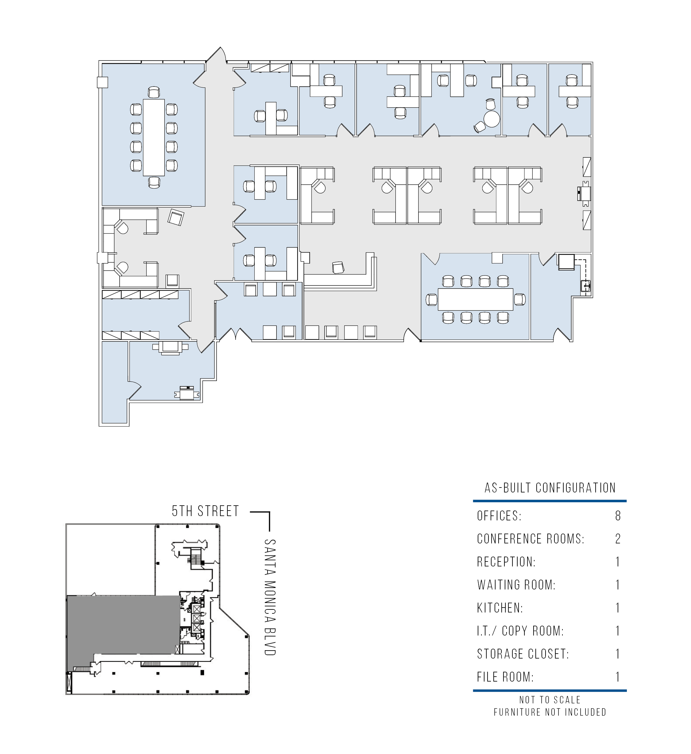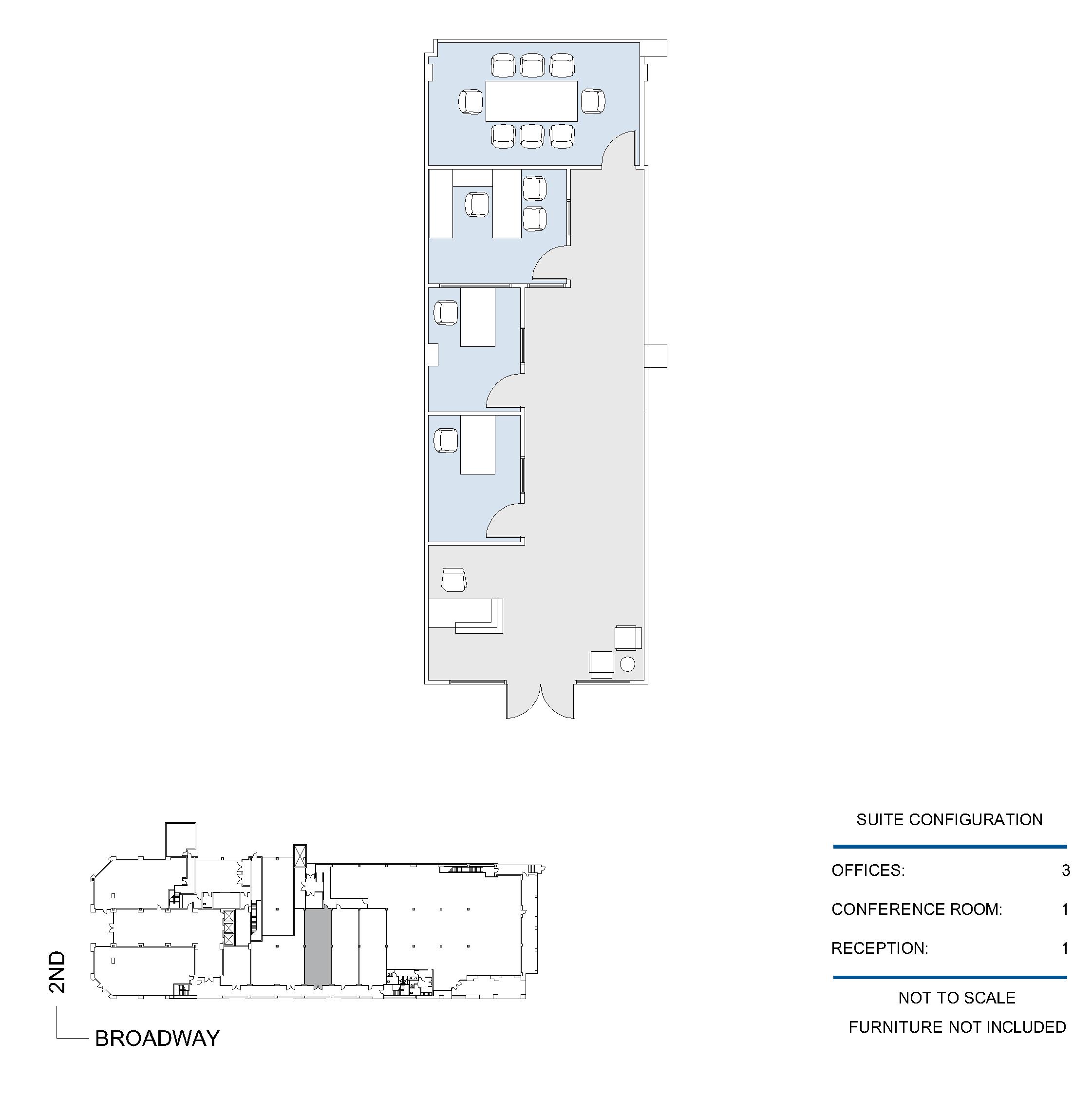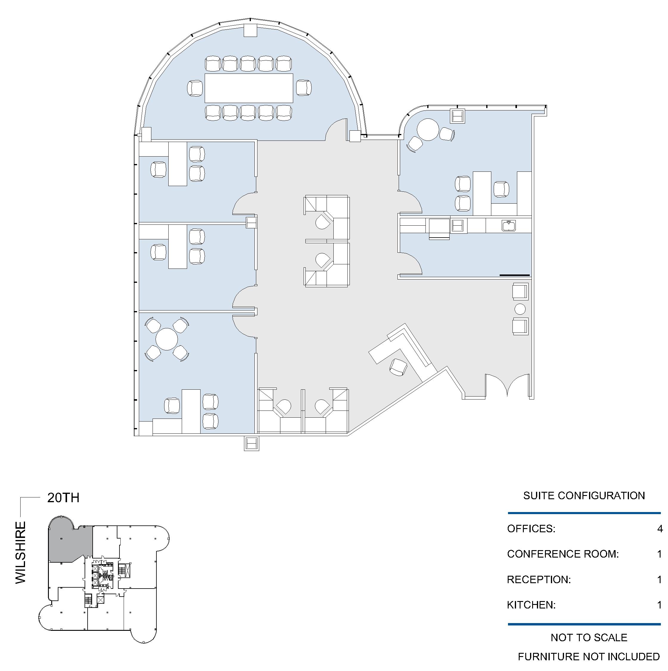 6 window offices, open work area, open kitchen, storage room, and reception area.