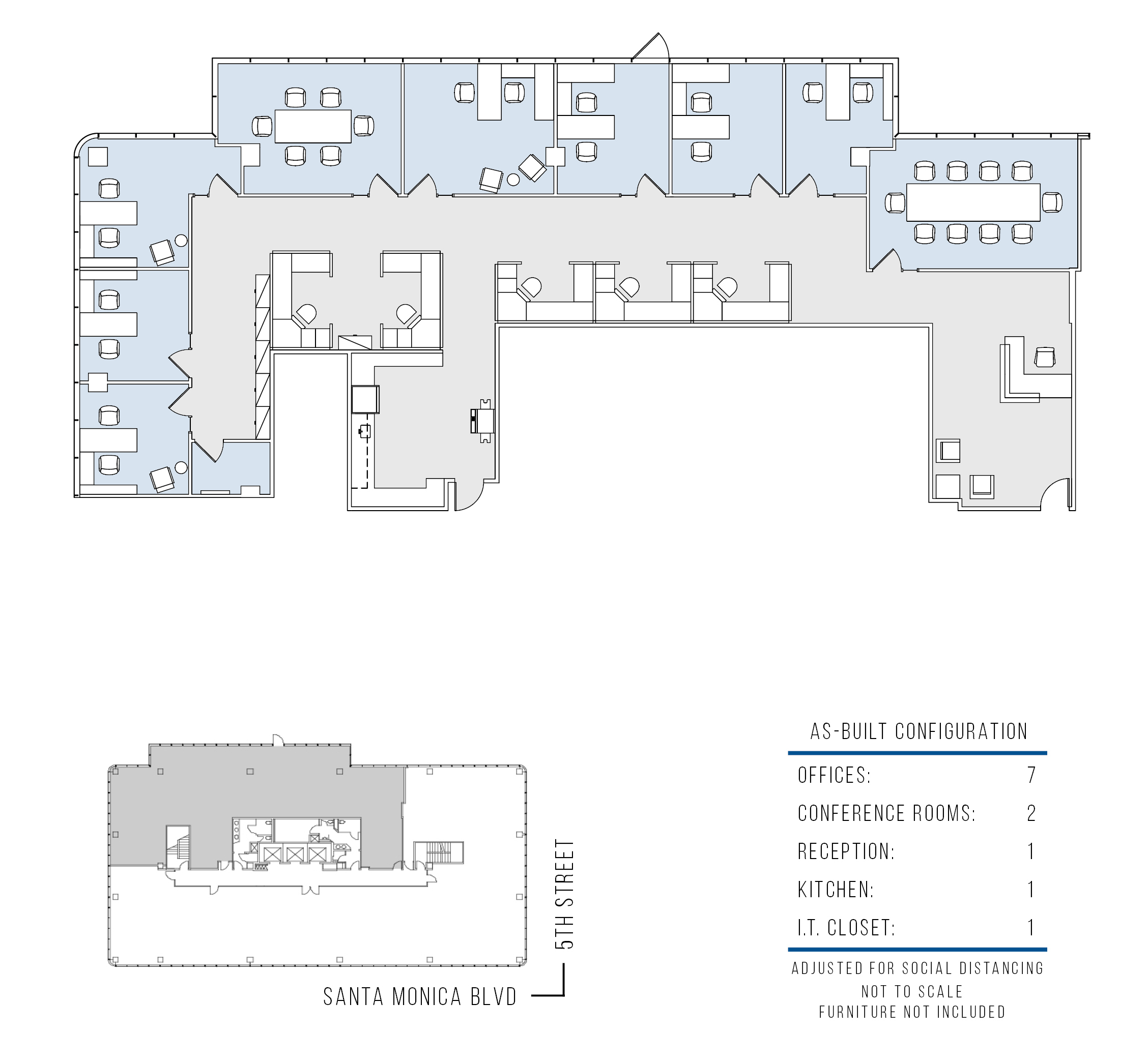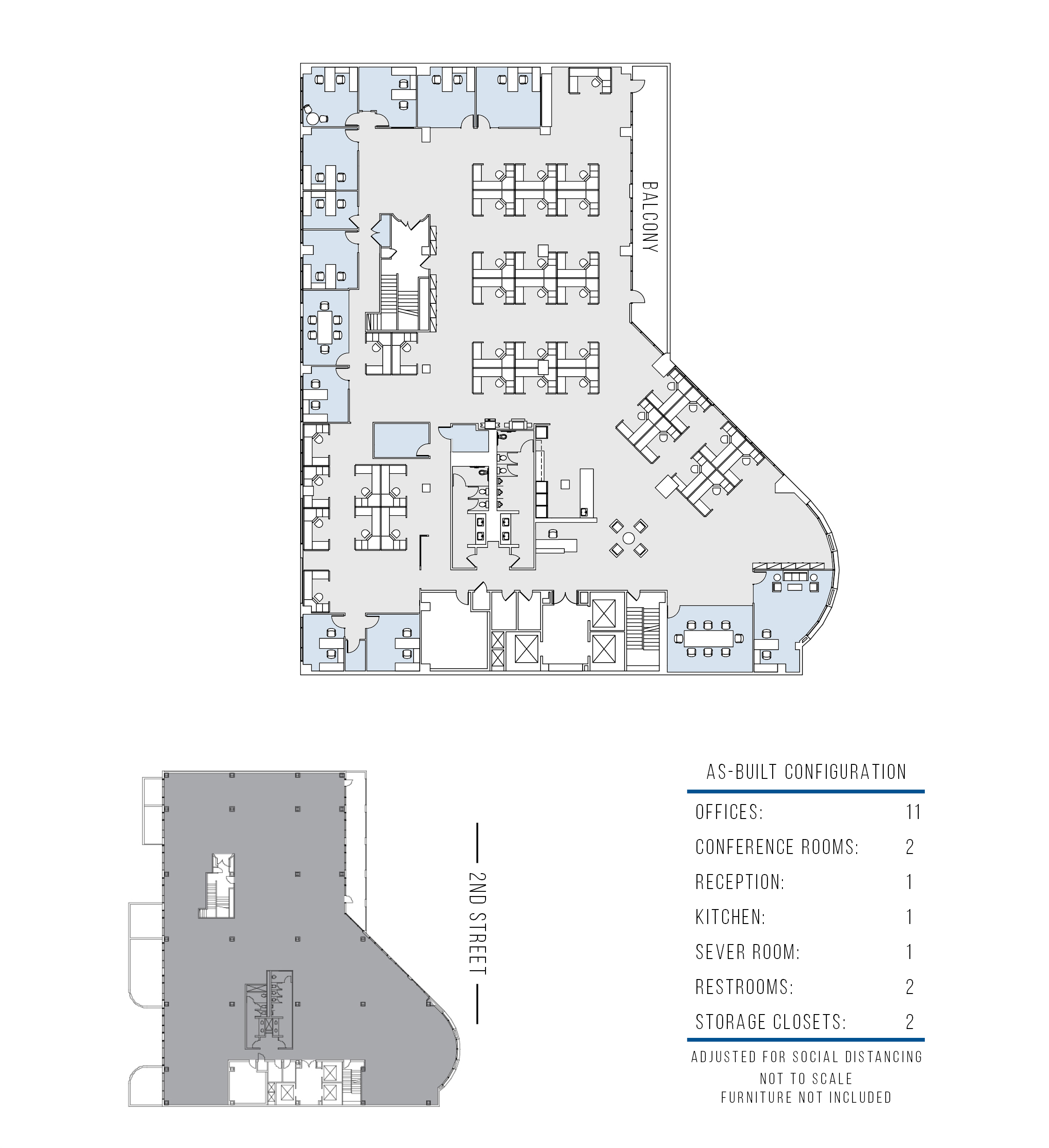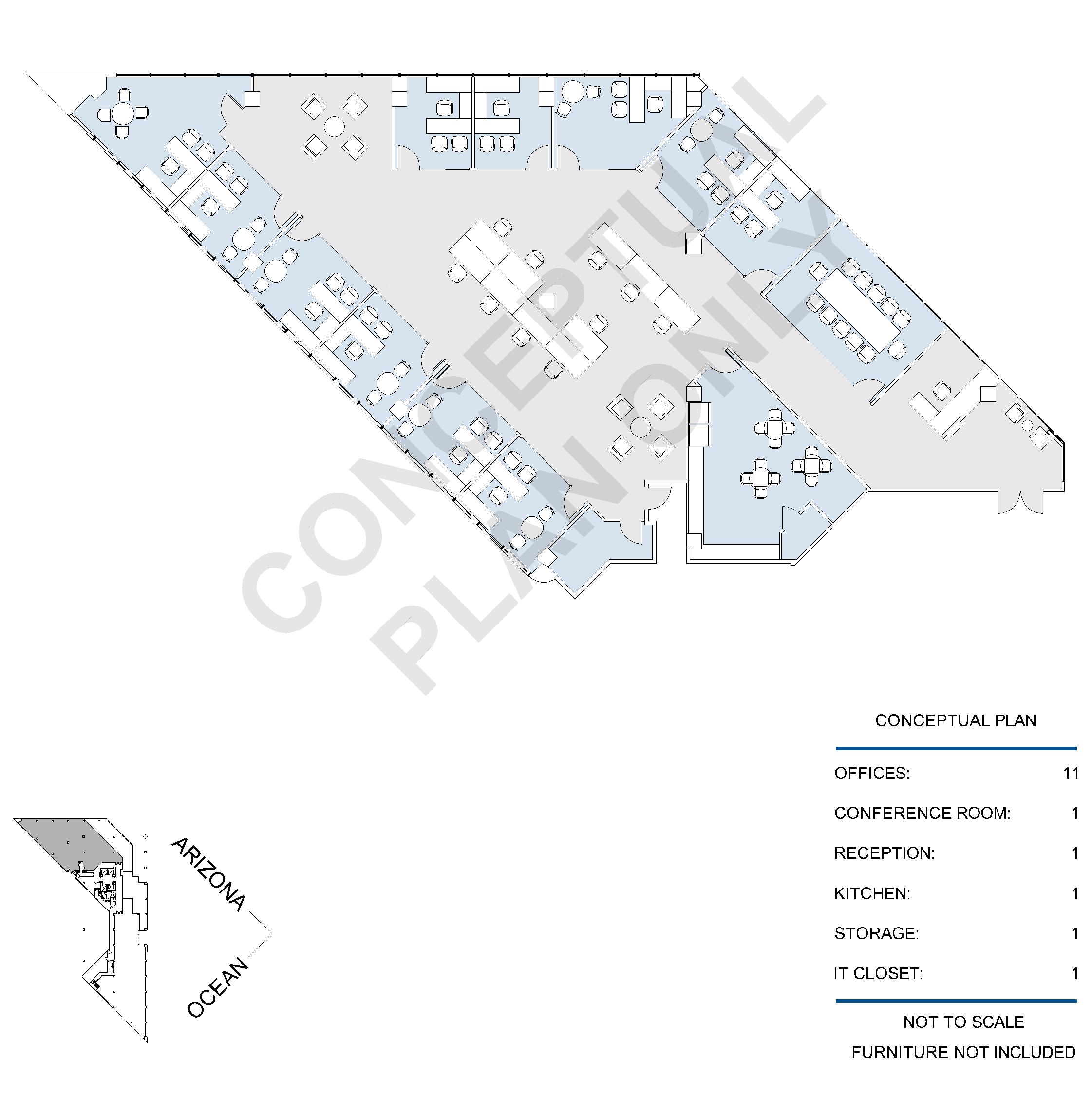 10 window offices, 1 interior office, large windowline conference room, kitchen, IT room, 2 storage rooms, and a reception area.