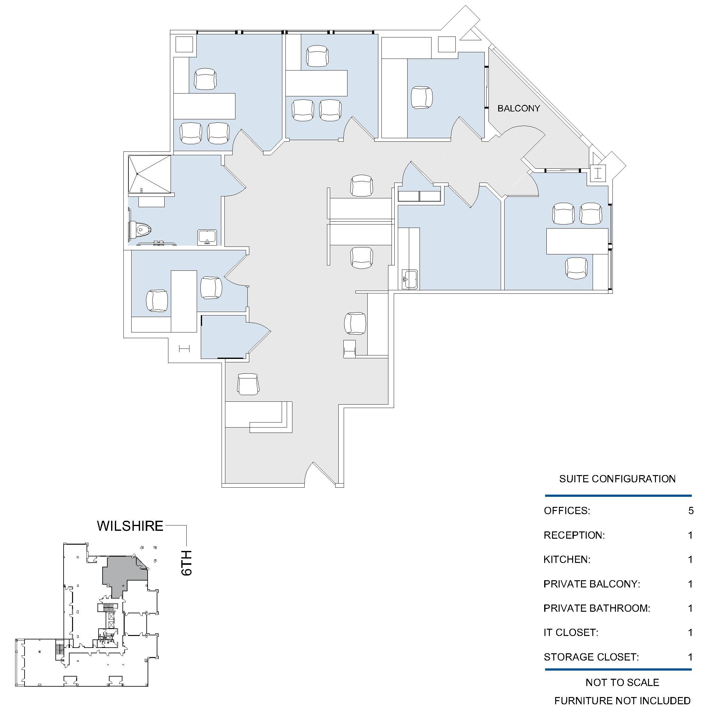 Move in ready with a private balcony! 4 window offices, 1 interior office, open work area, kitchen, private bathroom, IT closet, storage closet, and reception area.