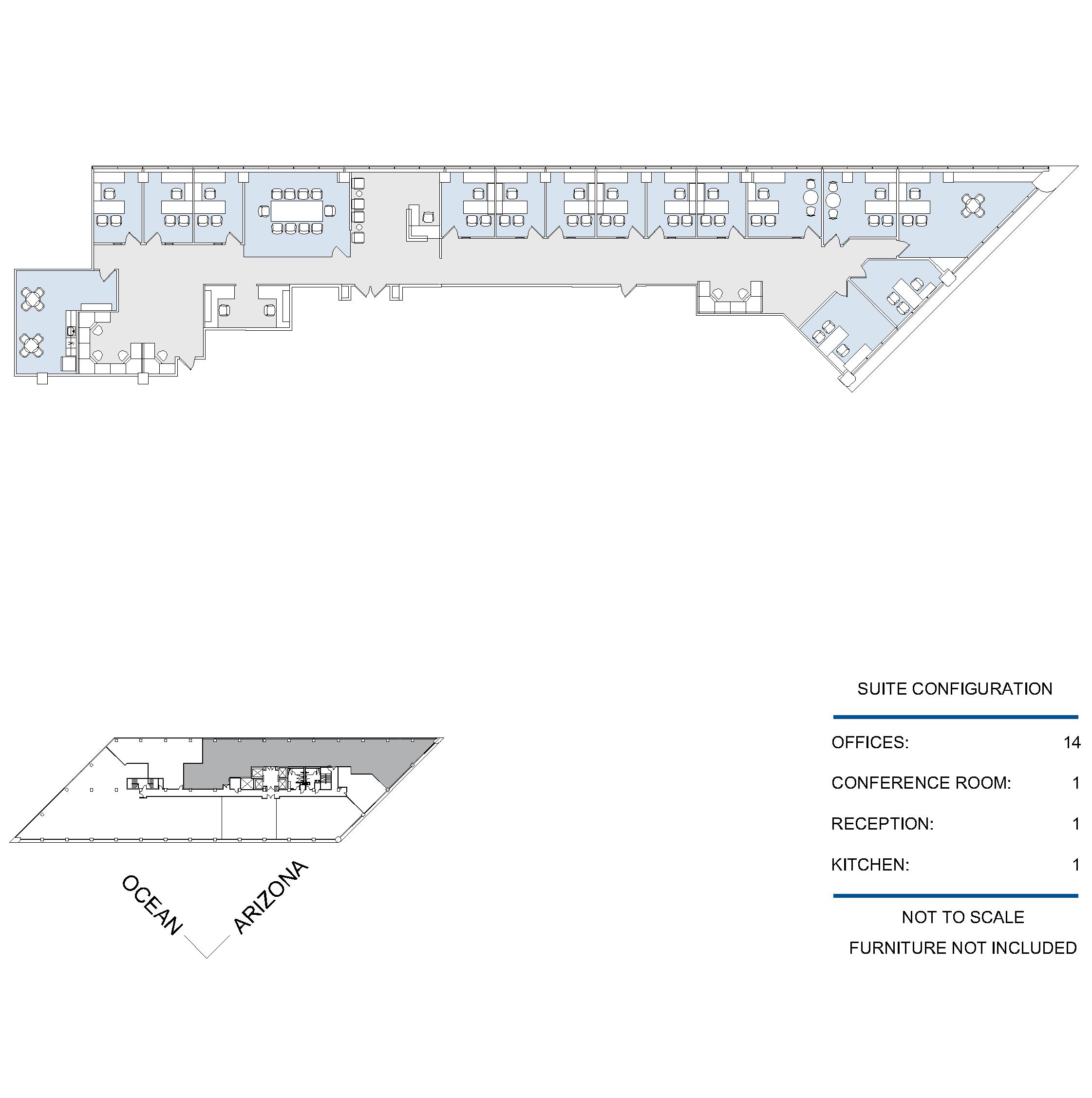 Natural light and Ocean Views! 4 window offices, 2 conference rooms, open work area, kitchen and reception area. Abundant light and extensive window-line around the entire suite with southerly views to the Pacific and downtown Santa Monica.