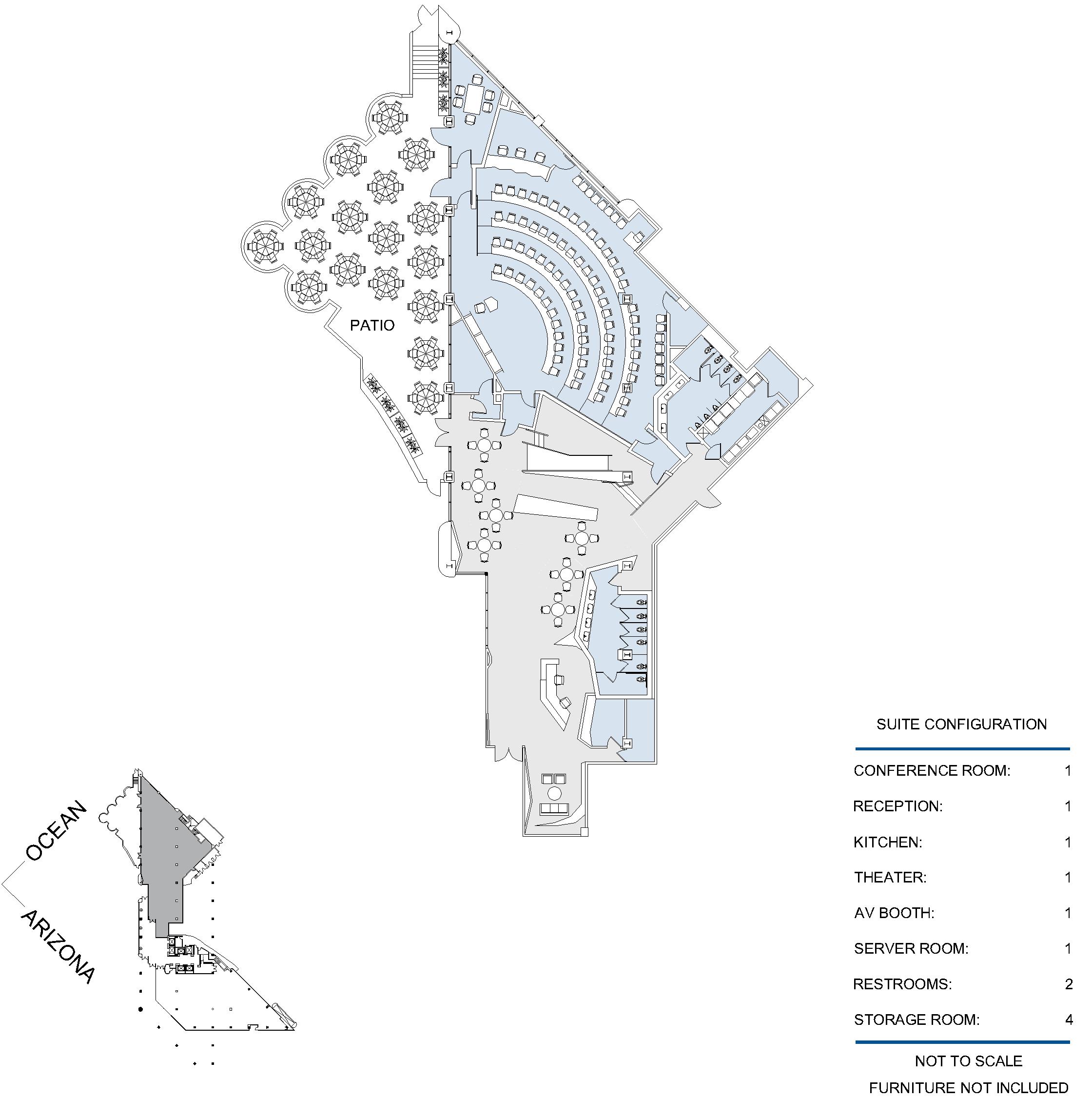 Exceptional ground floor suite features an expansive private patio with ocean views for coastal appeal! Currently built out as a conference center, the flexible layout offers a unique opportunity for