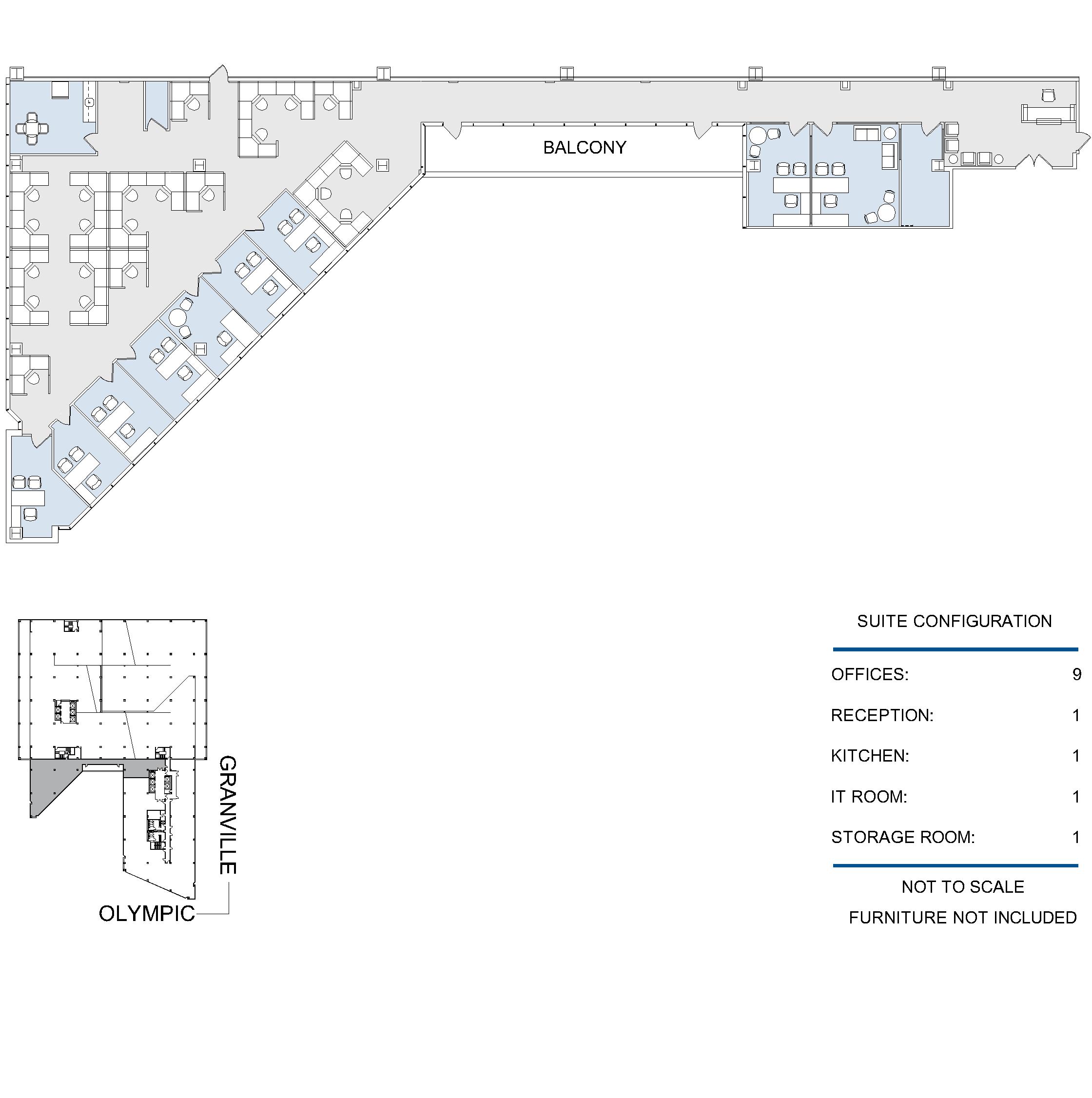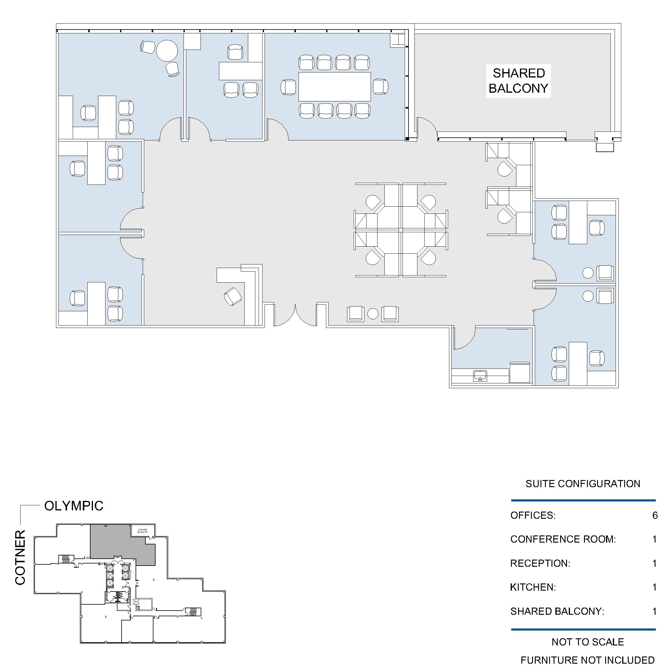 Corner Suite with 3 Private Balconies! Move-in ready, 5 window offices, windowline conference room, open work areas, storage room, and reception area.