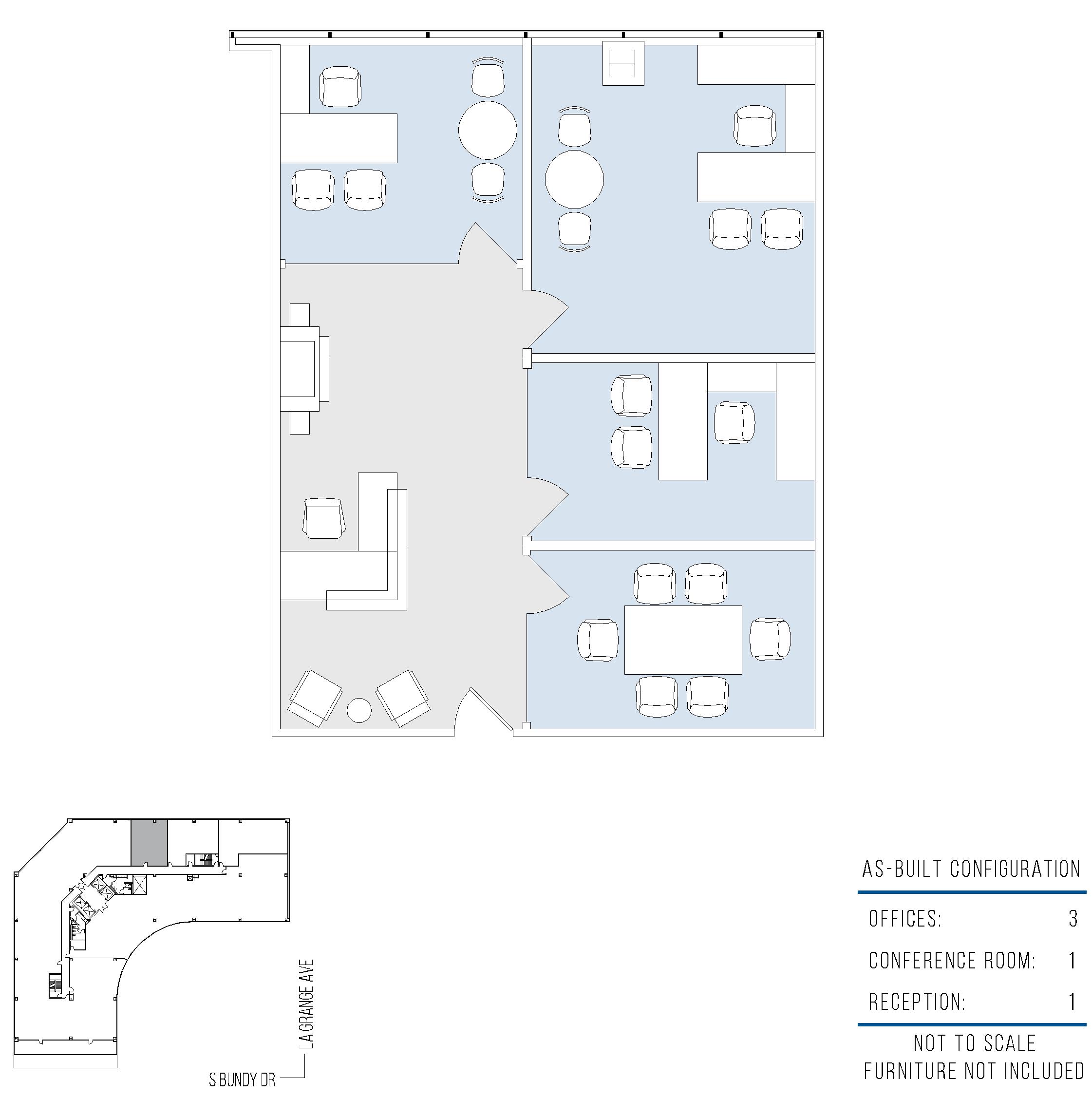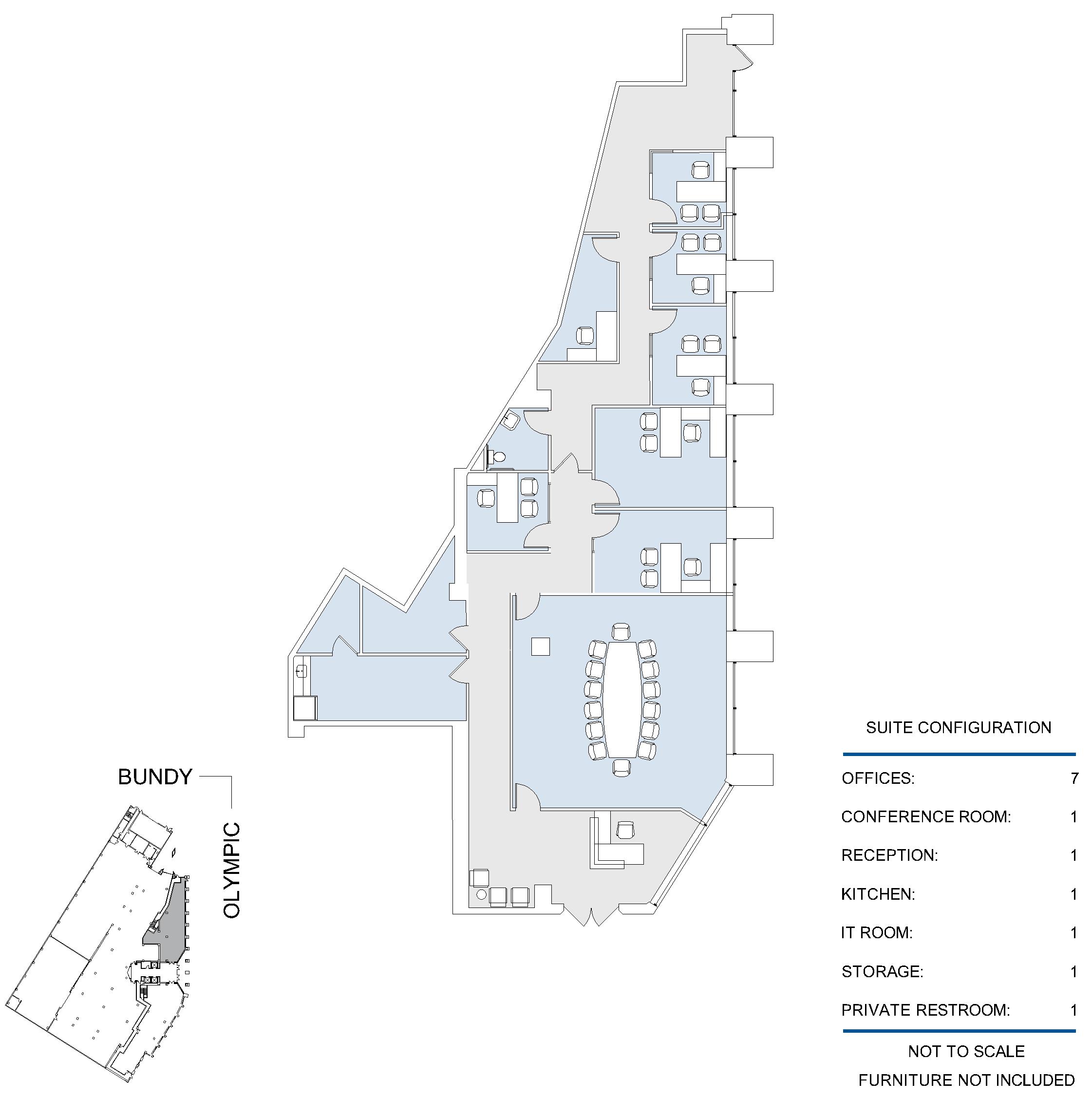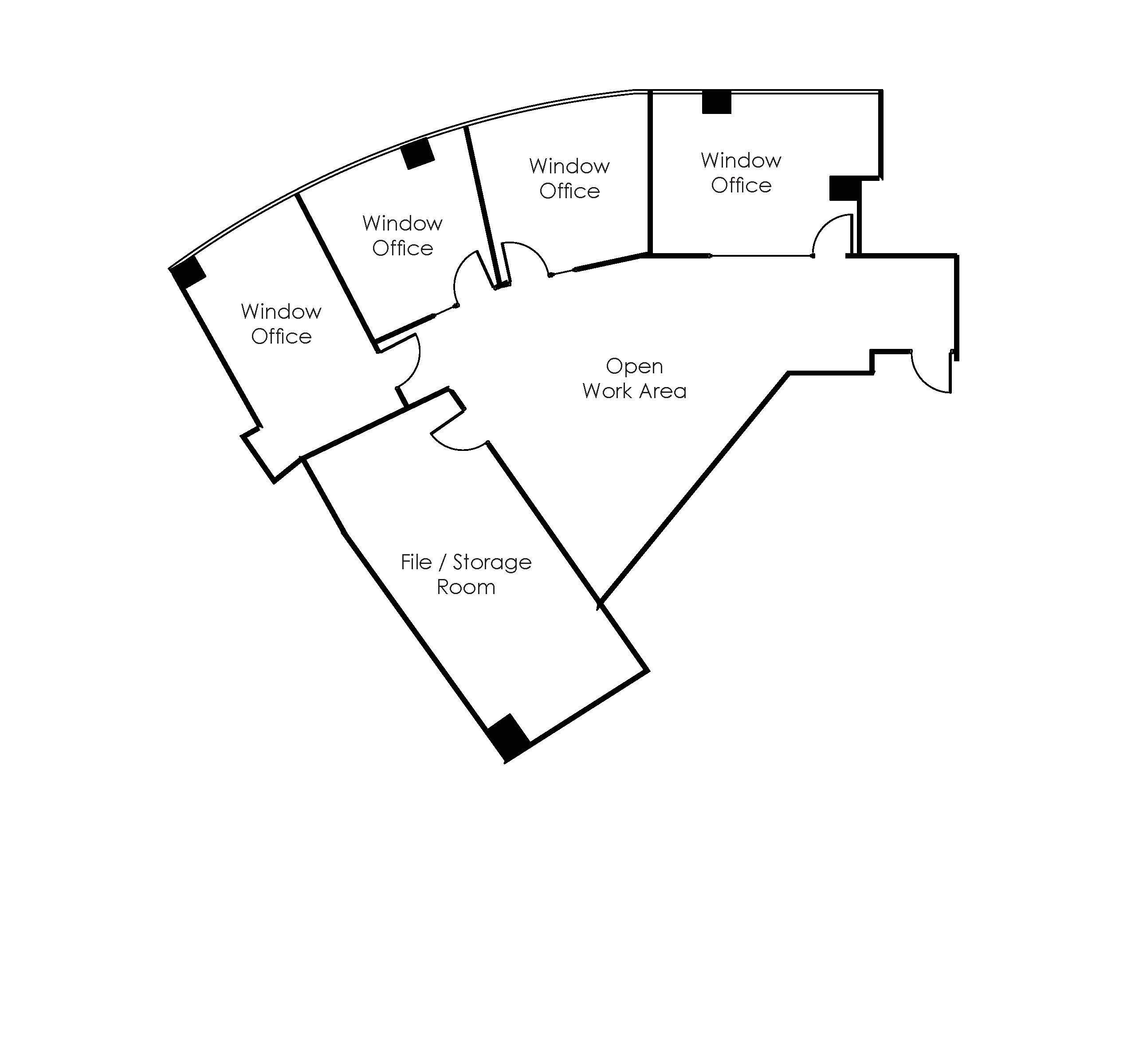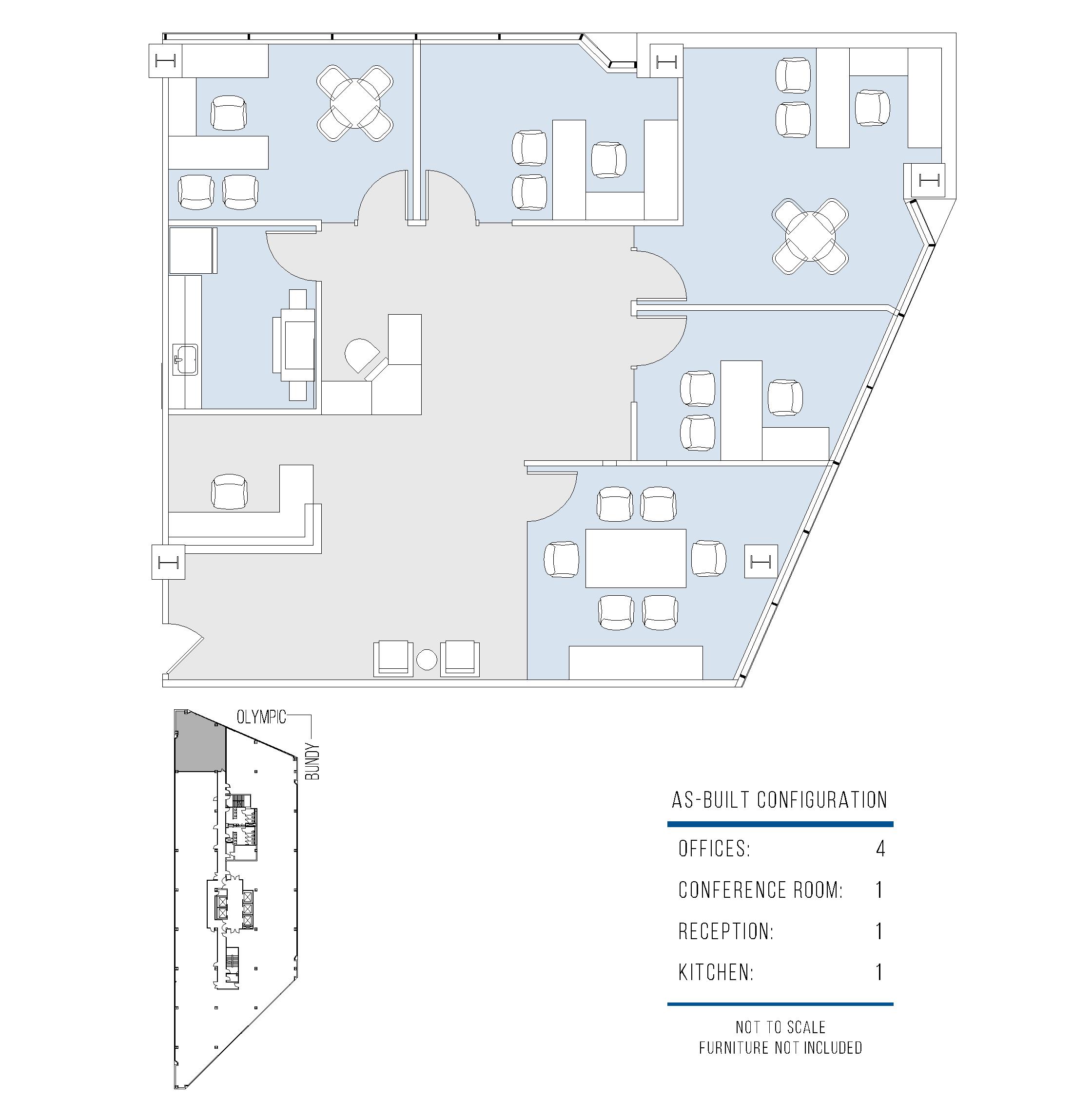 3 window offices, 2 interior offices, windowline conference room, kitchen, and reception area.