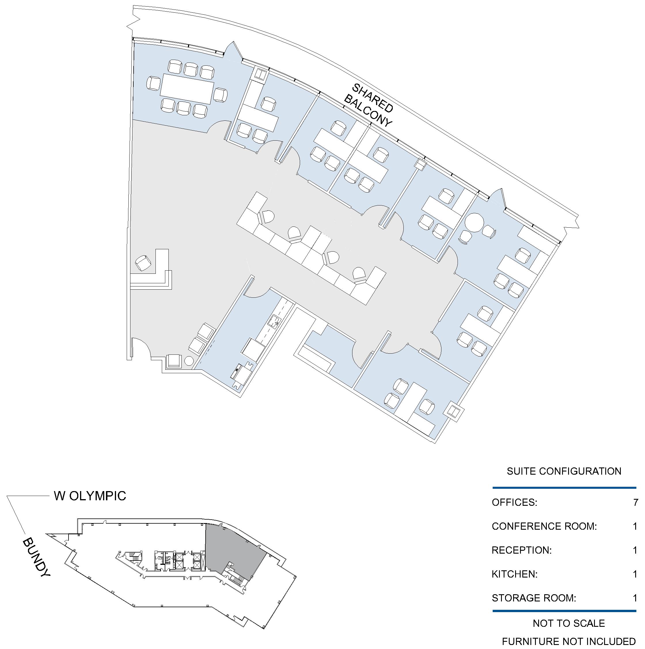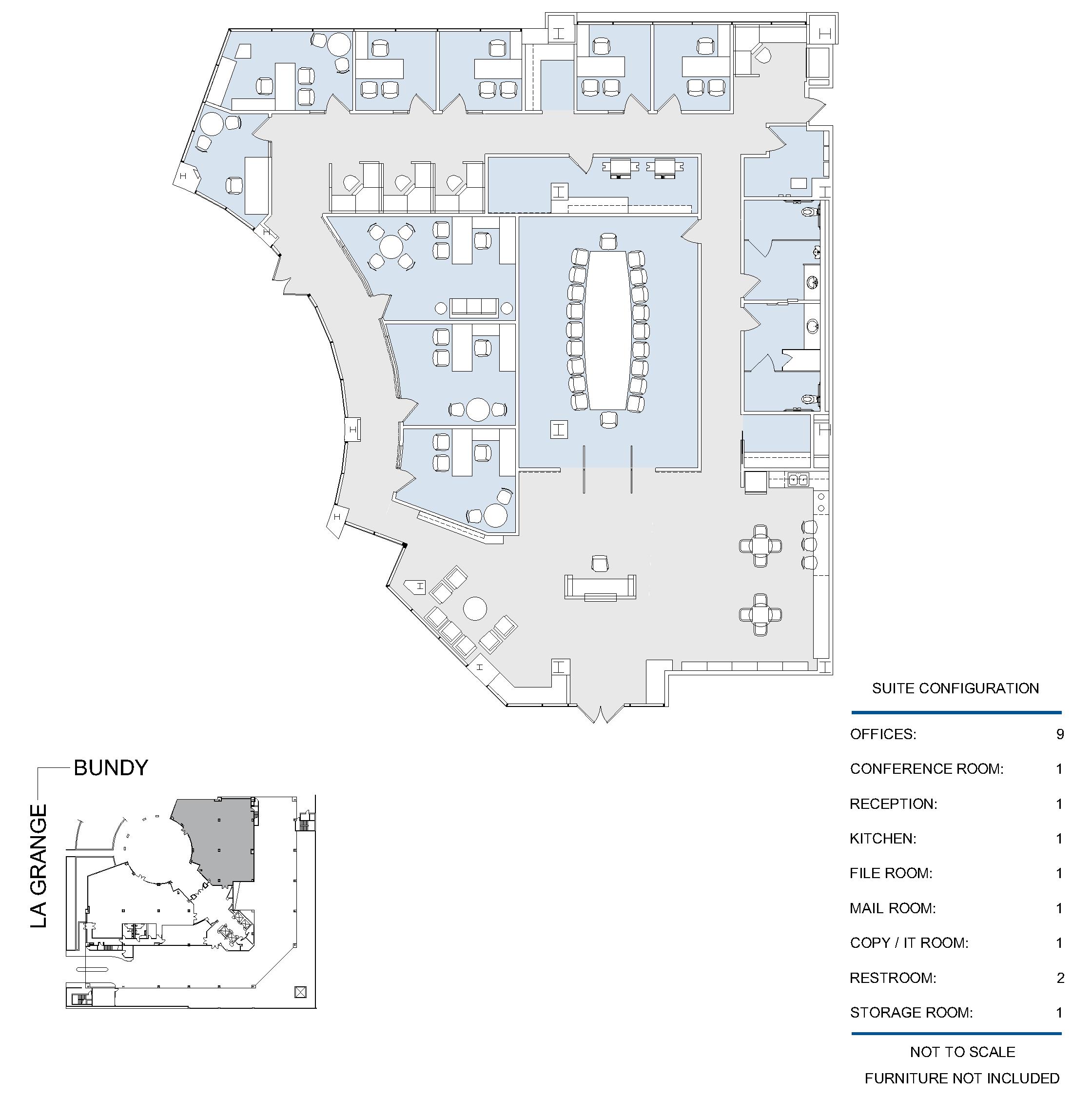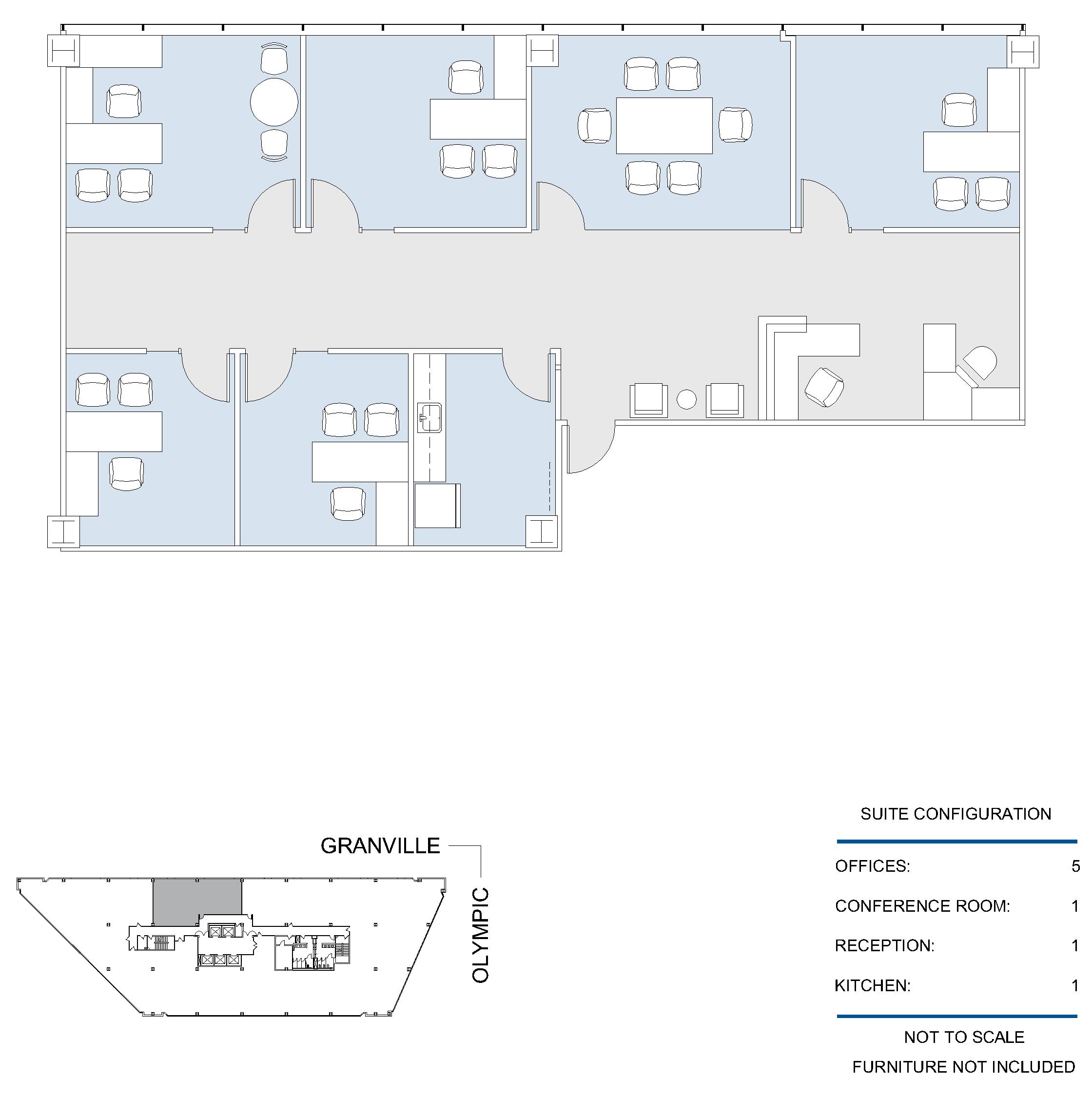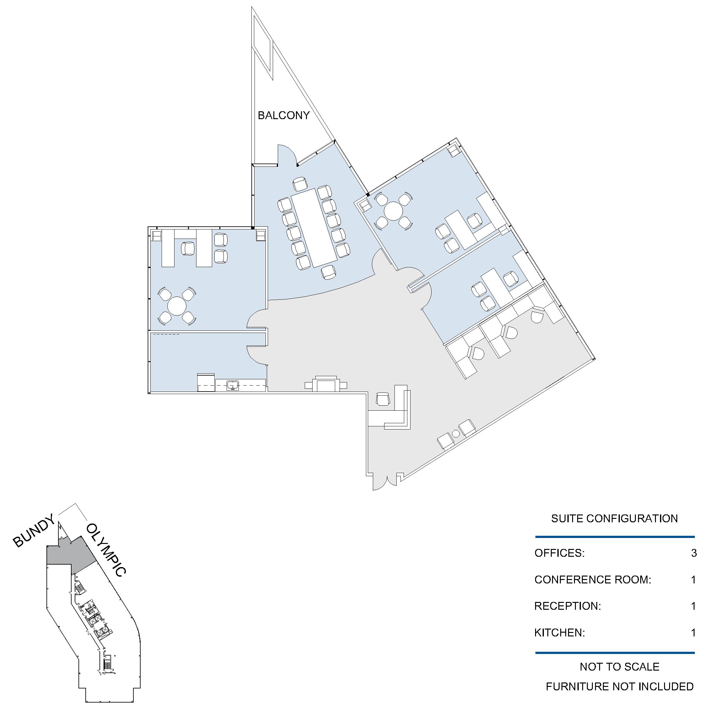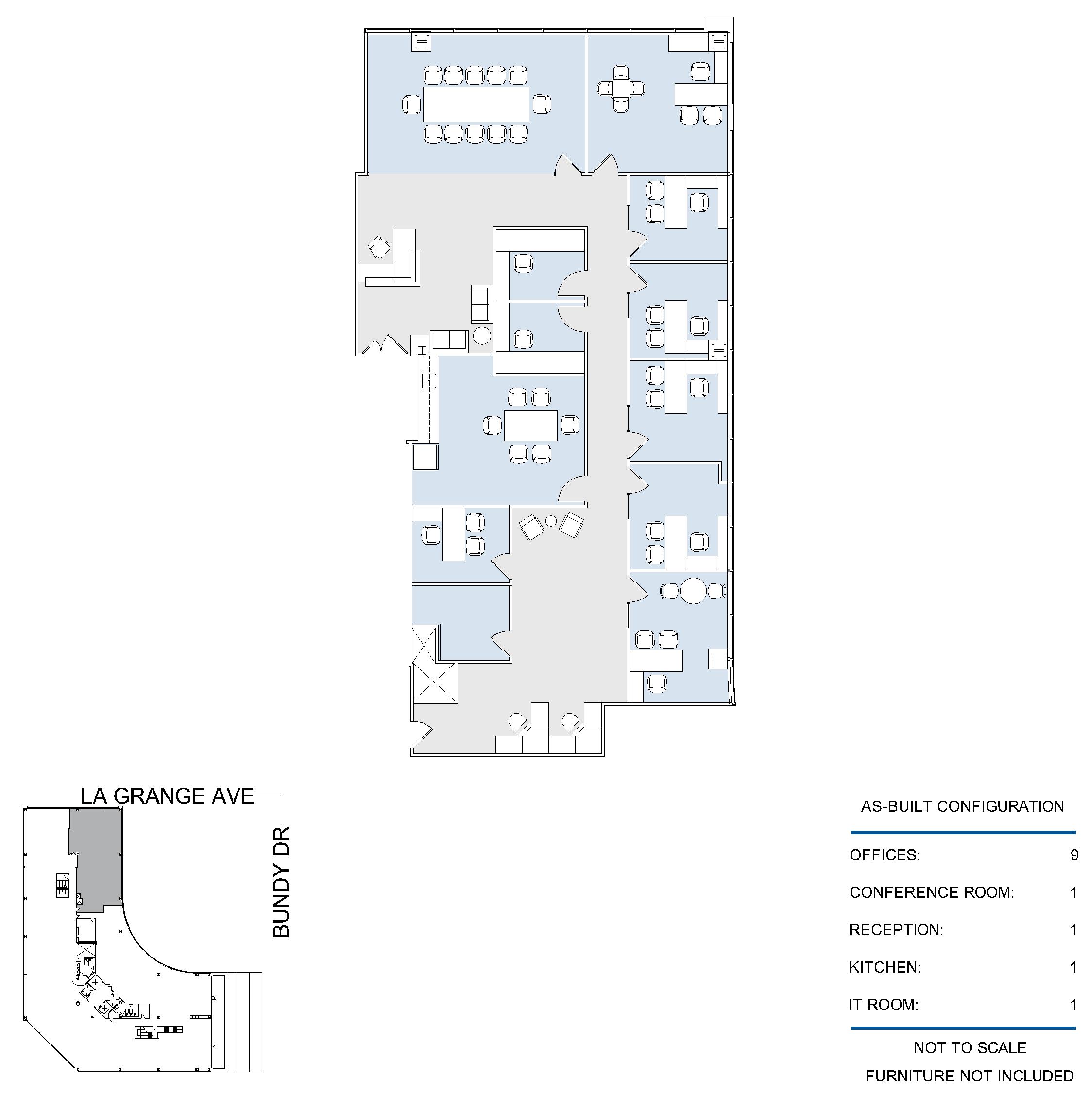 3 window offices, 2 interior offices, windowline conference room, kitchen, and reception area.