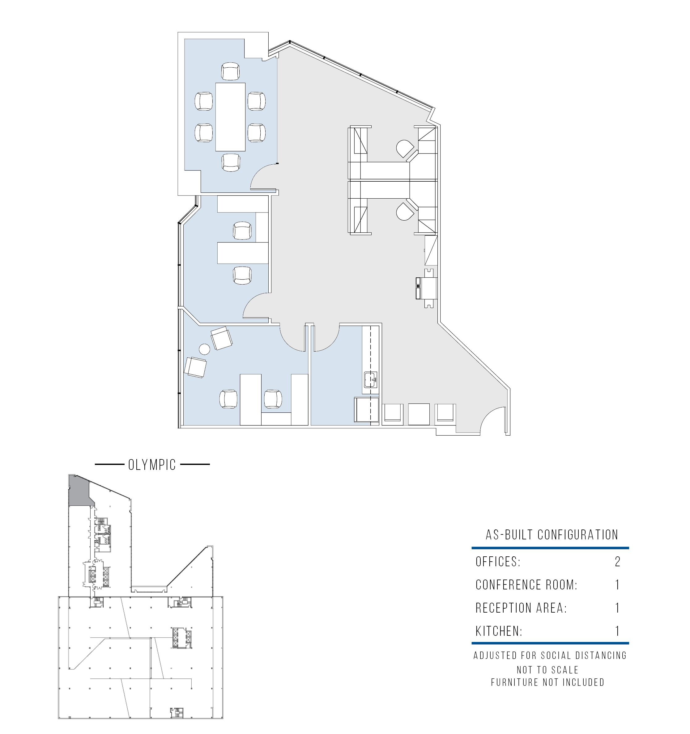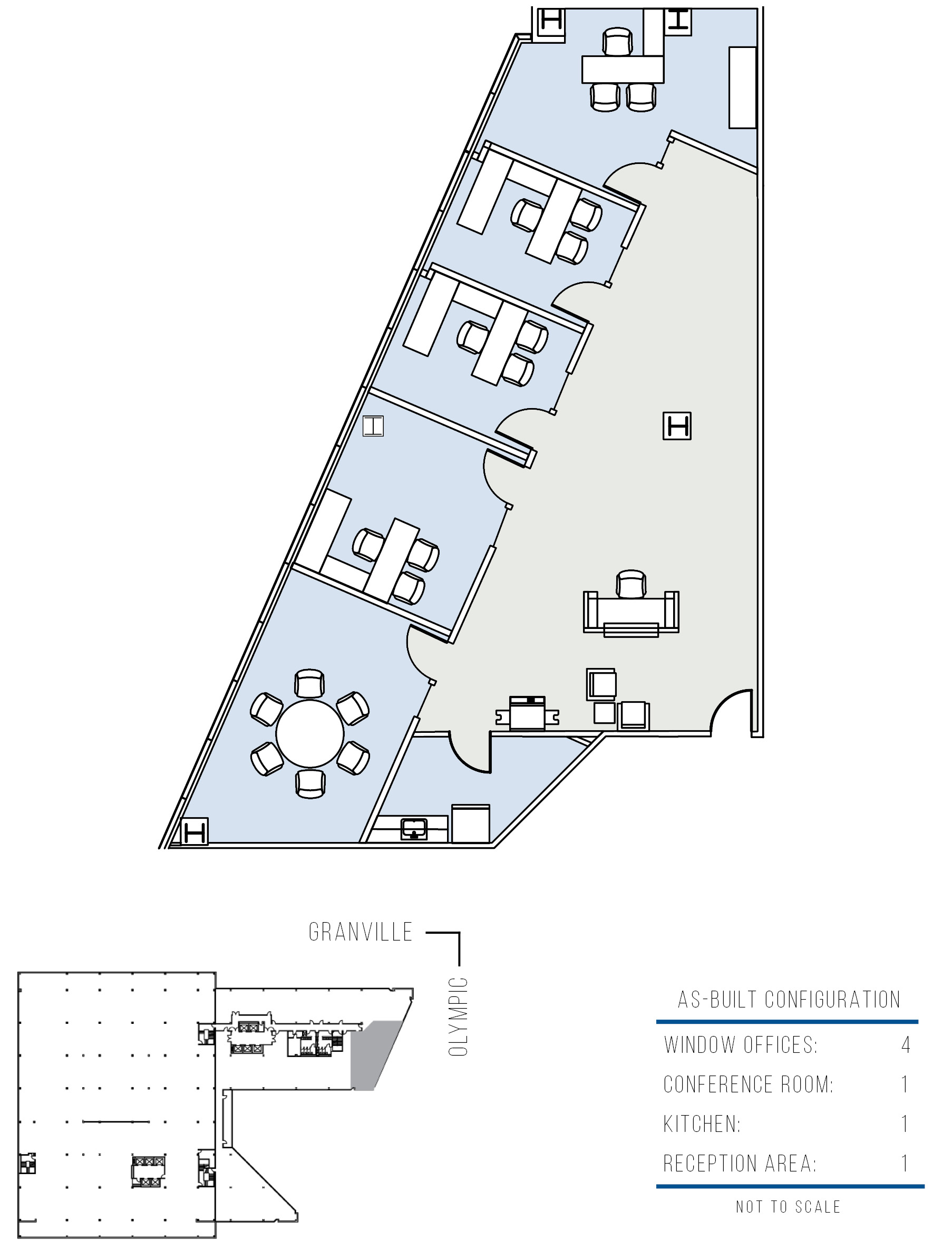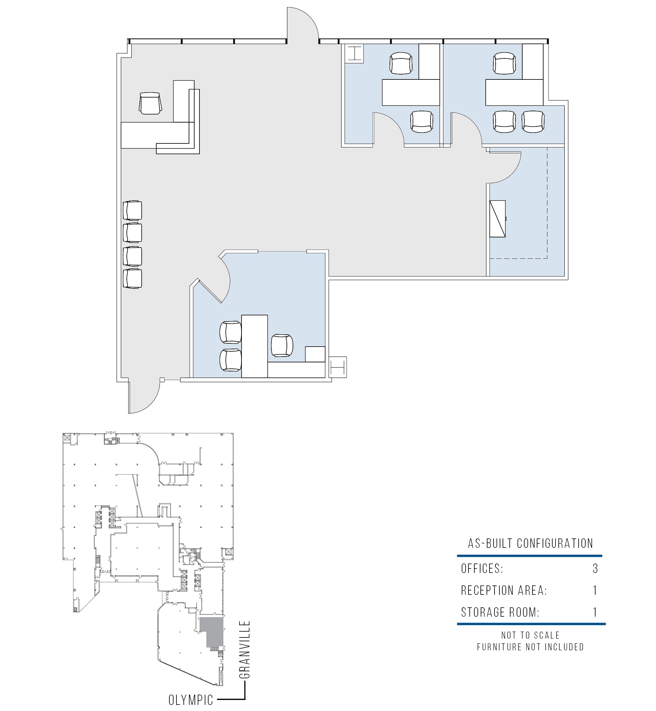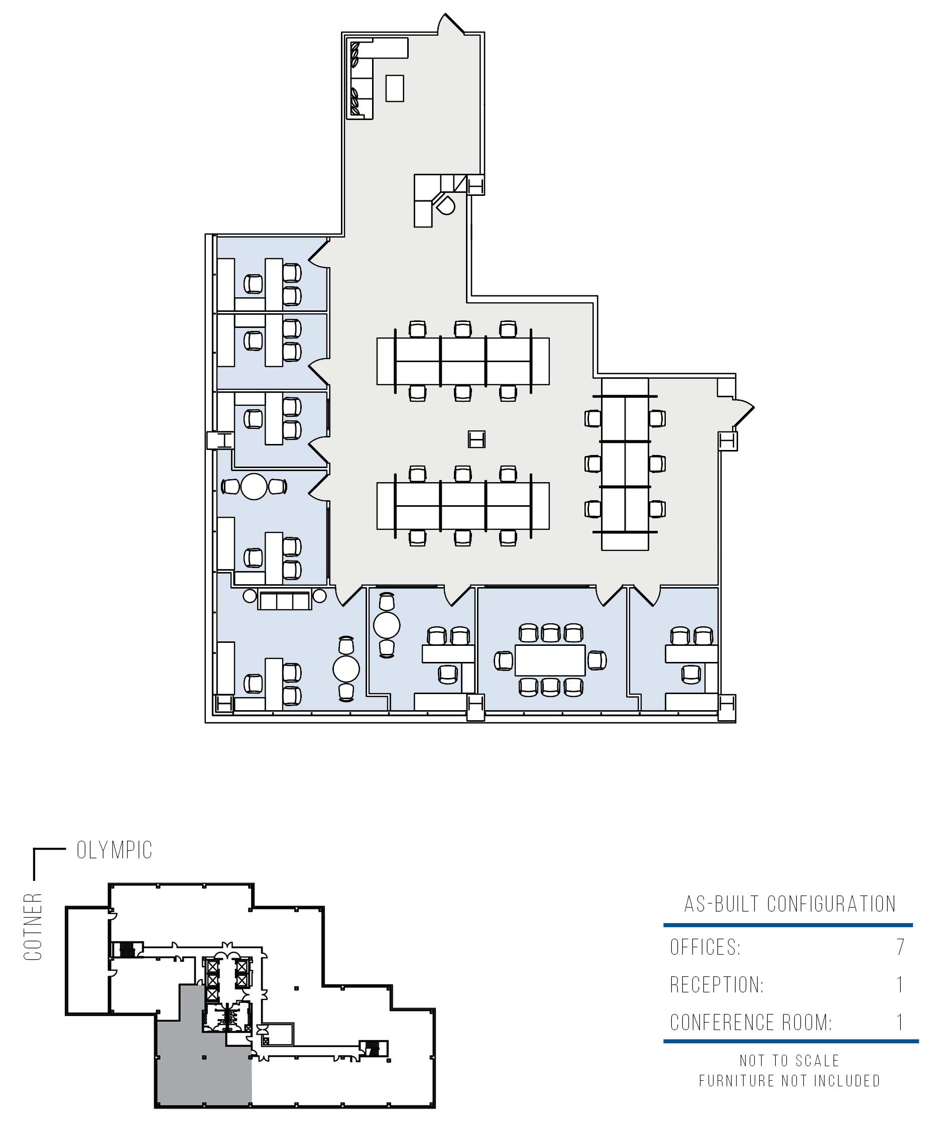 3 window offices, 2 interior offices, windowline conference room, kitchen, and reception area.