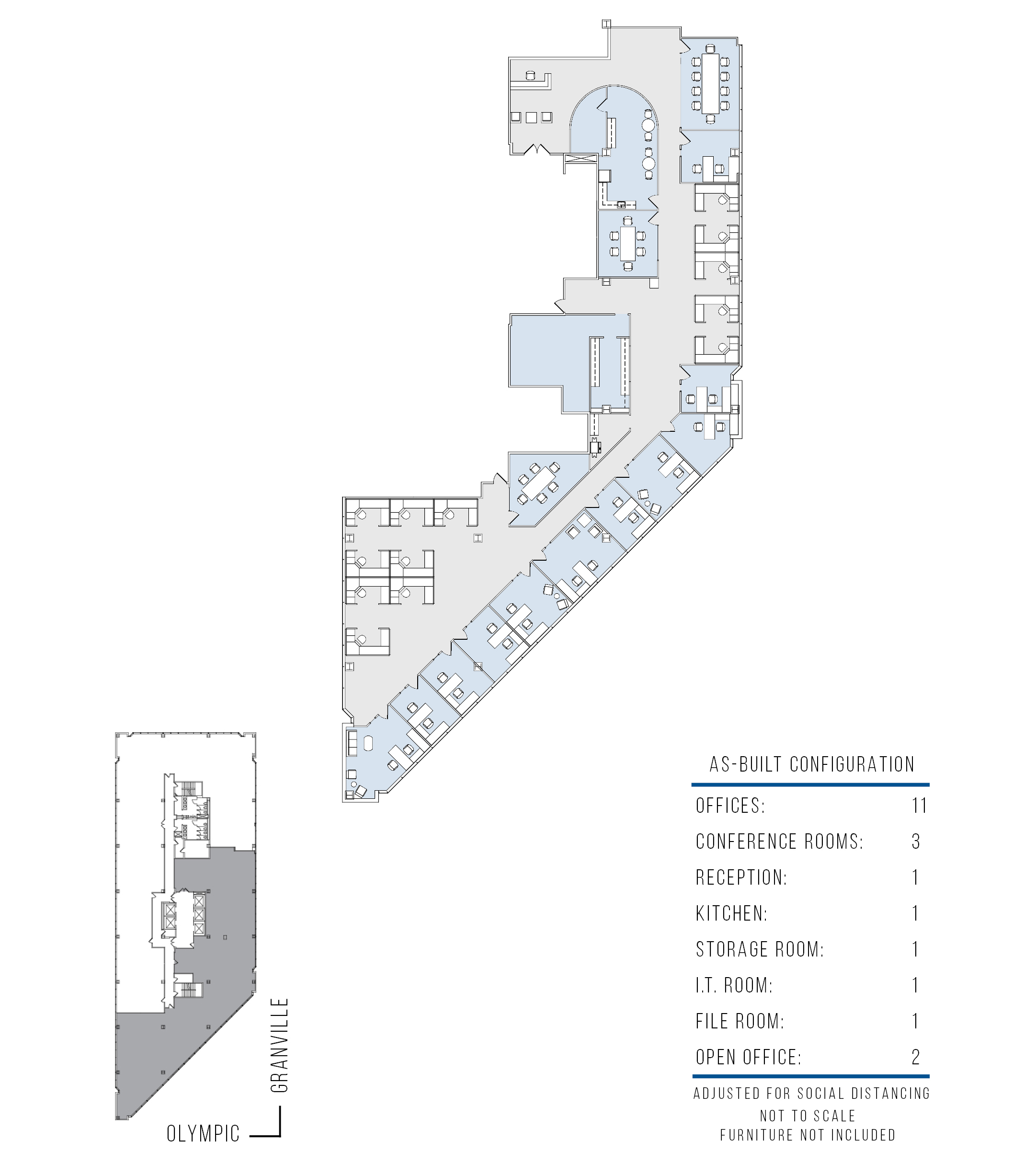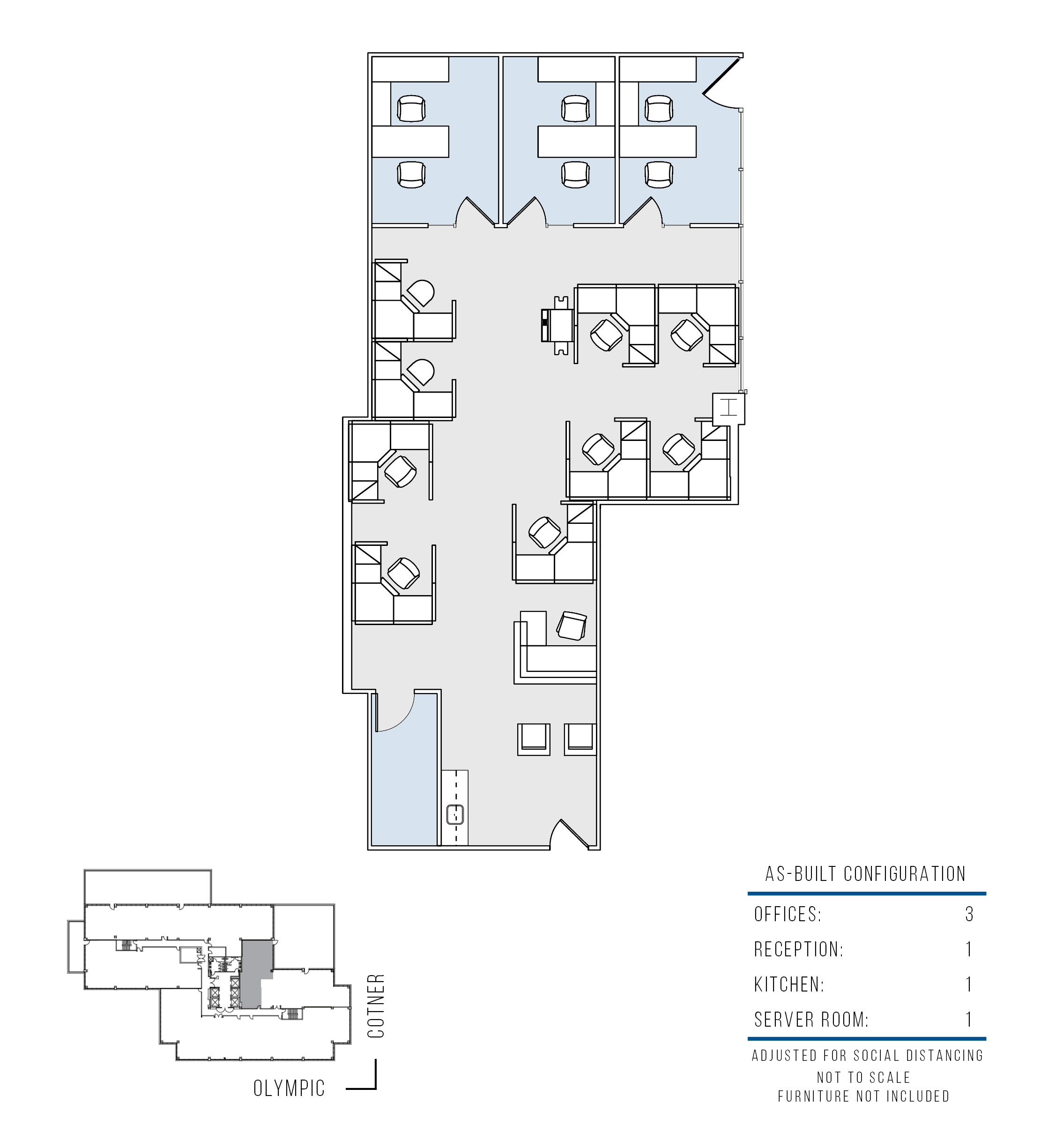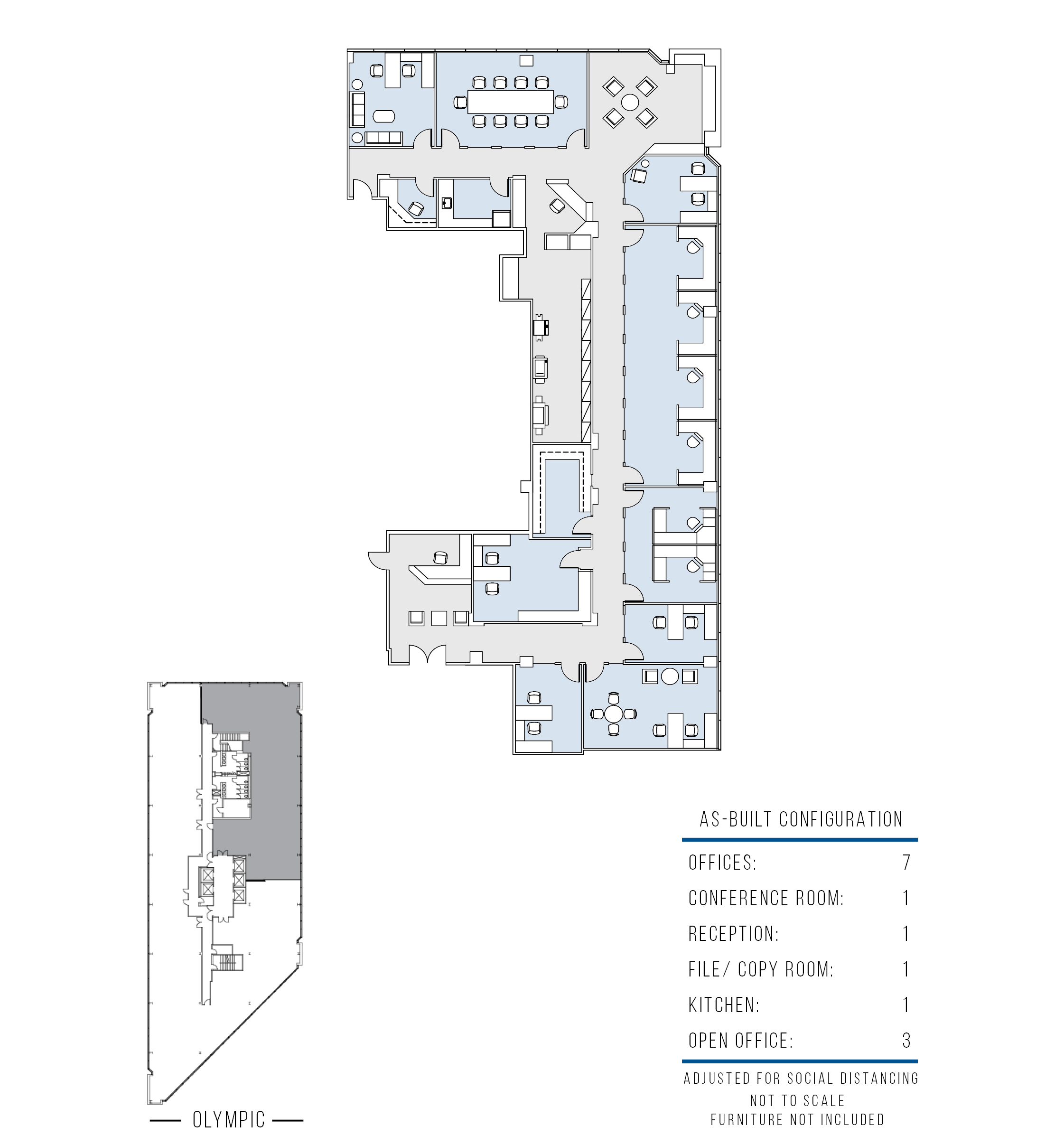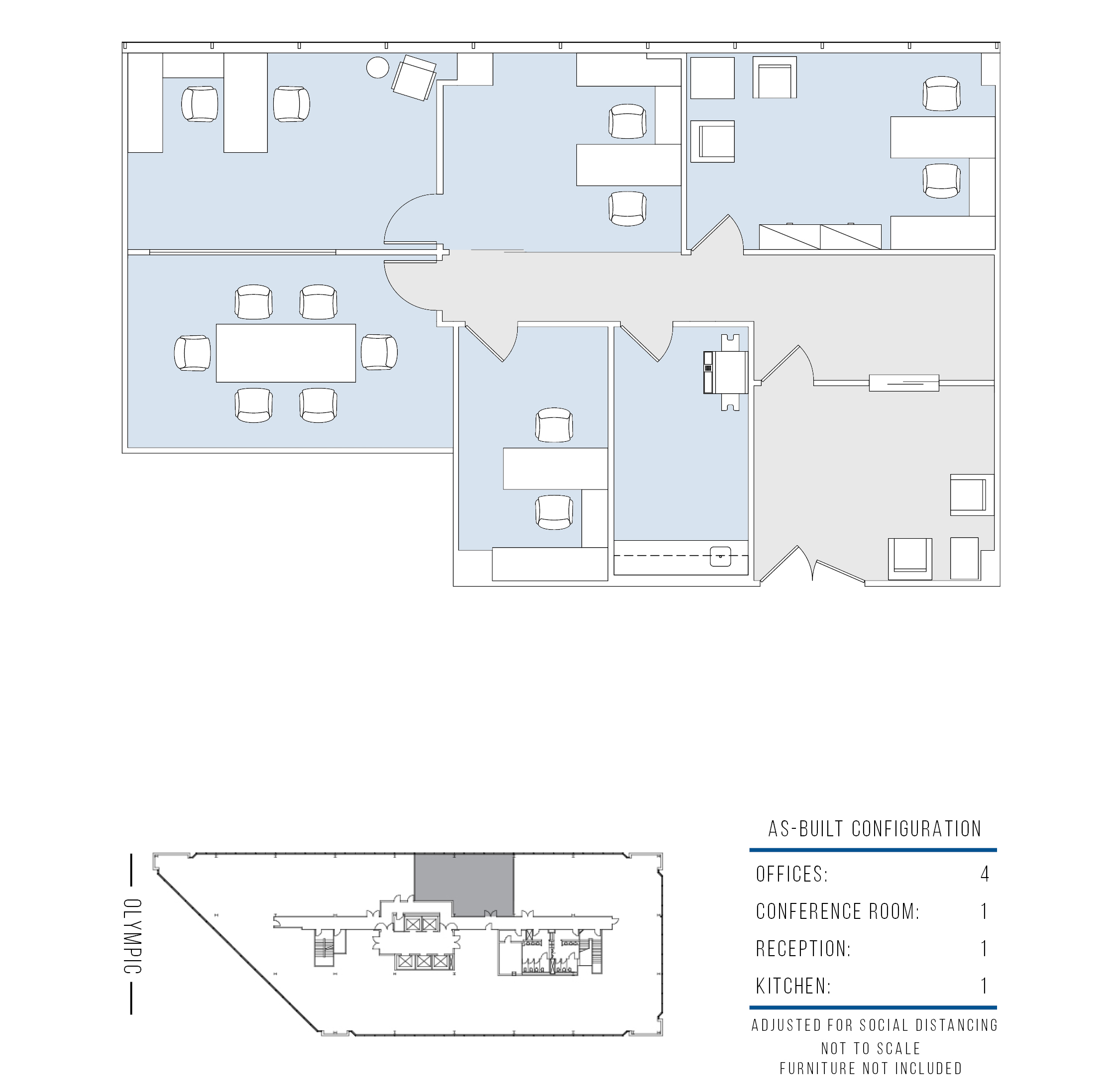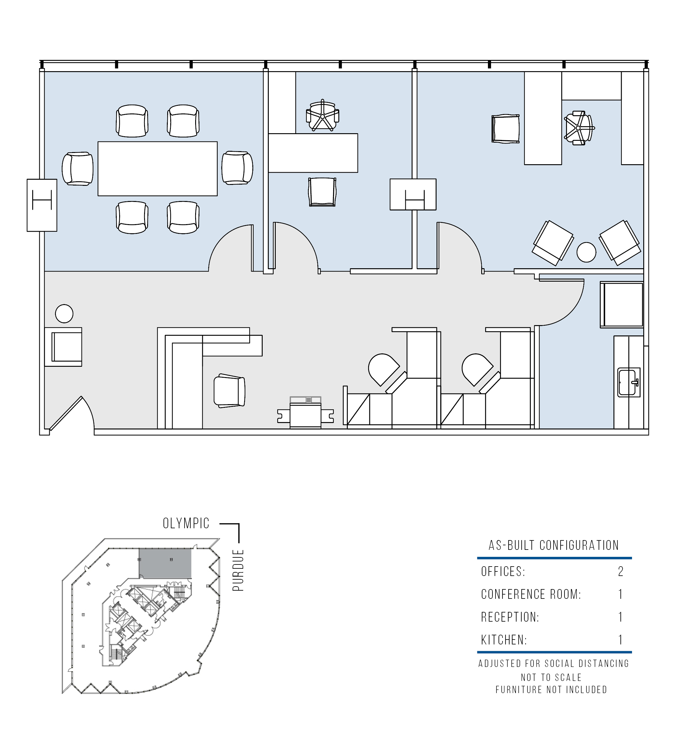 3 window offices, 2 interior offices, windowline conference room, kitchen, and reception area.