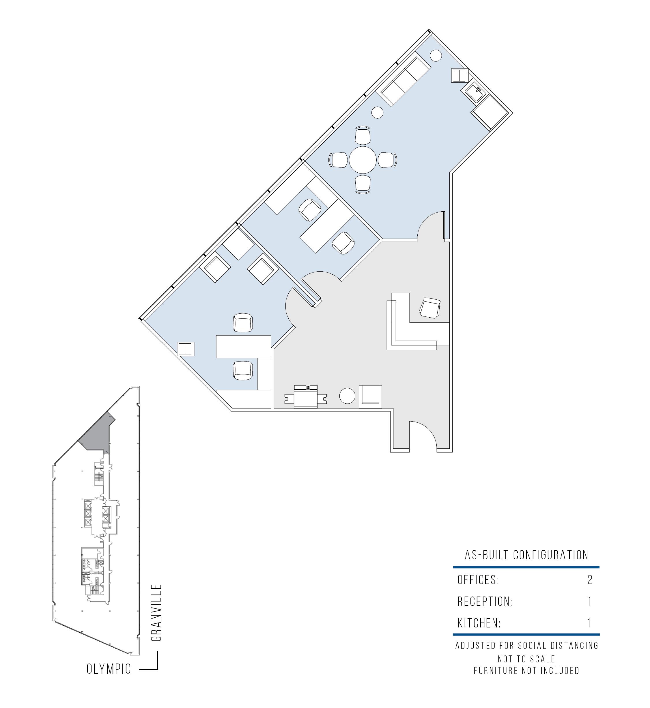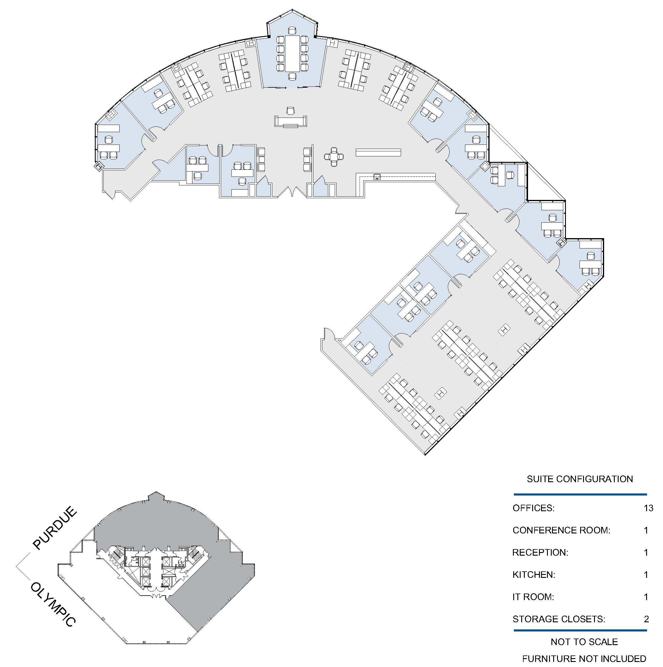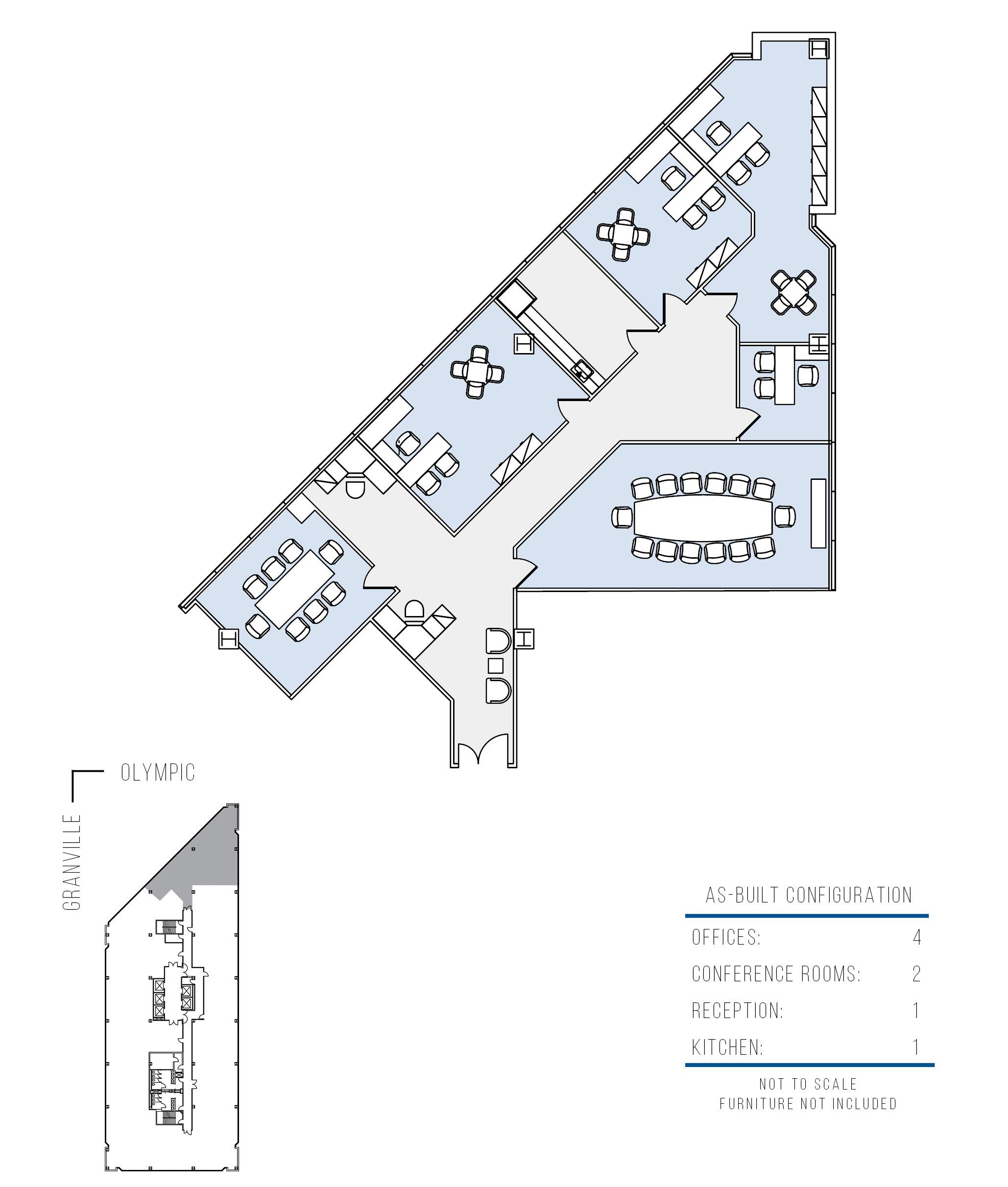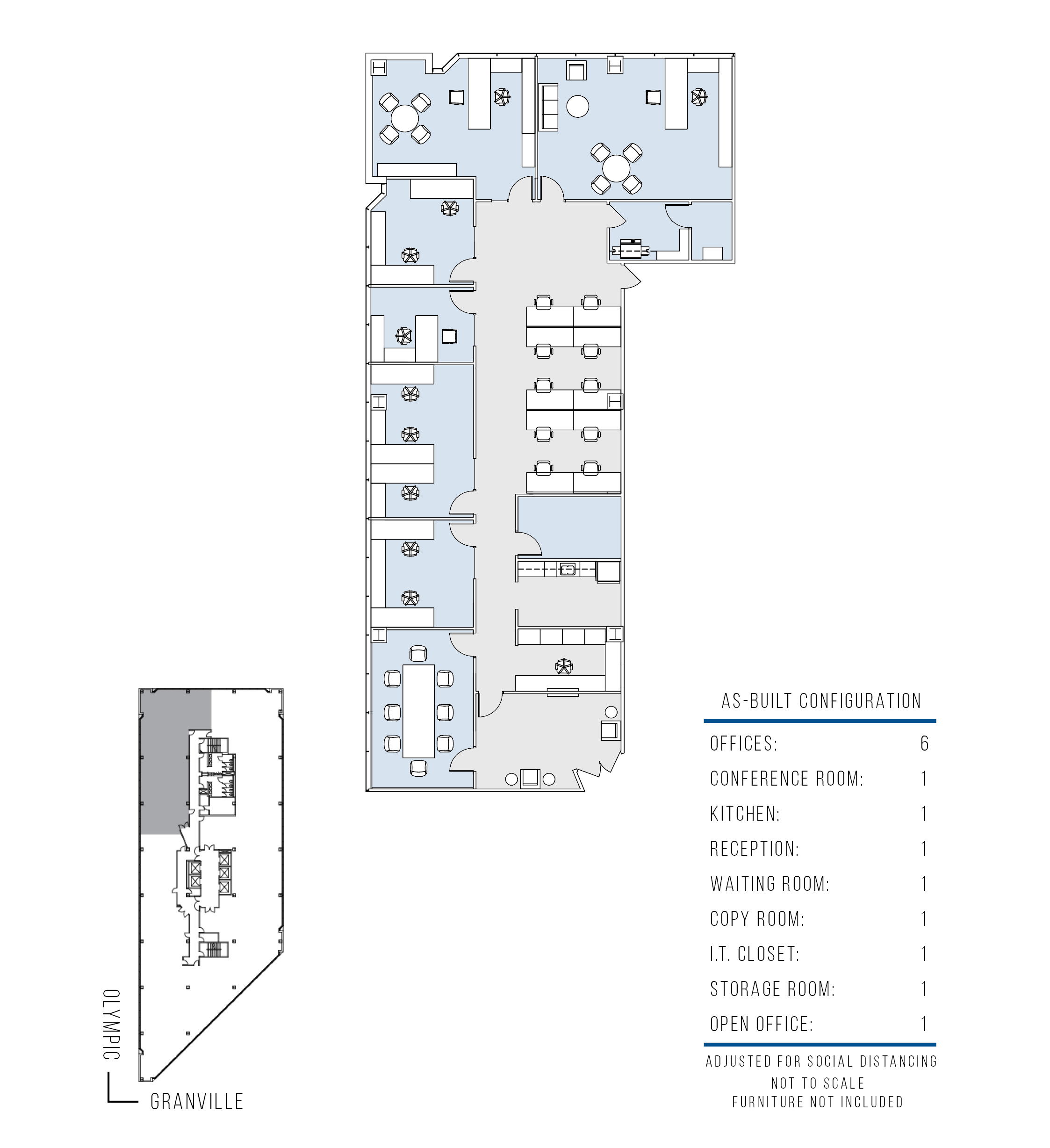 3 window offices, 2 interior offices, windowline conference room, kitchen, and reception area.