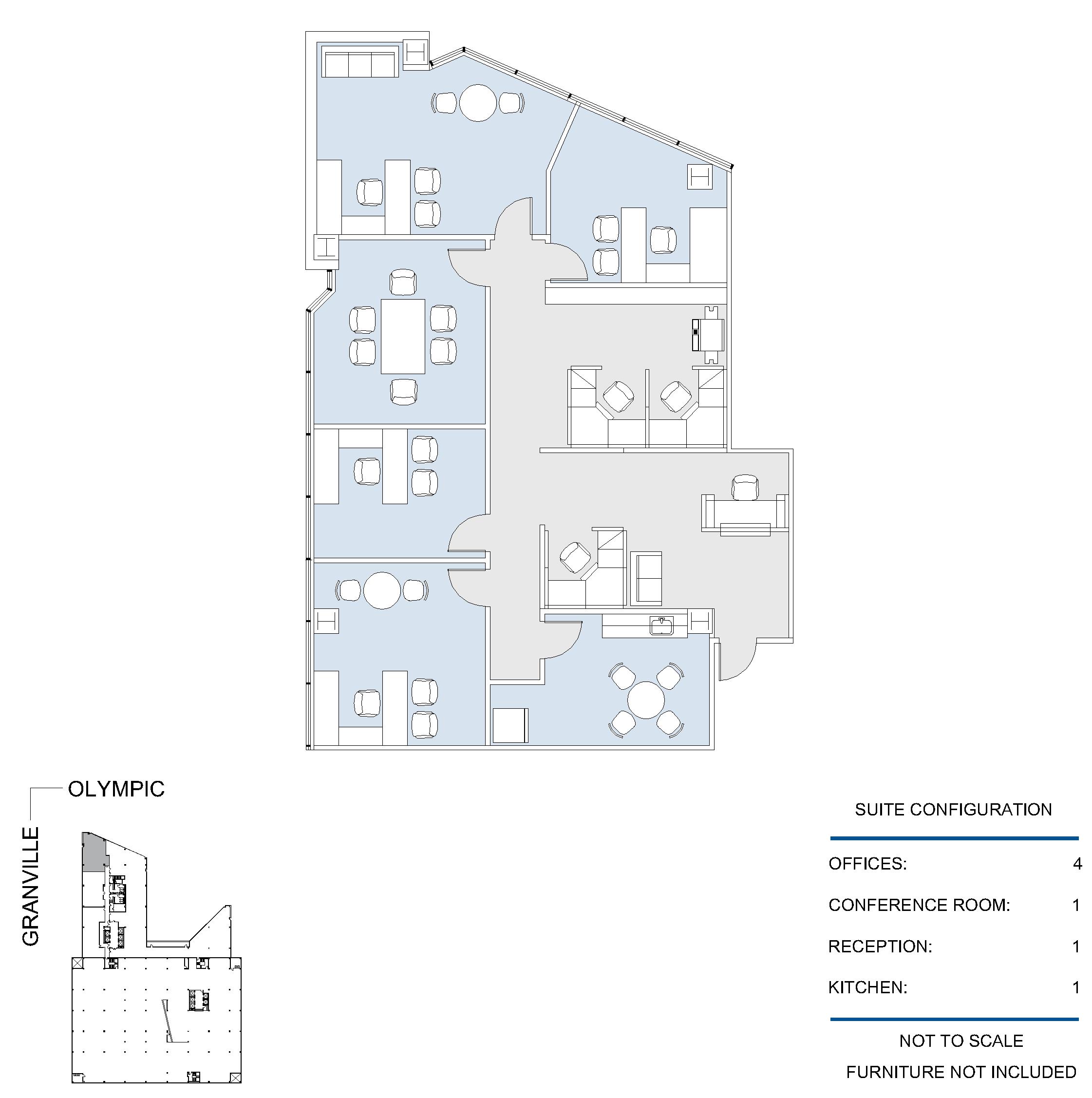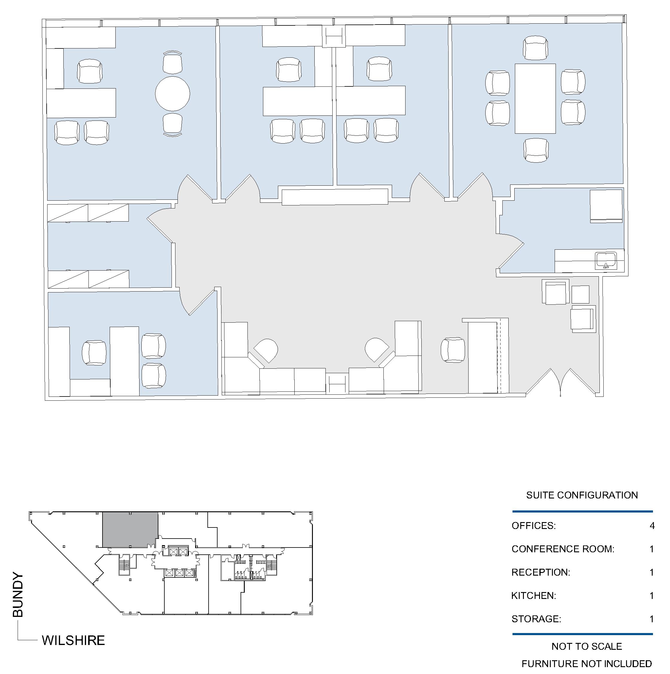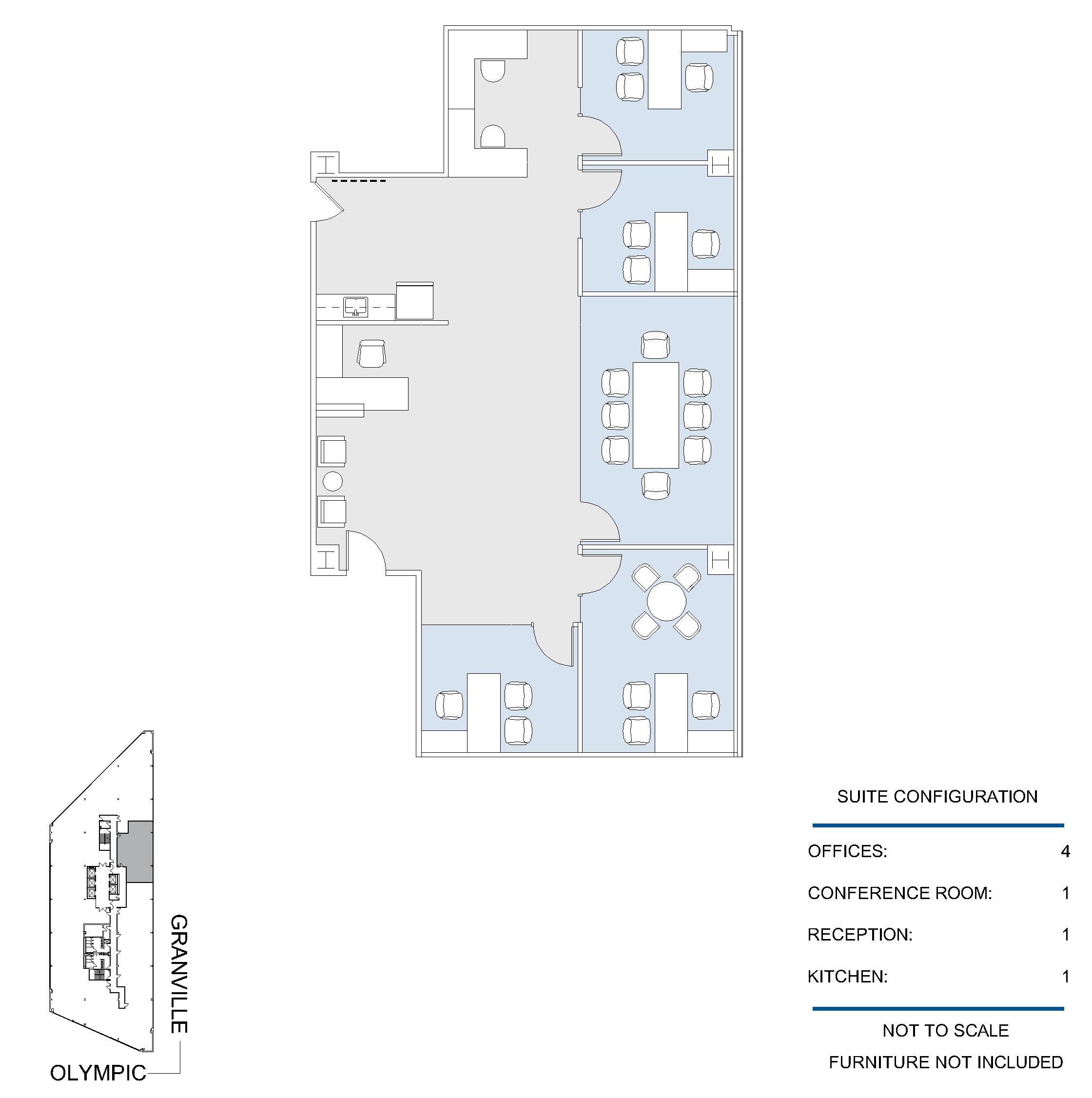 4 window offices, 1 interior office, windowline conference room, open work area, kitchen and reception area.
