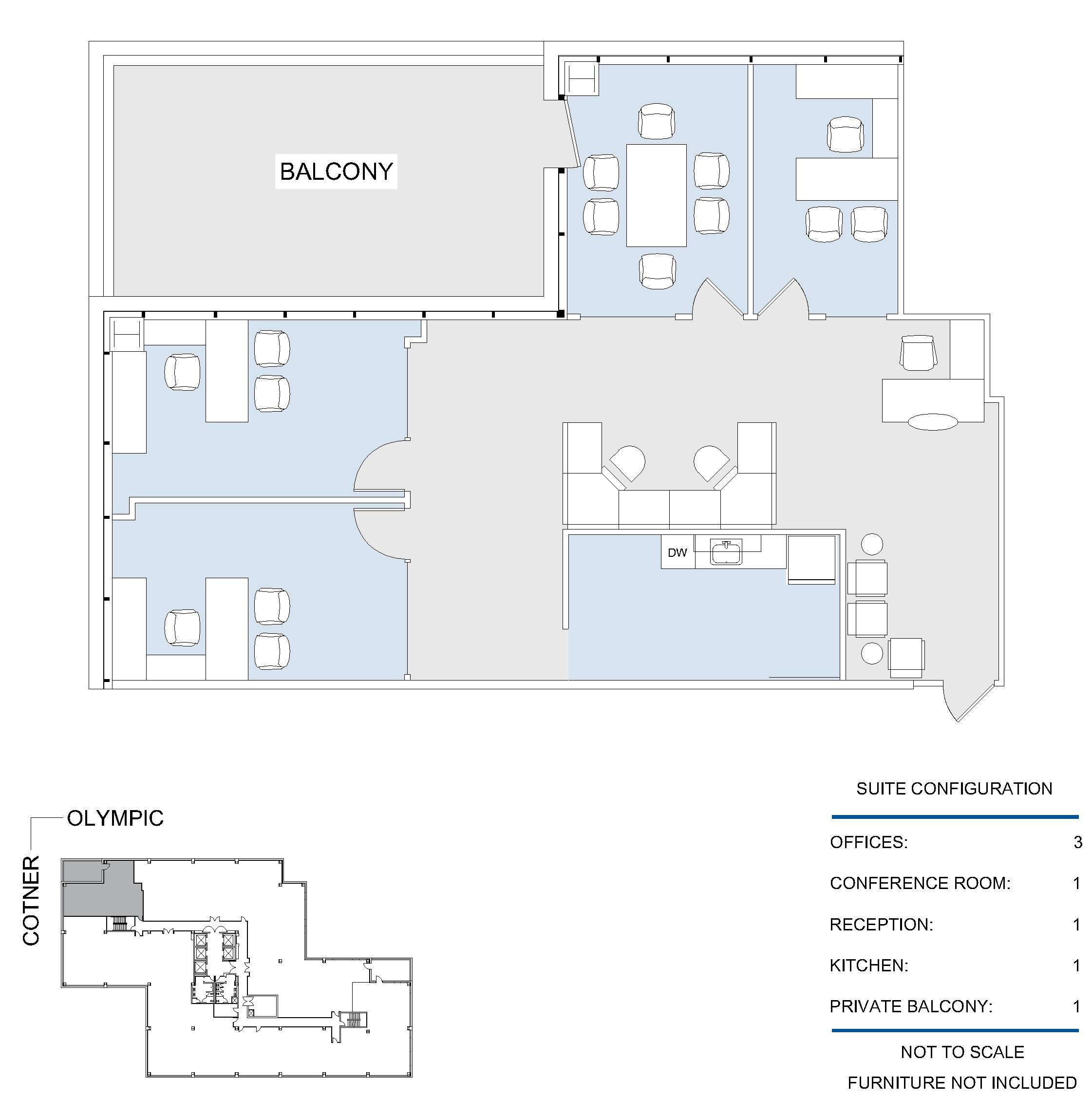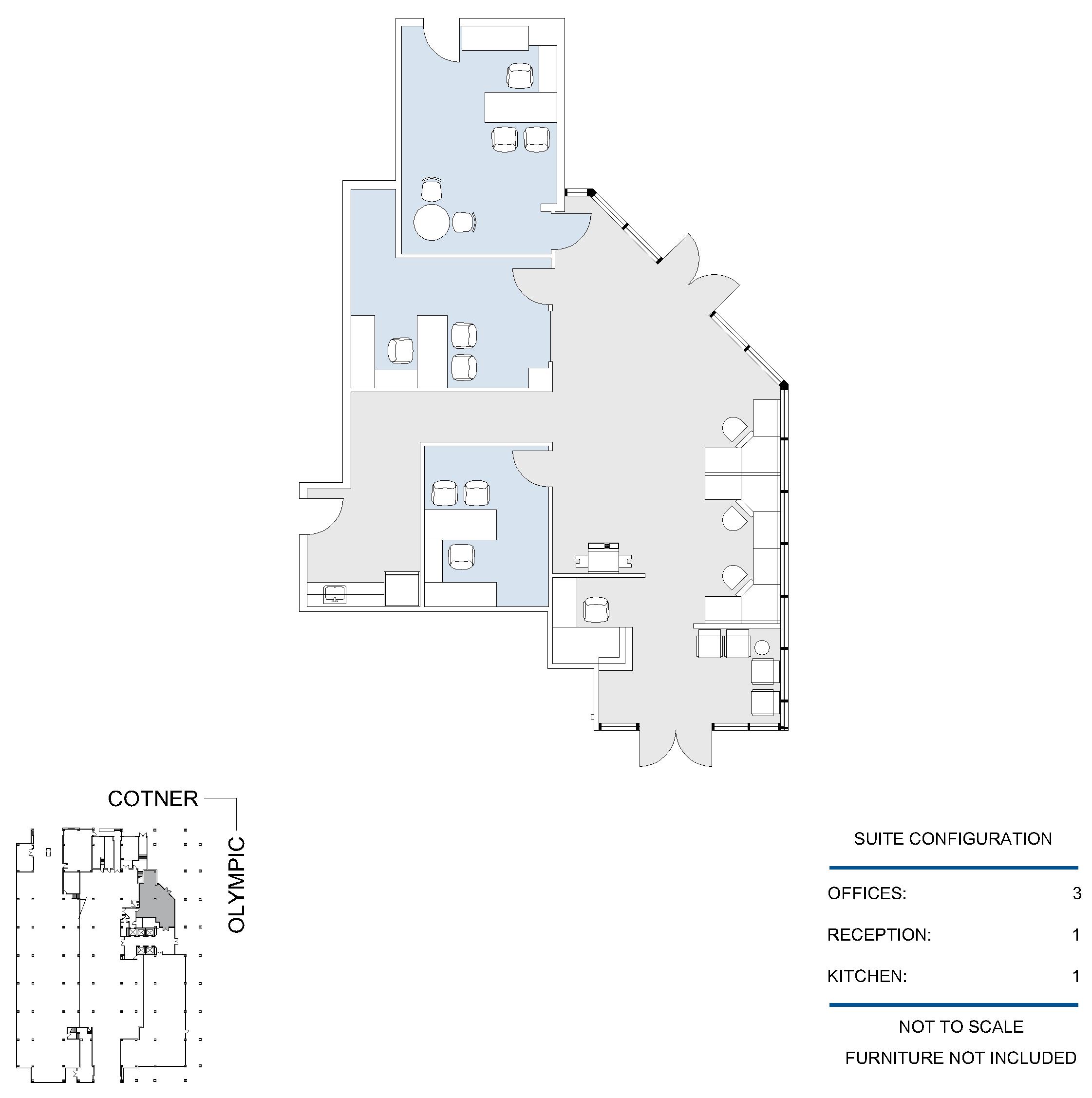 Corner suite with 3 window offices, window line conference room, open work area and a kitchen.