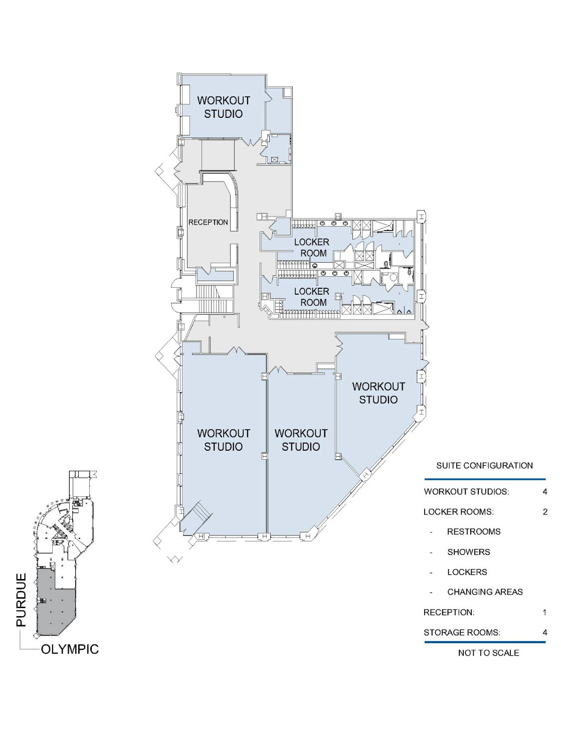 Former gym space with prominent street visibility. 4 workout studios with high ceilings (15ft), 2 locker rooms with private showers and restrooms, reception area, and 4 storage rooms.