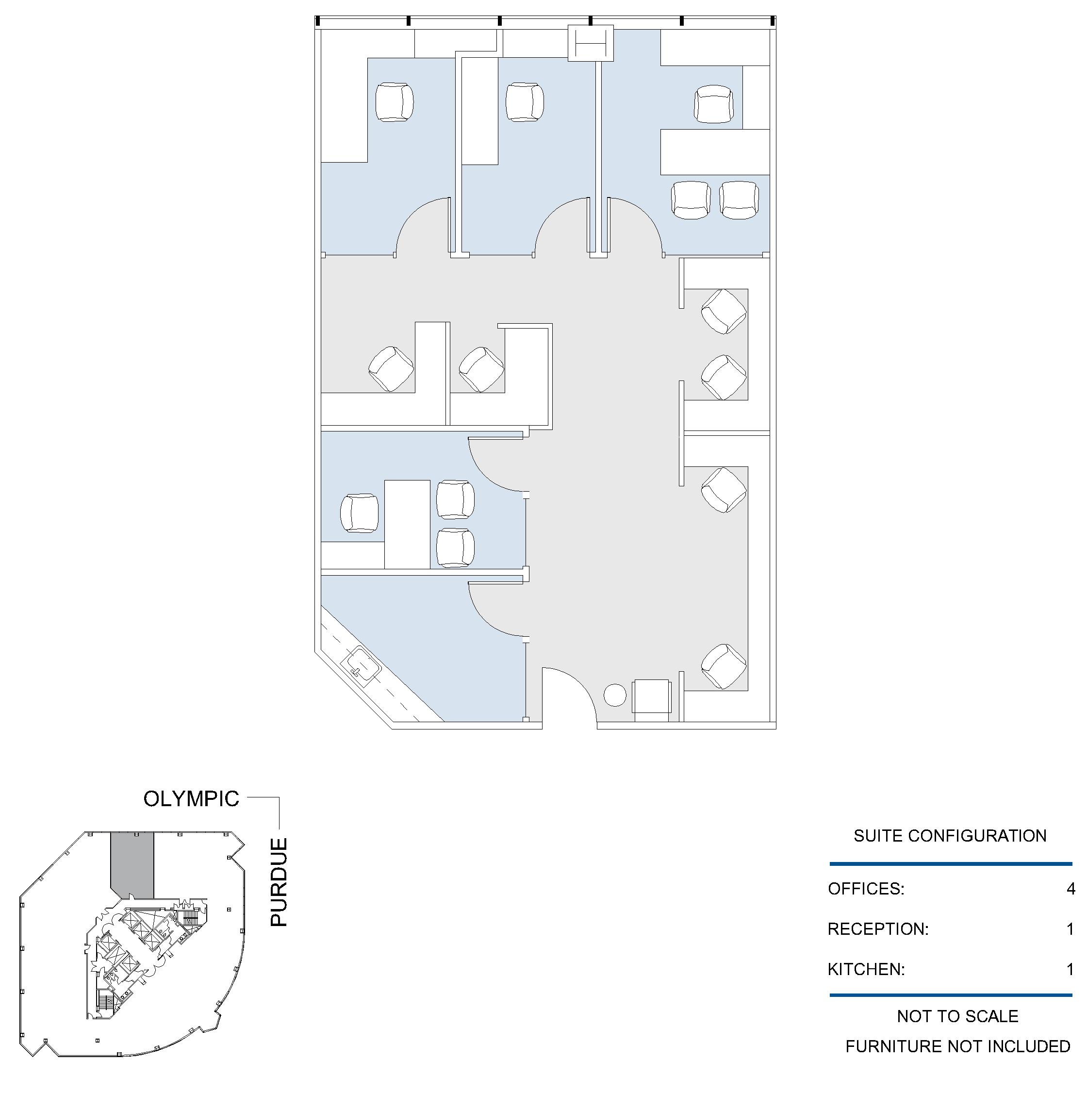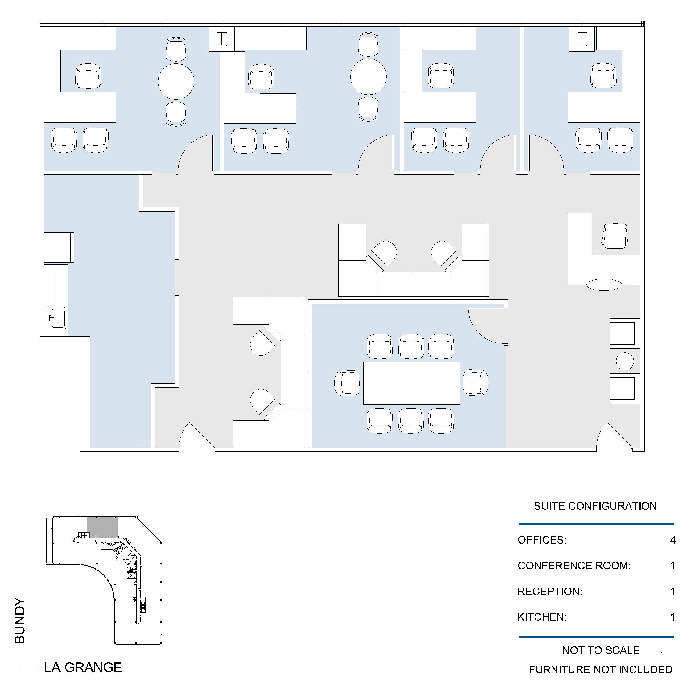 4 window offices, windowline conference room, kitchen, open work area and reception area.