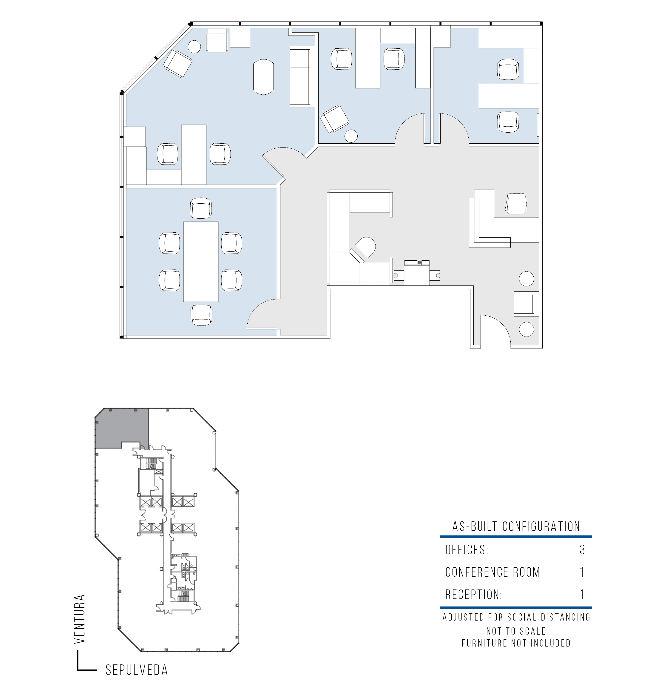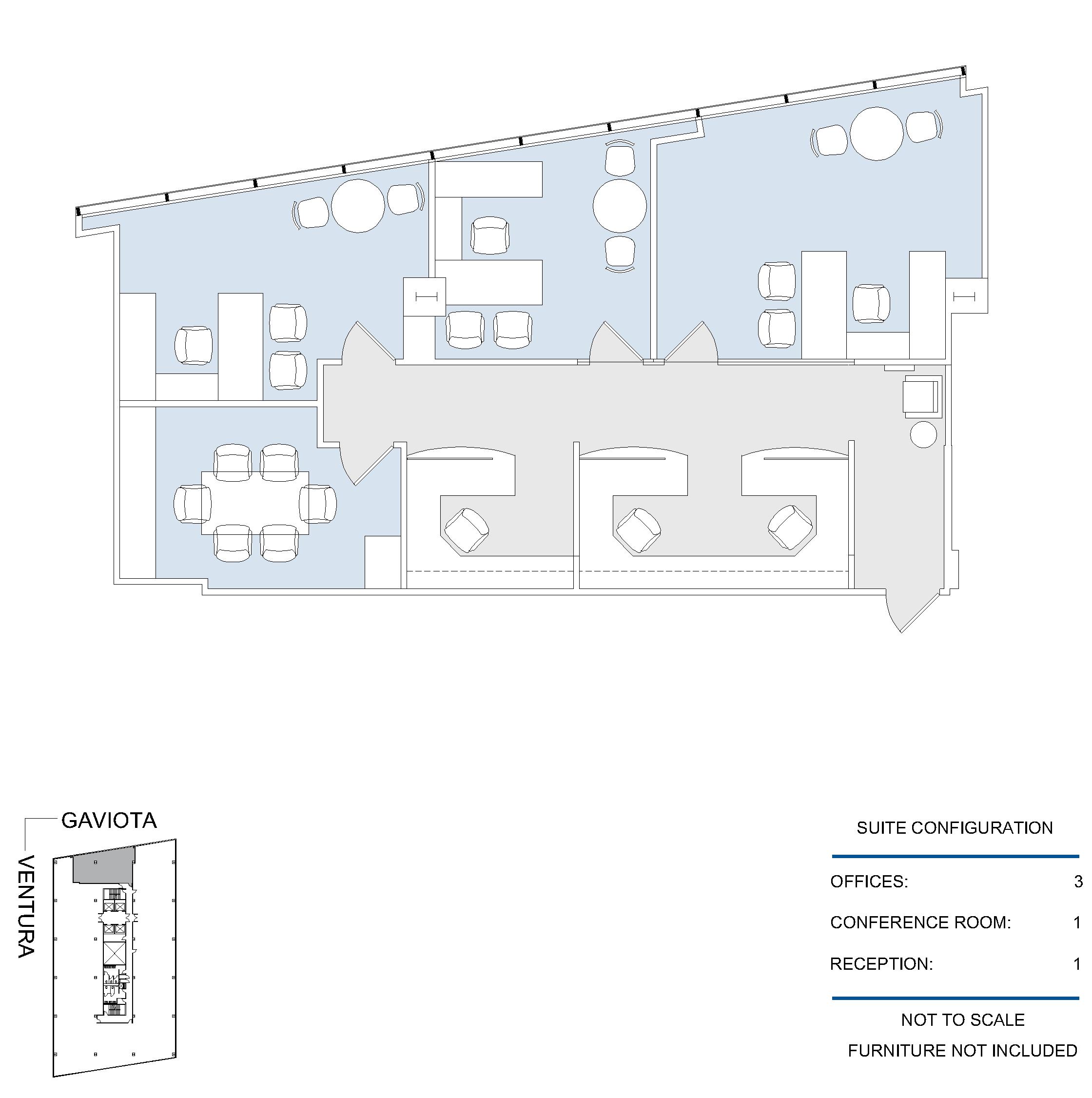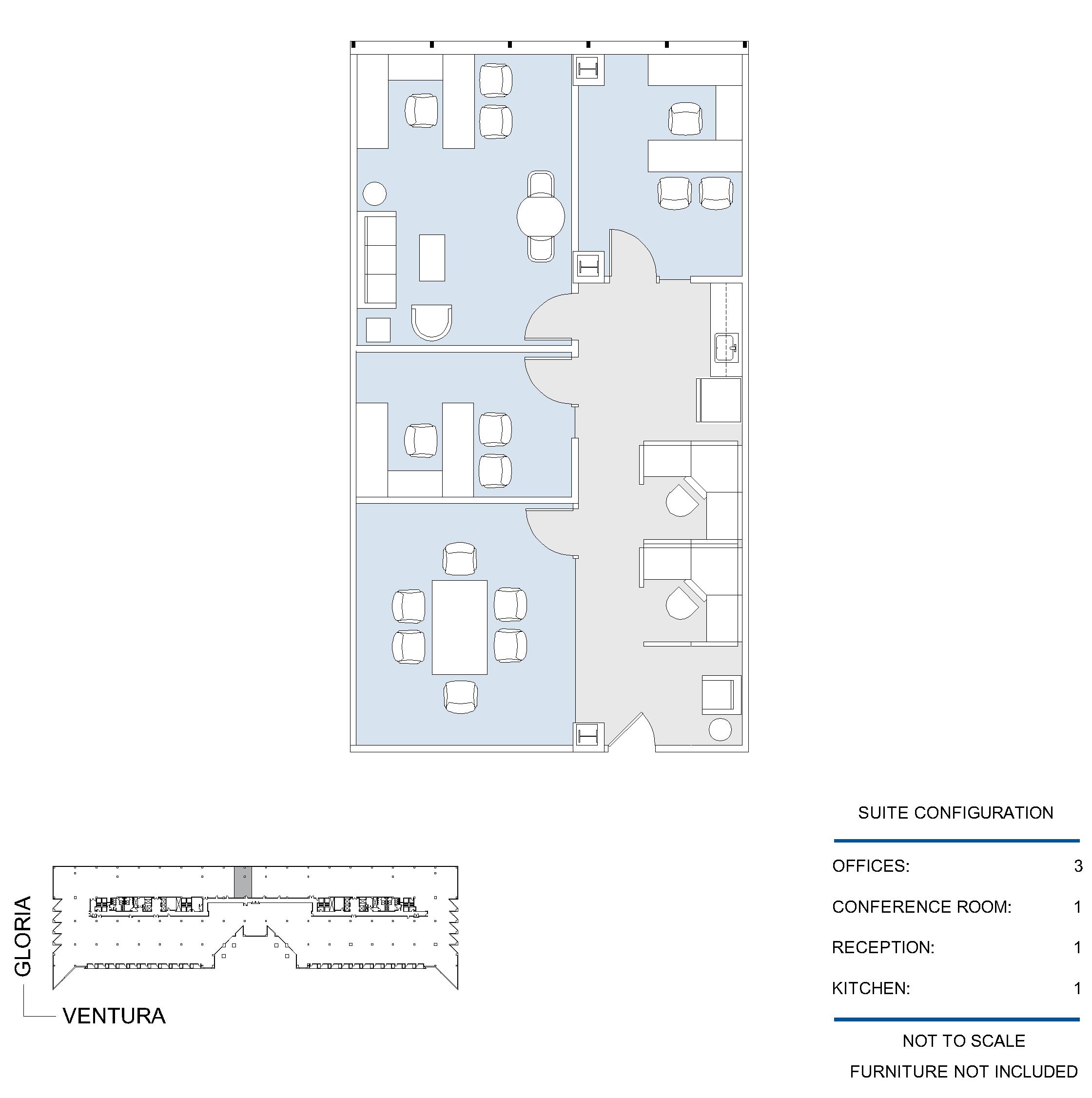 3 window offices, conference room, kitchen and reception area.