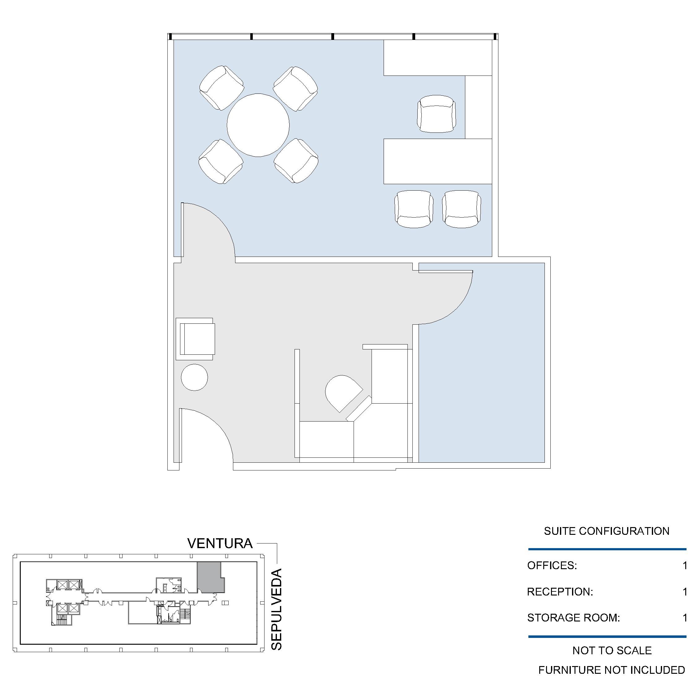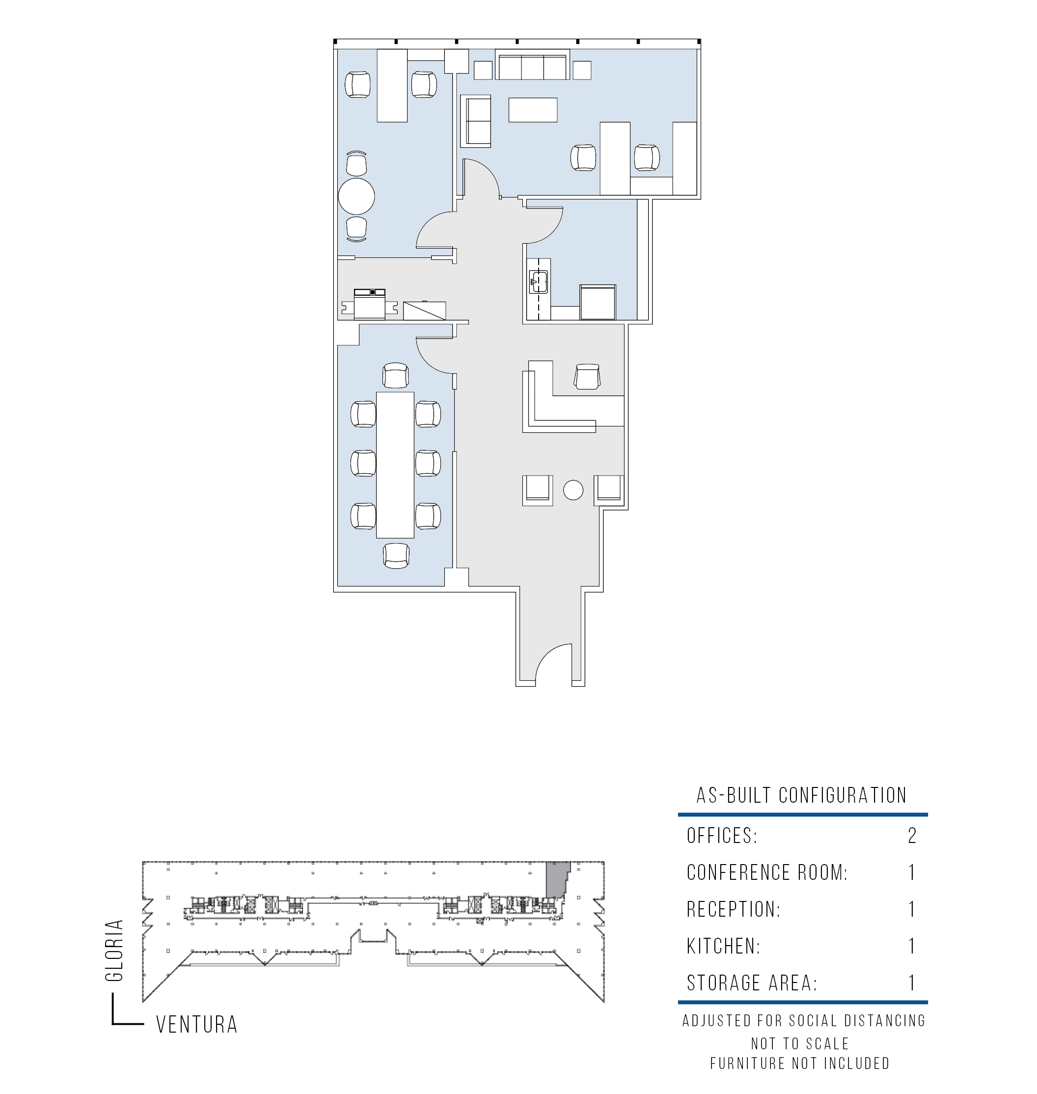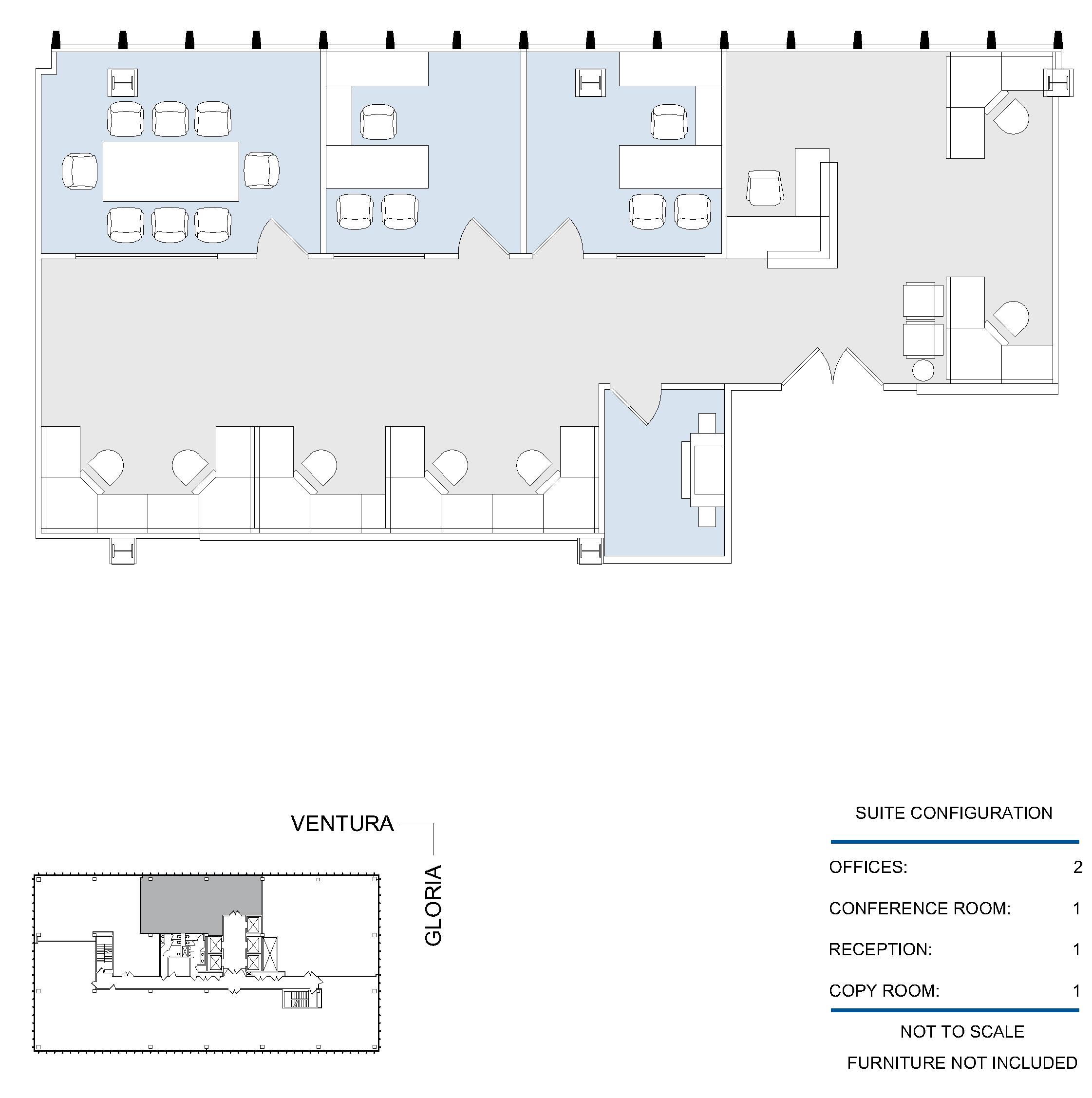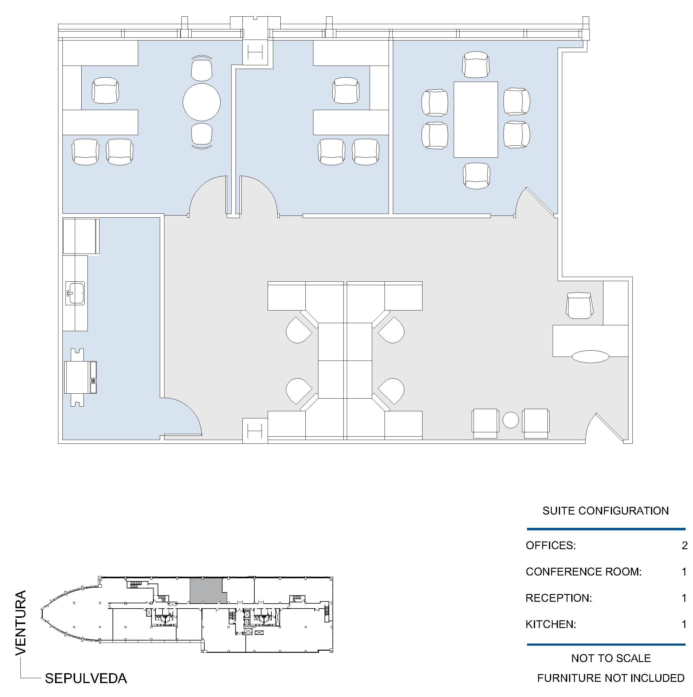 2 window offices, conference room, storage room, kitchen and reception area.
