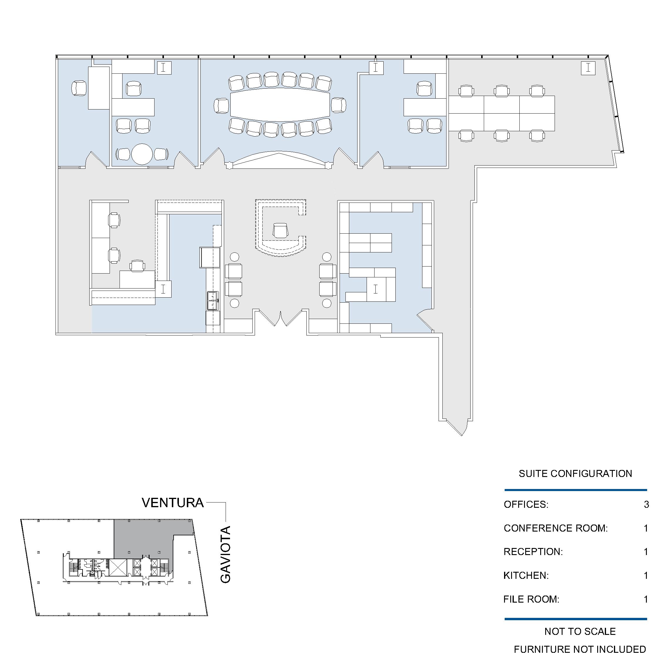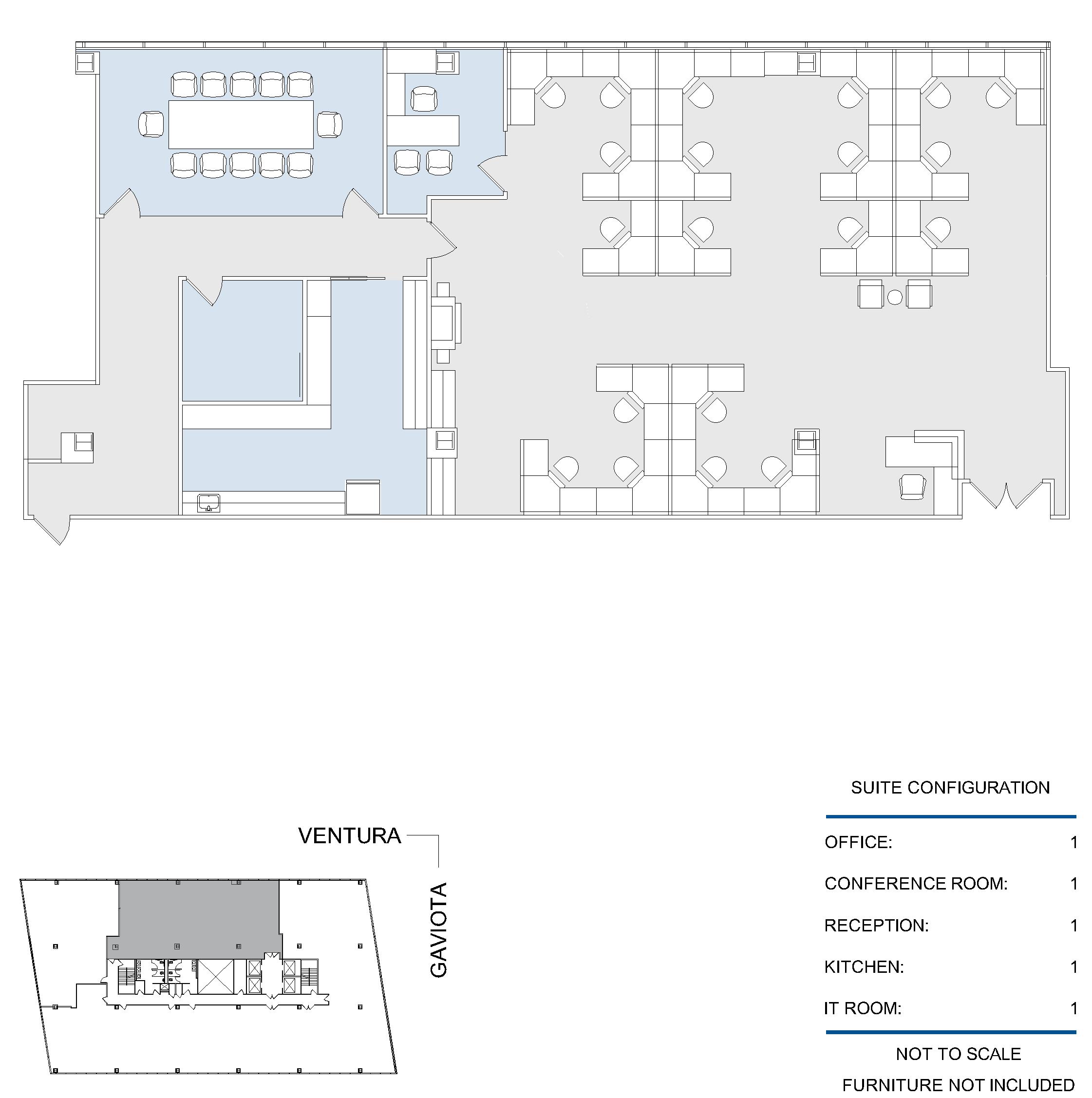 14 window offices, 1 interior office, windowline conference room, open work area, reception area, kitchen, private restroom, IT room, 2 copy/file rooms, telephone room, and 3 storage spaces.