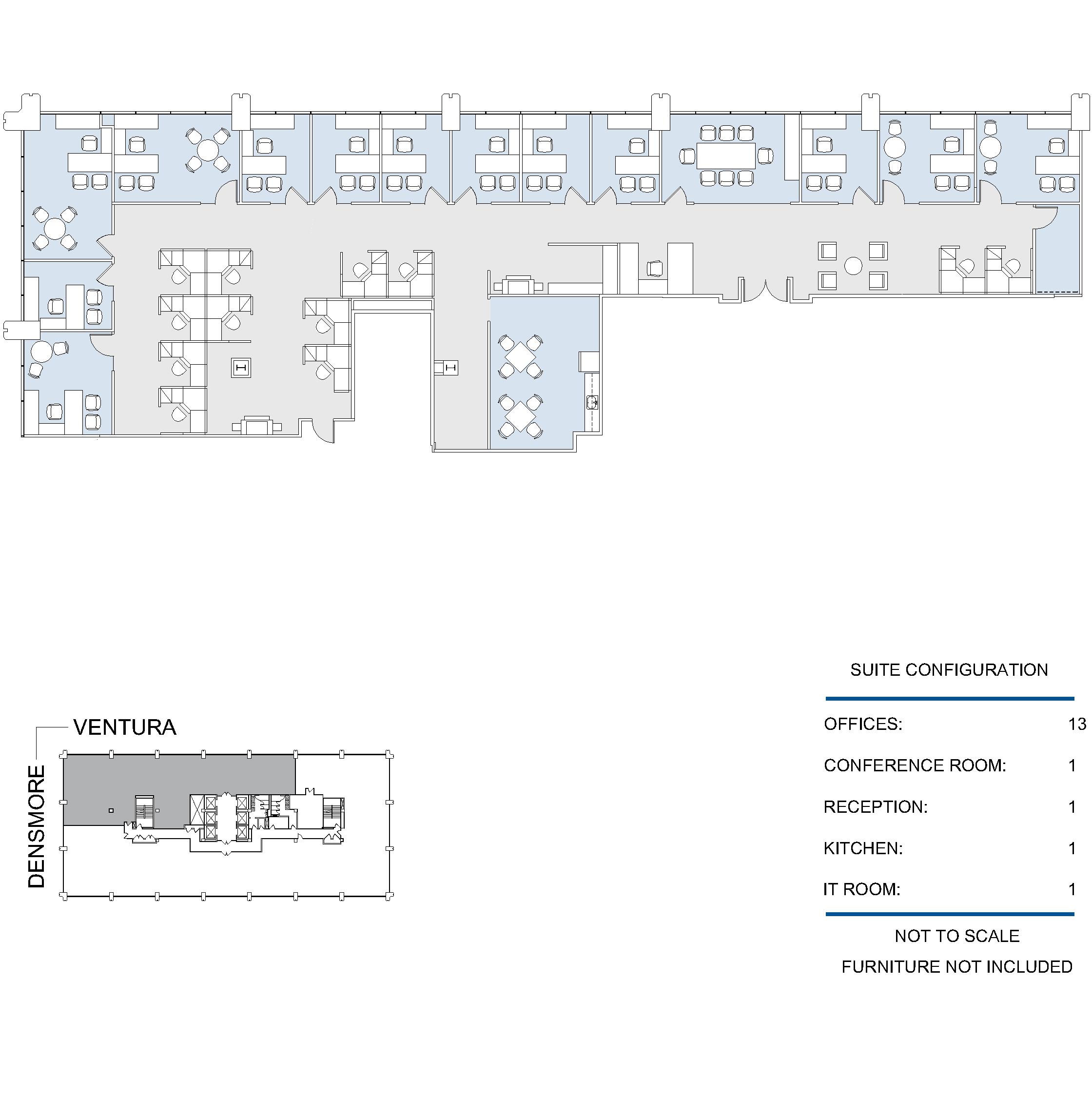 7 window offices, windowline conference room, open work area, kitchen, IT room, storage room, and reception area.