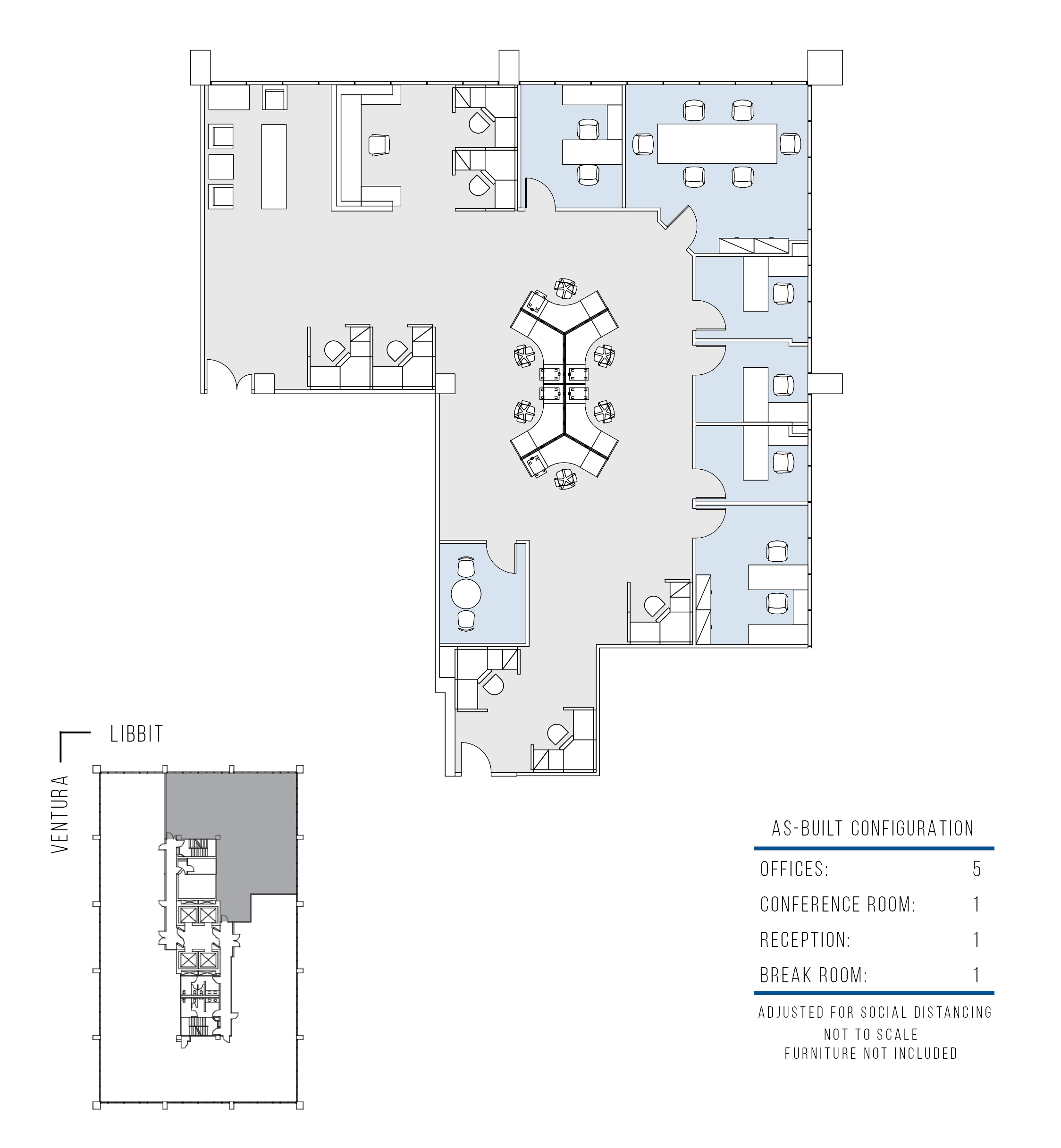 4 window offices, 1 interior office, conference room, server room, support area with built-in cabinetry, reception area.