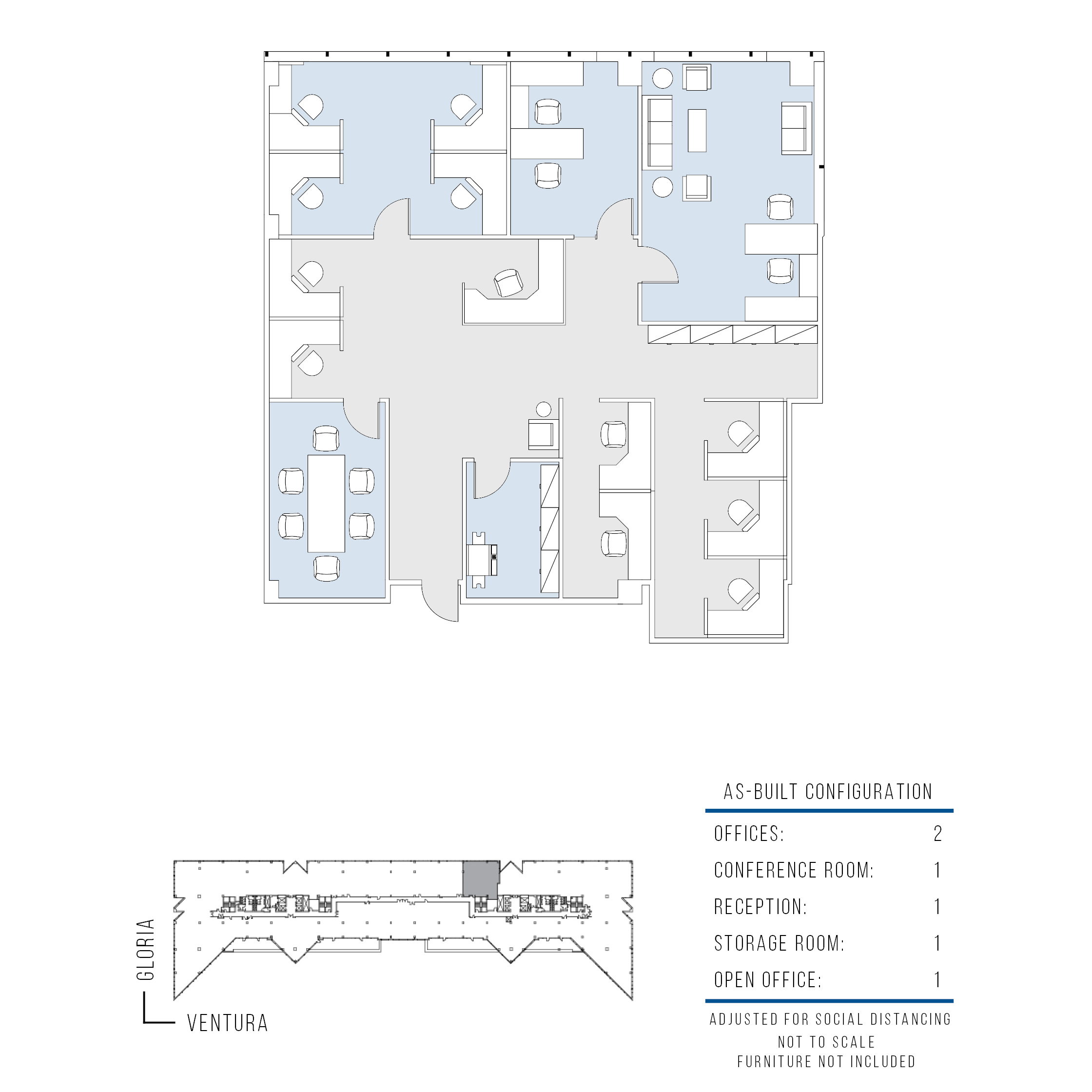 11 window offices, 1 interior office, glass conference room, kitchen, 2 storage rooms, reception, open areas for support.