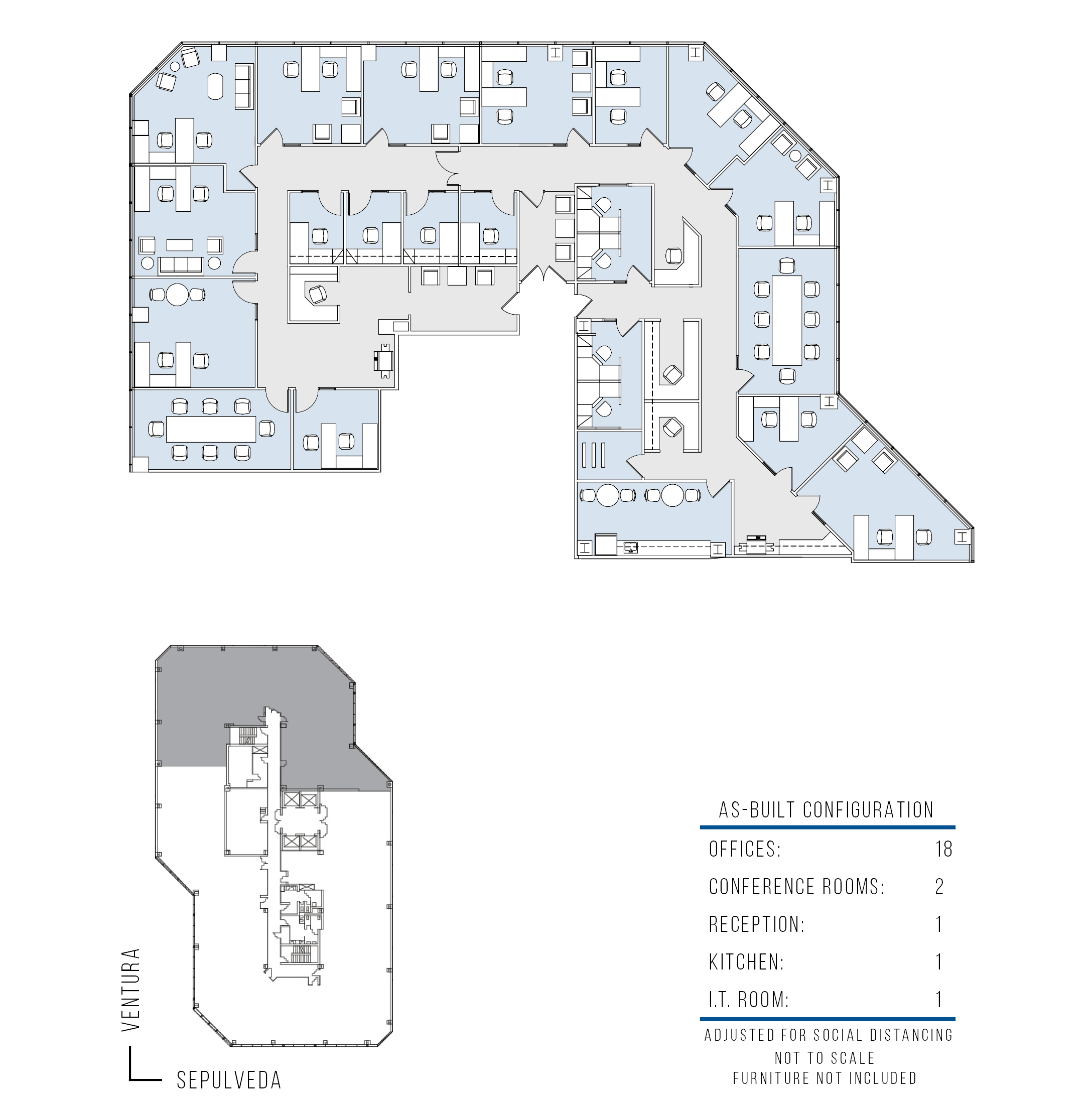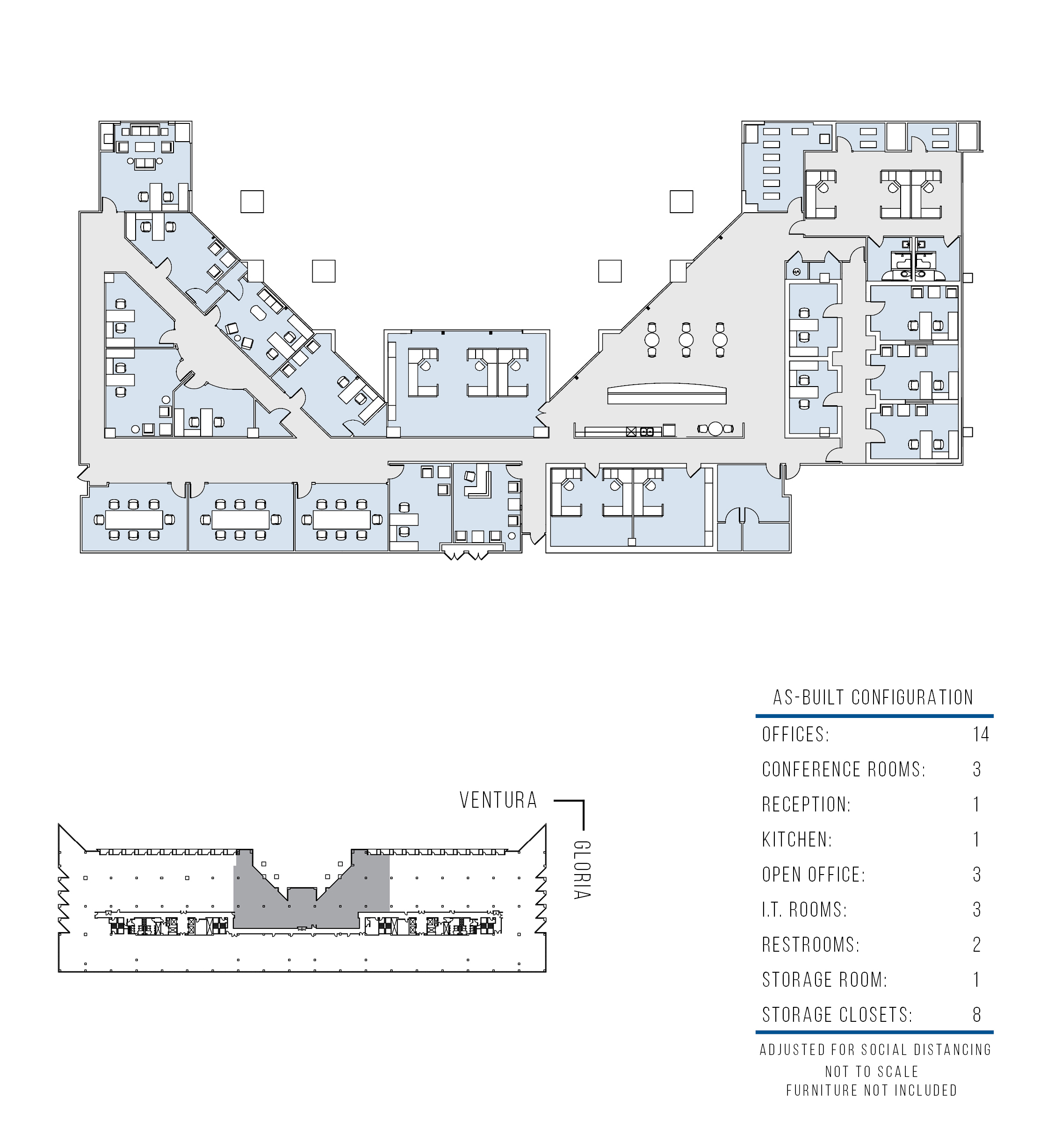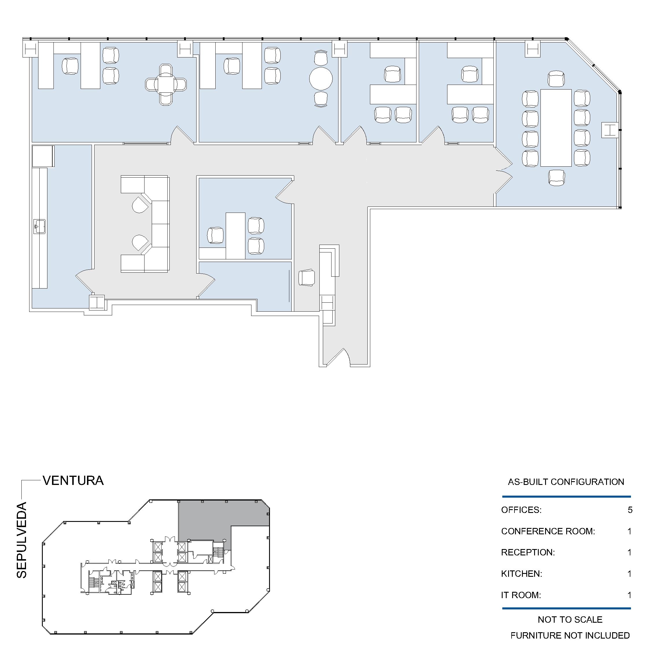 20 window offices, 3 windowline conference rooms, kitchen, storage closet, storage room, I.T. room, open work area and reception area.
