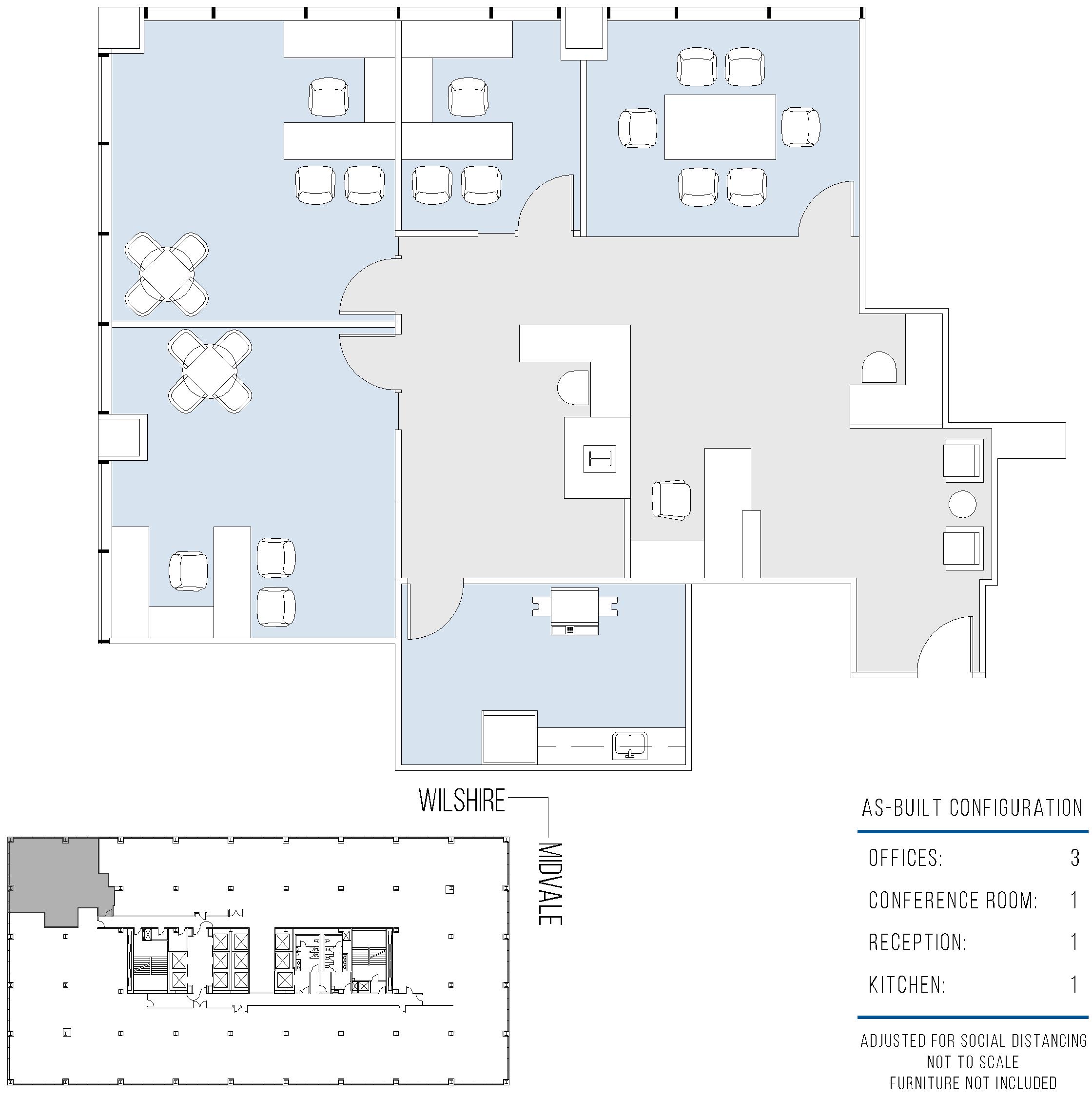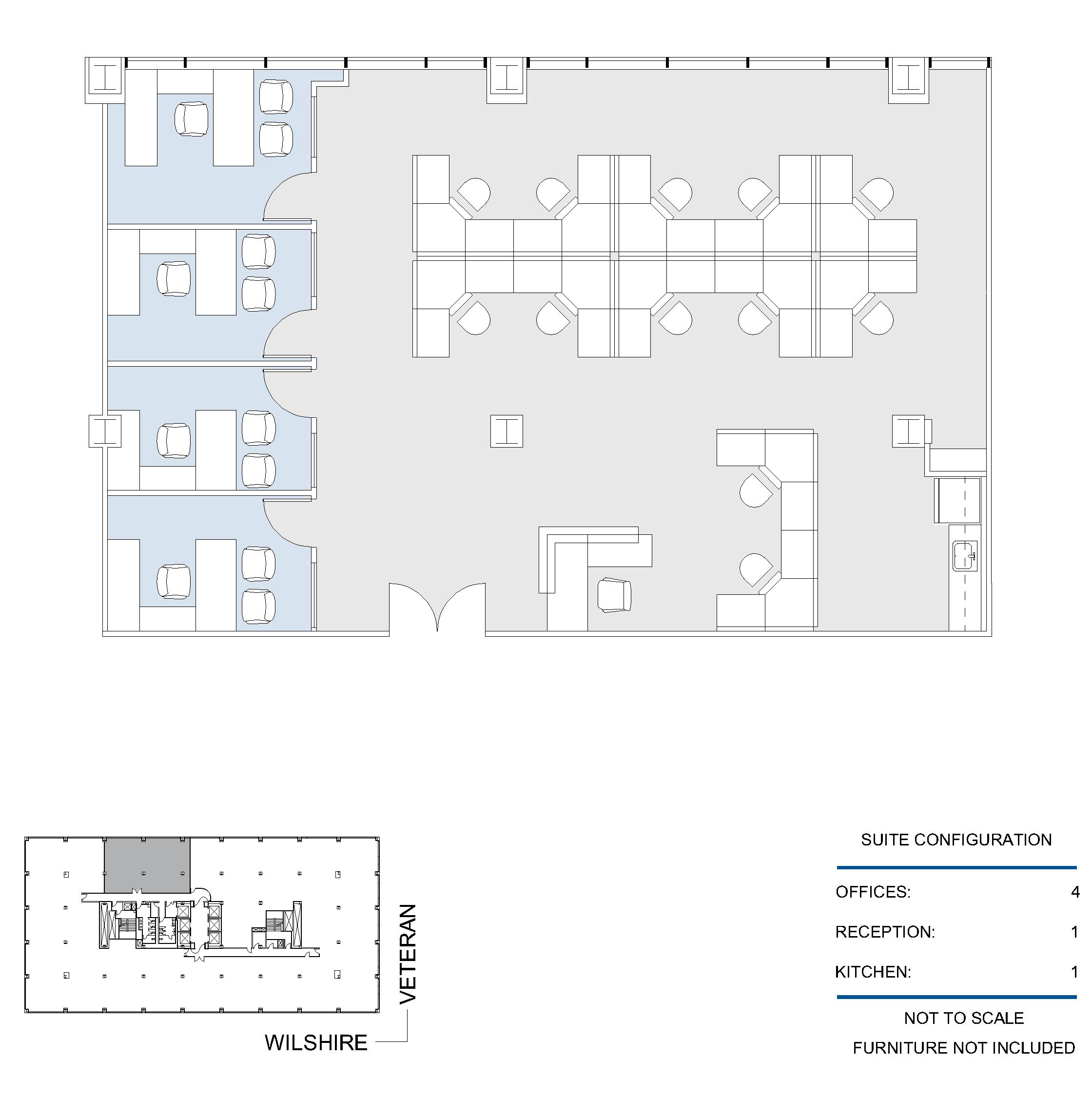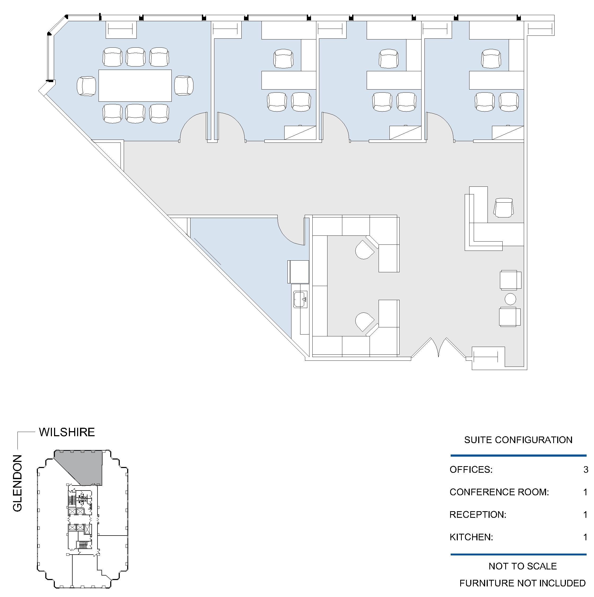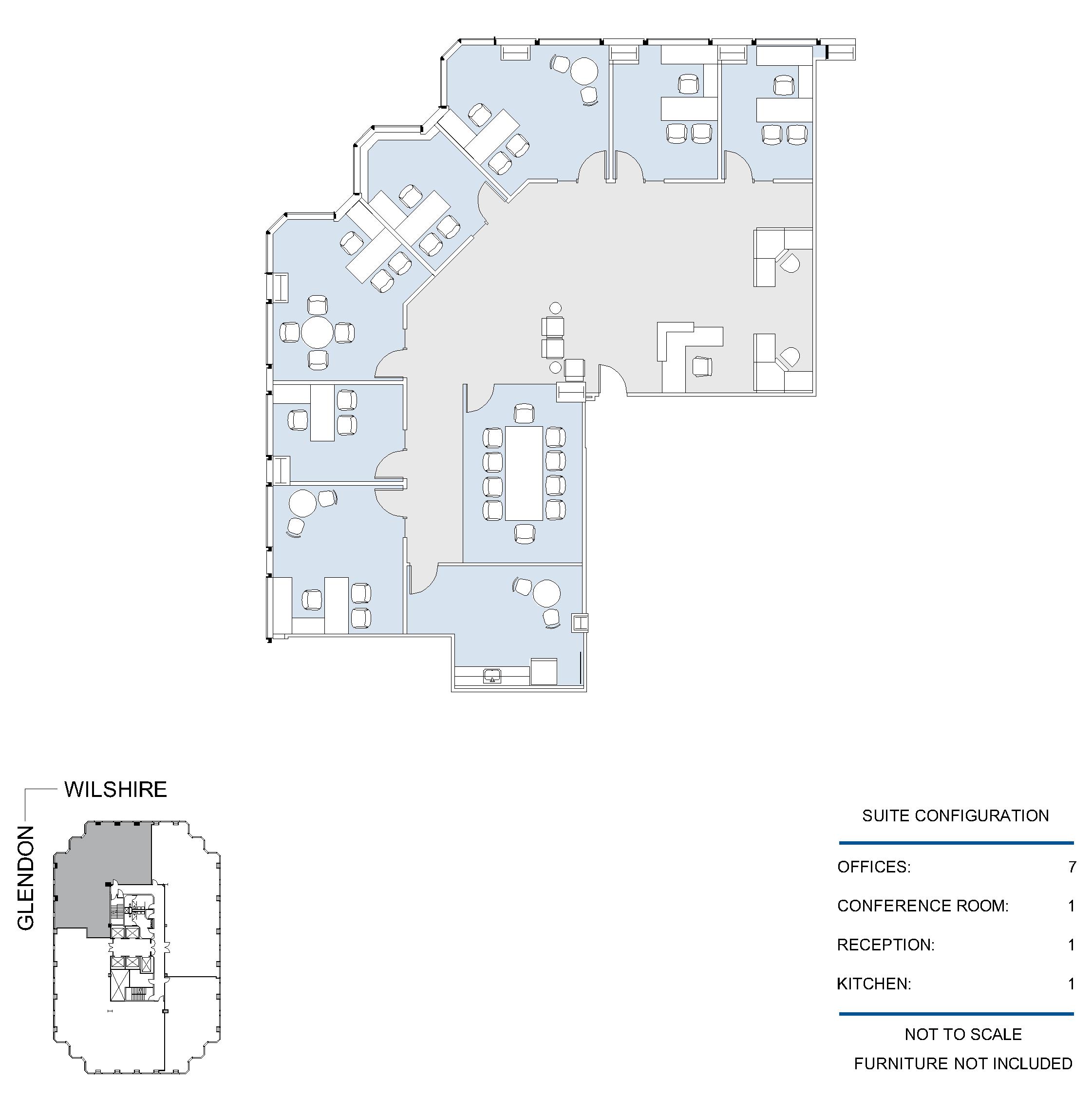 4 window offices, windowline conference room, storage room, kitchen and reception area.