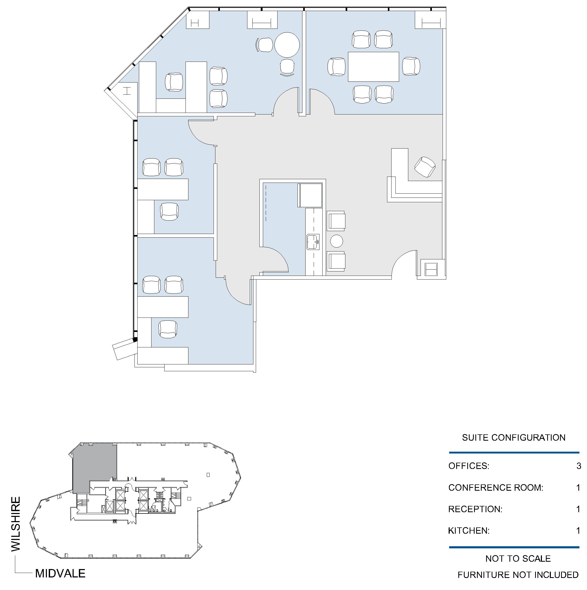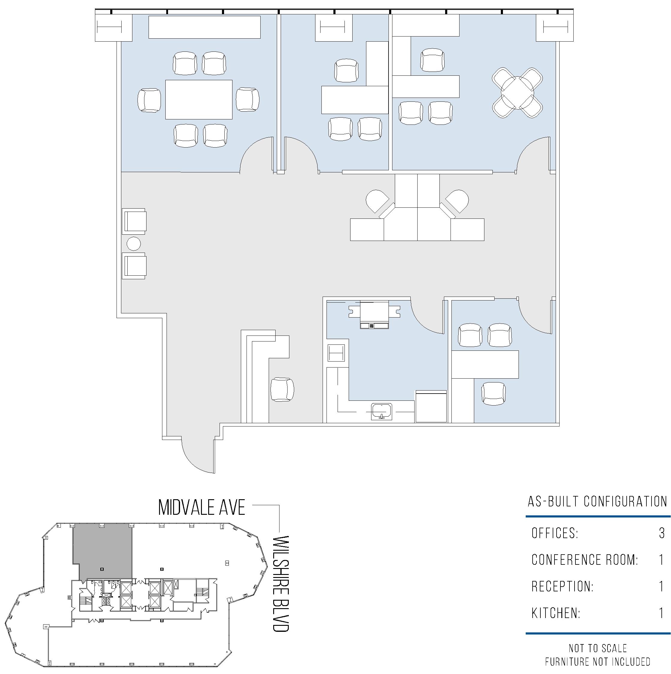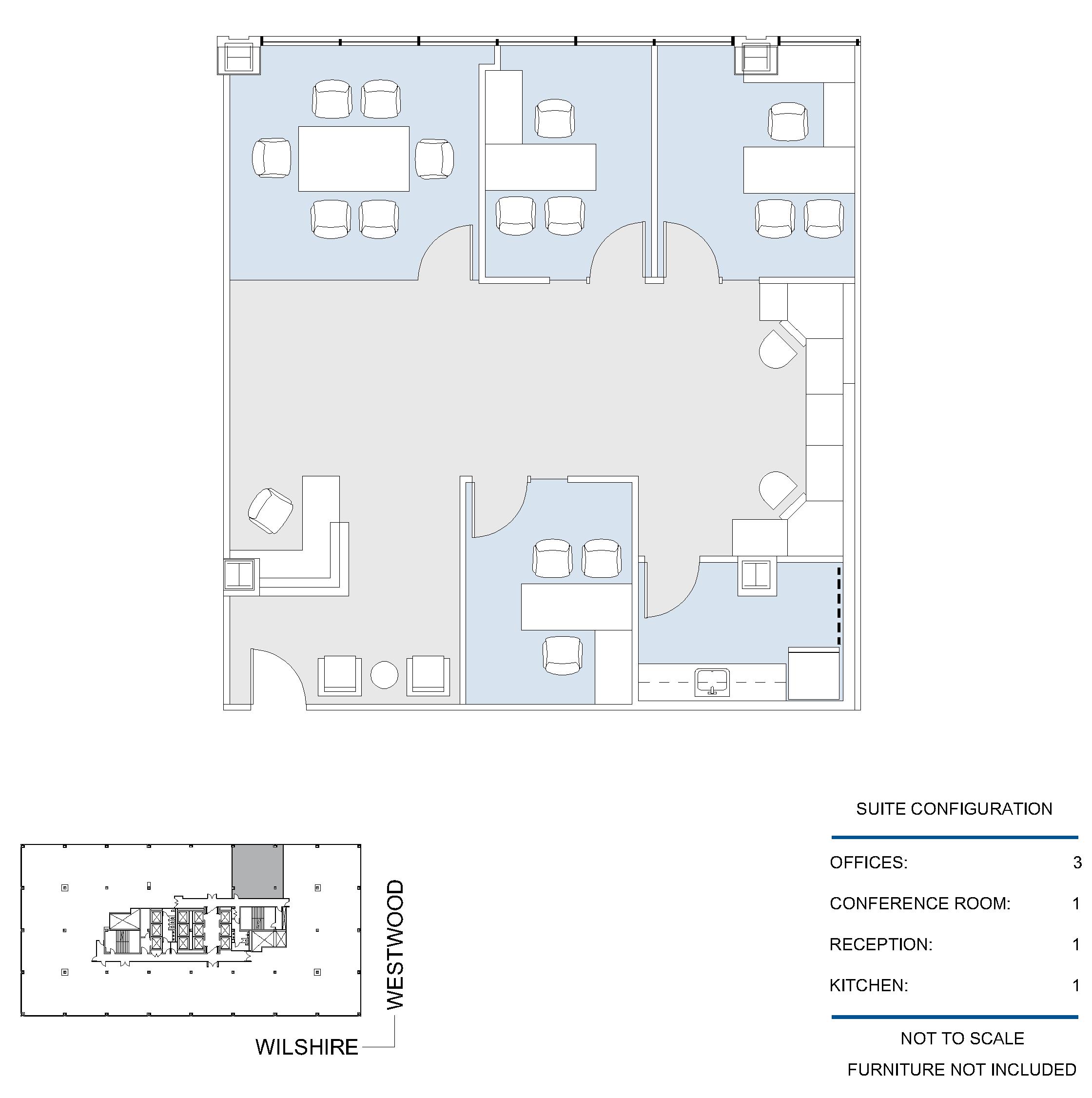 3 window offices, windowline conference room, open work area, open kitchenette, storage/I.T. closet and reception area.