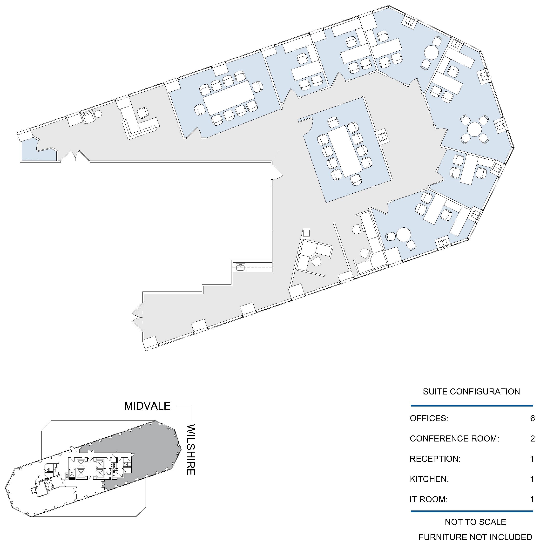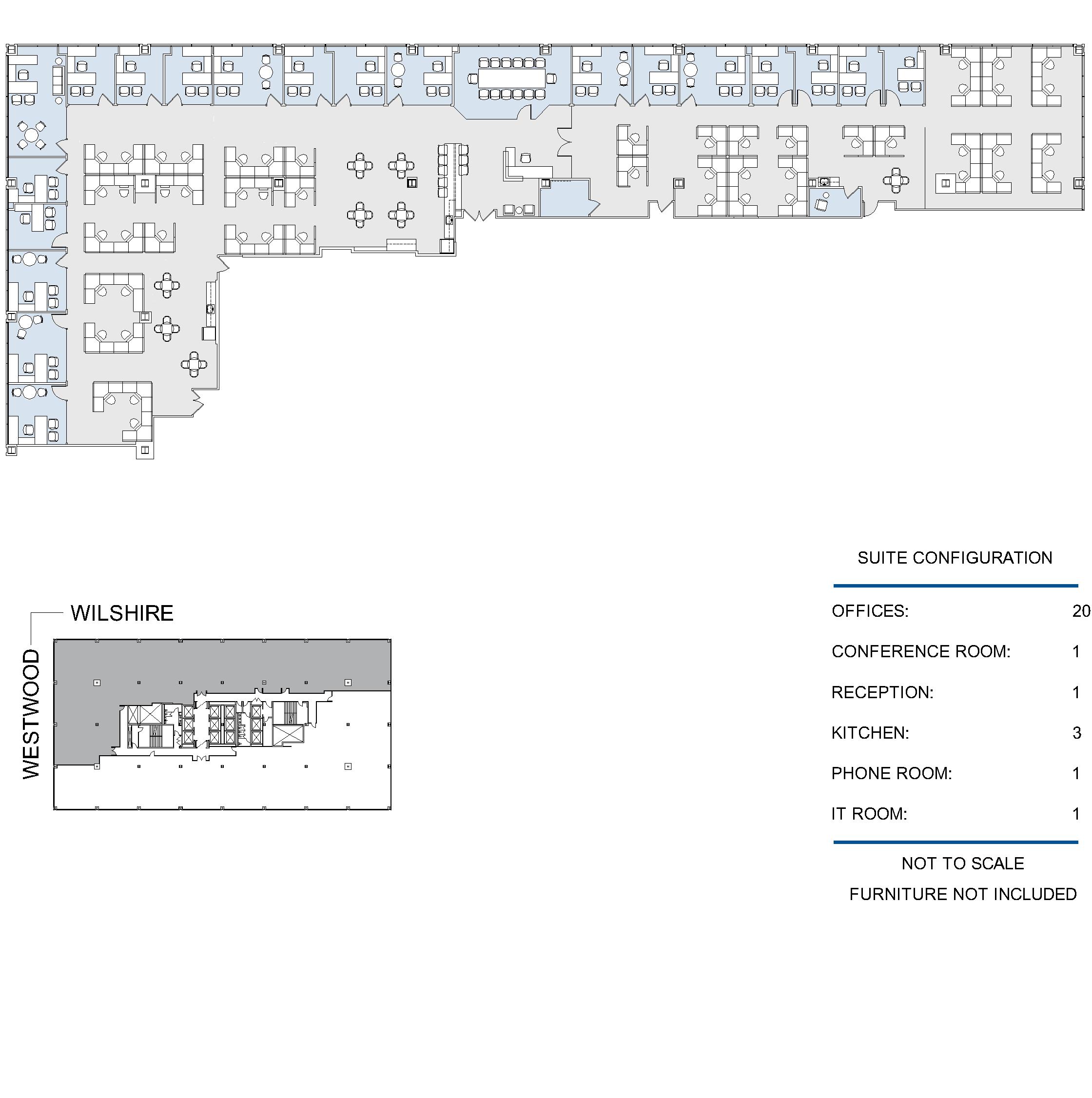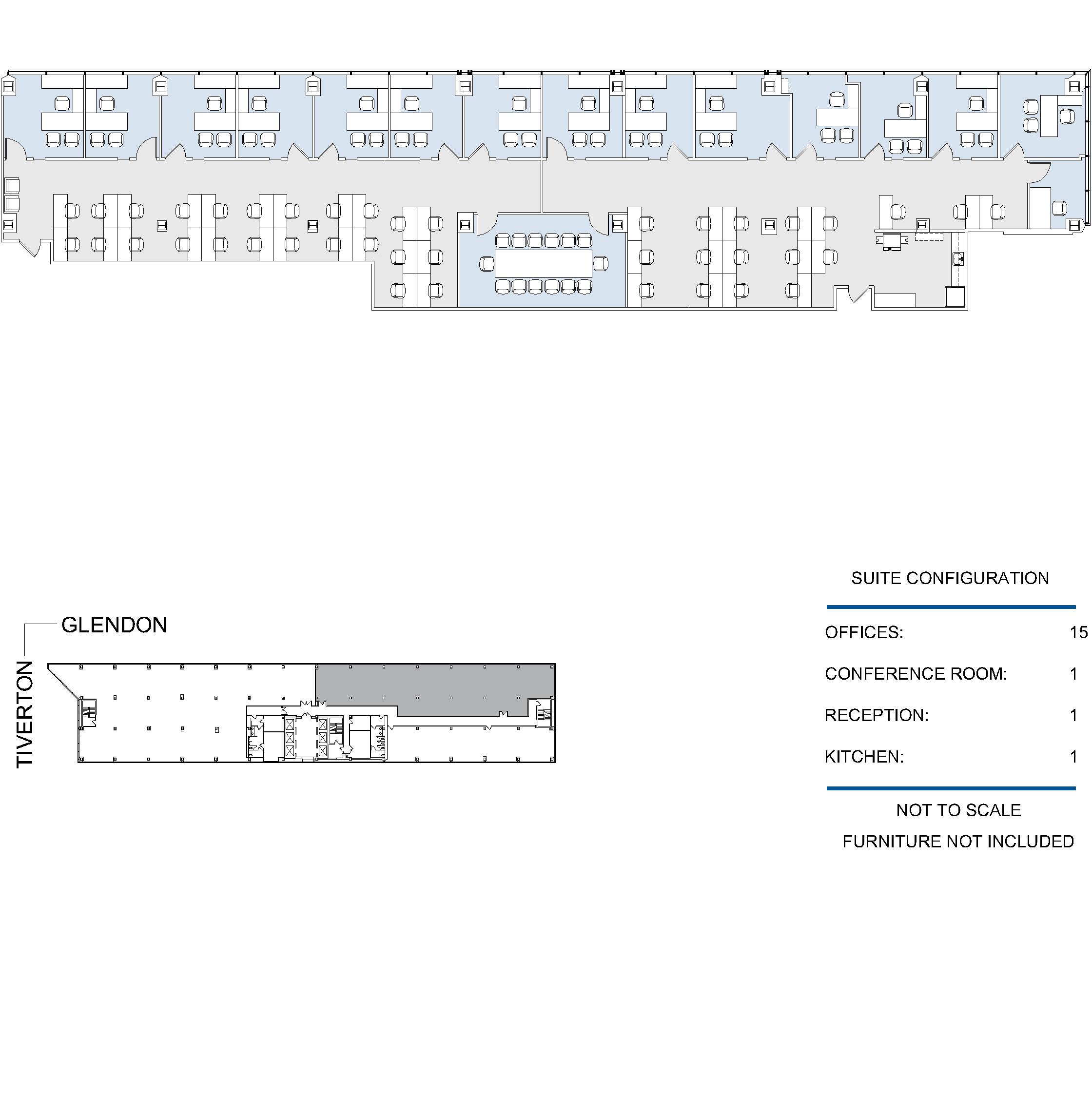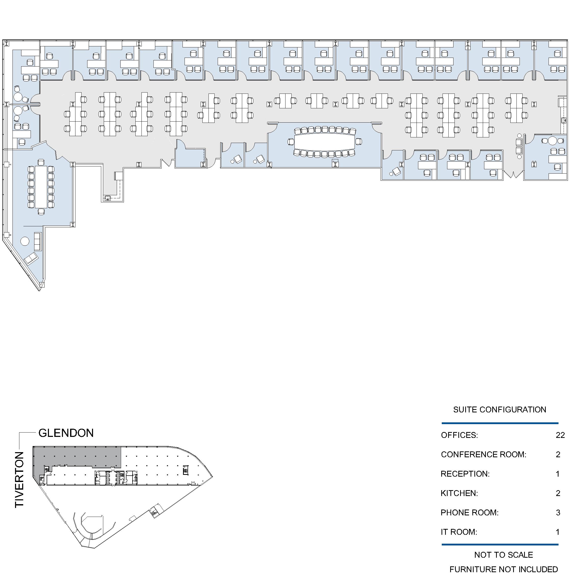 15 window offices, large windowline conference room, large open work areas, kitchen, 2 storage rooms, copy room, IT room, and reception area.