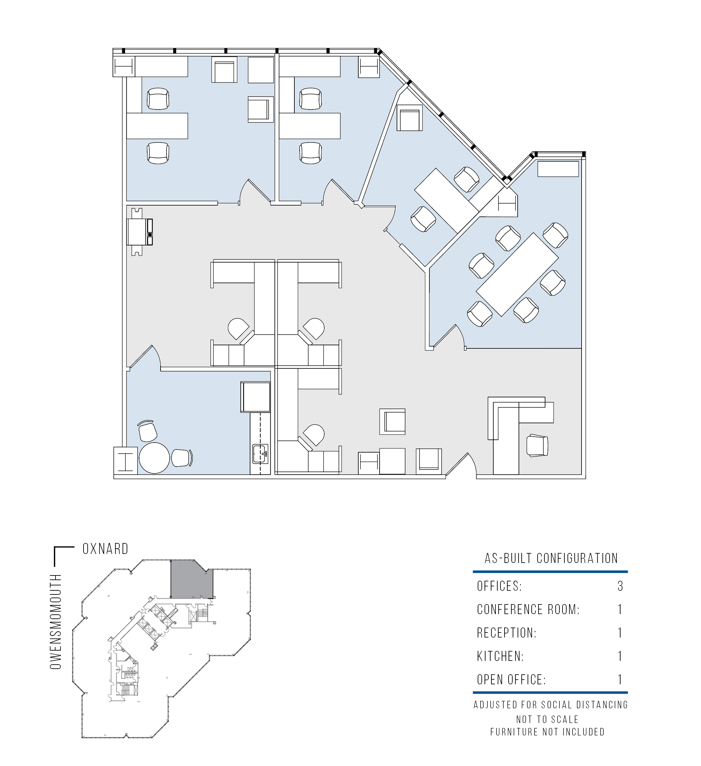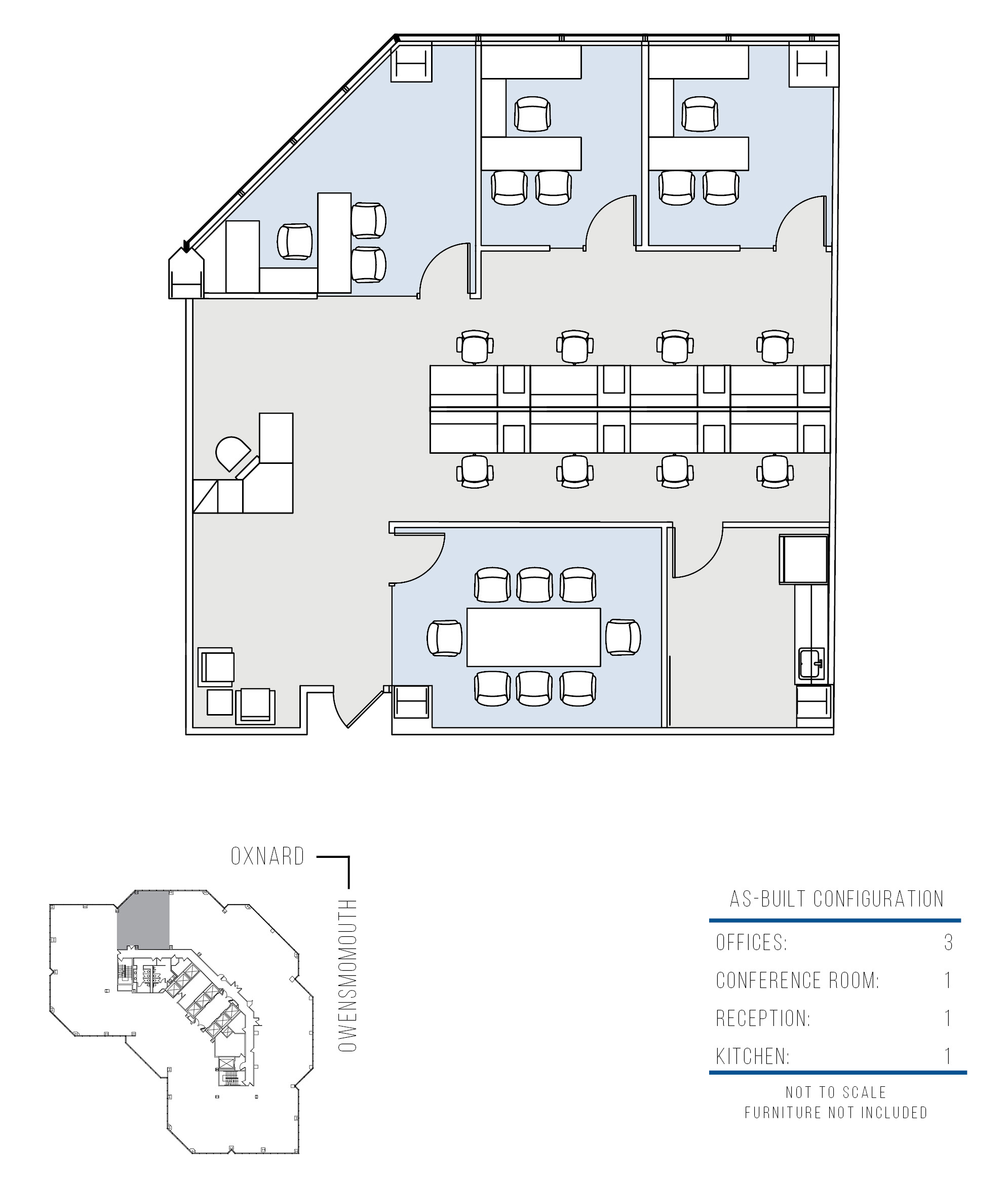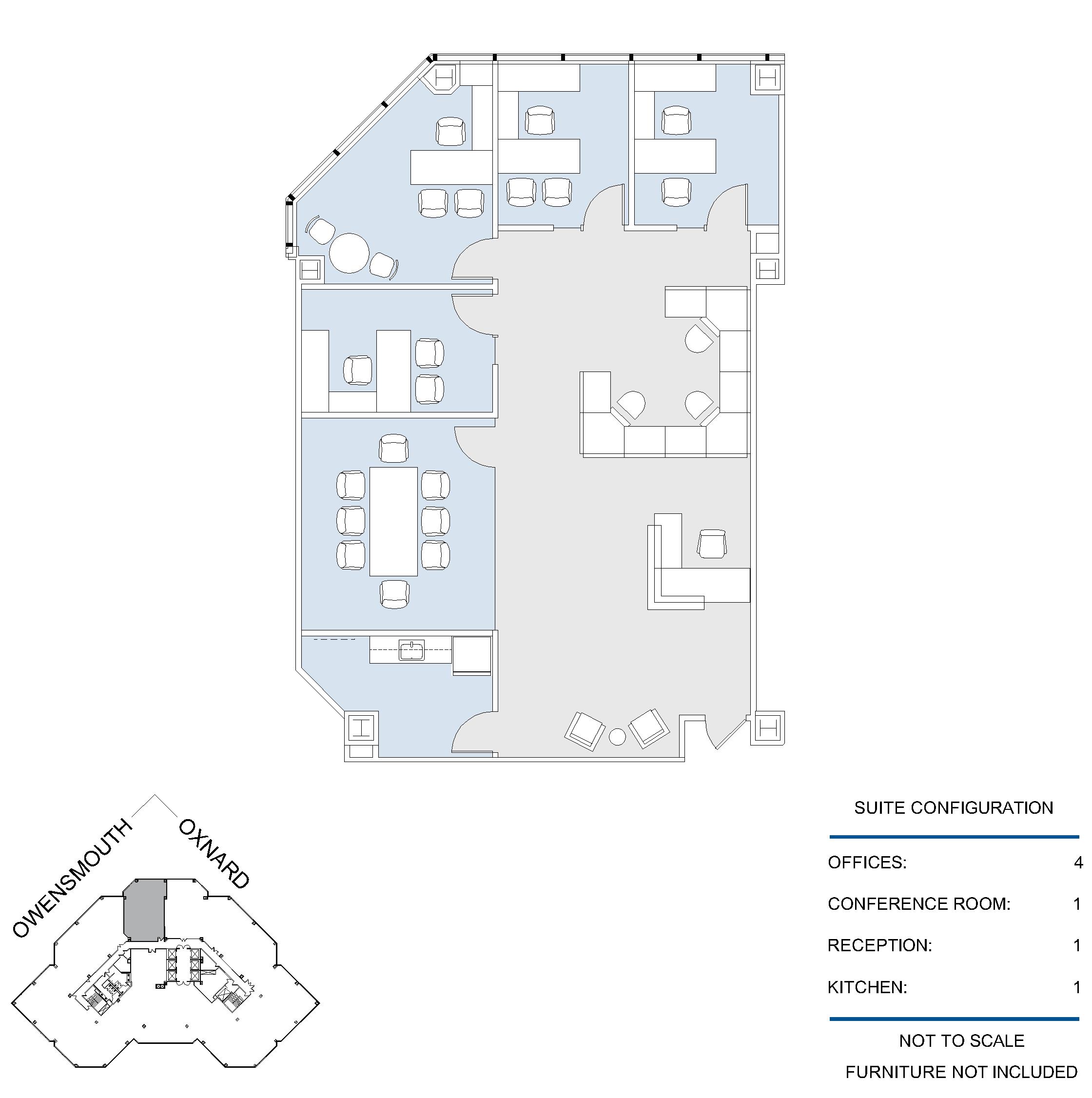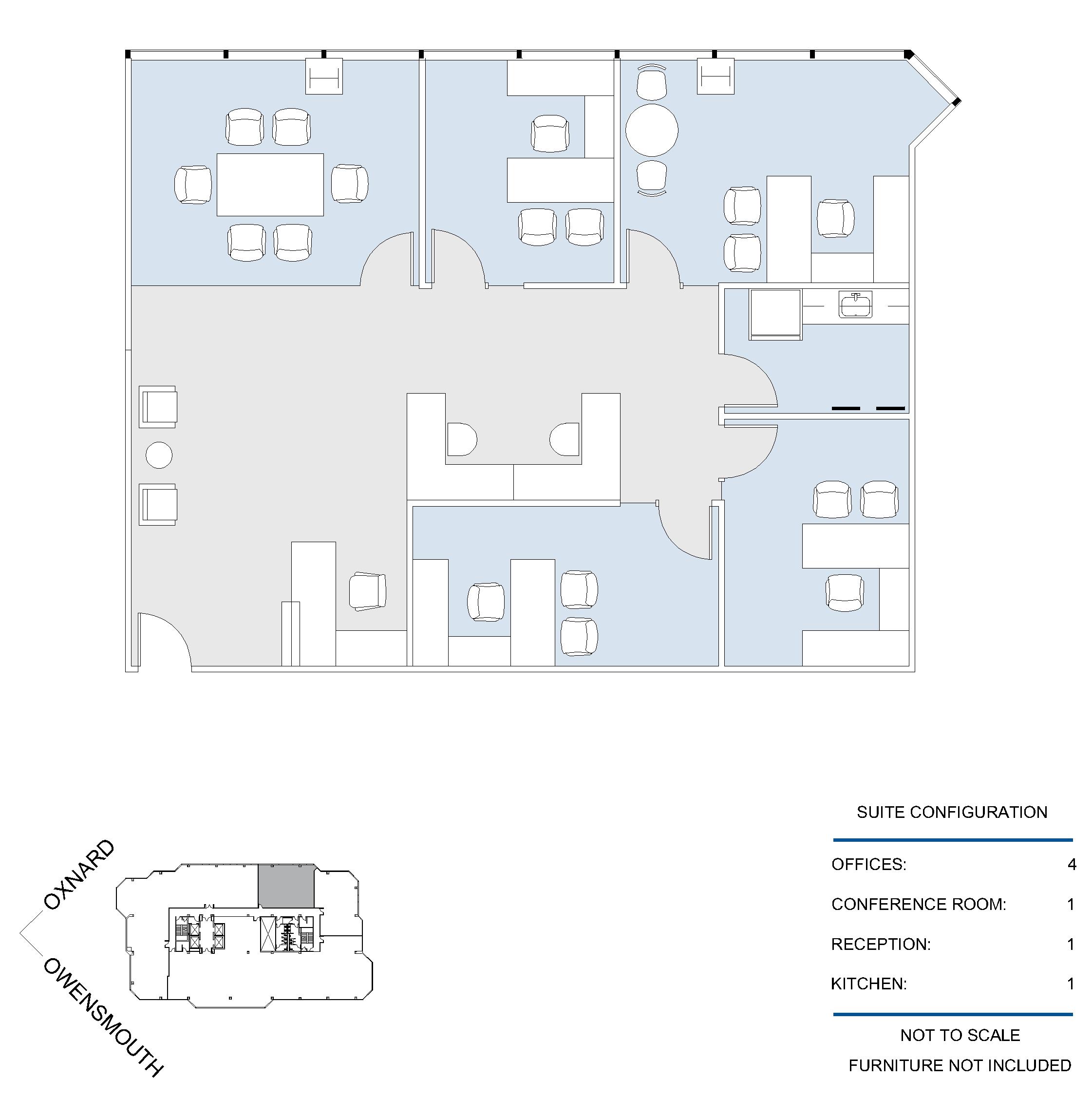 4 window offices, 2 conference rooms, kitchen, file store room, and reception area.