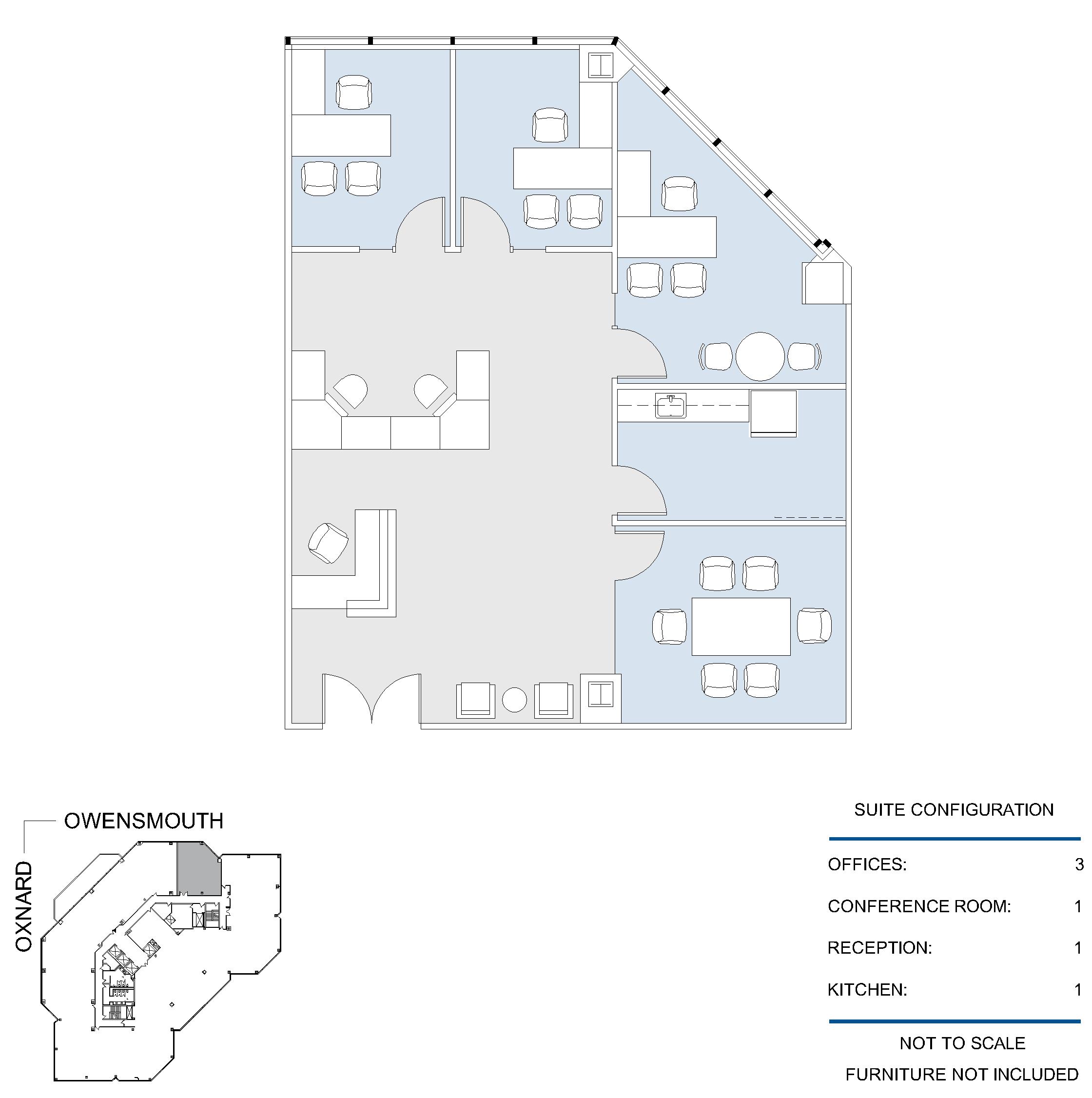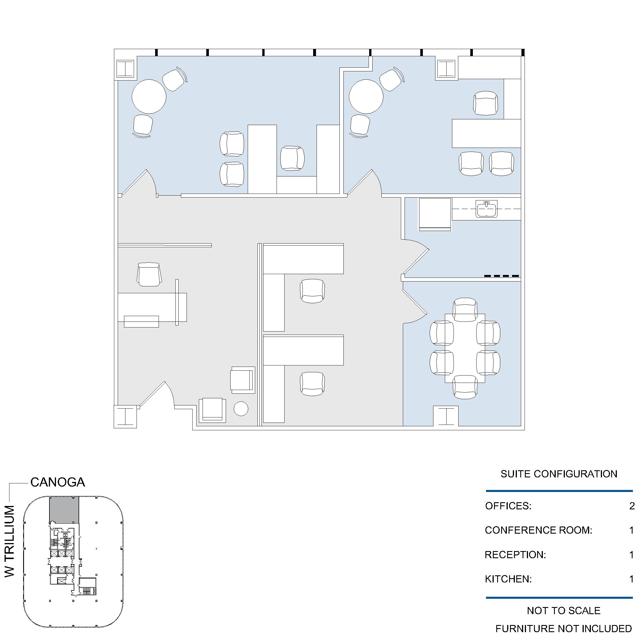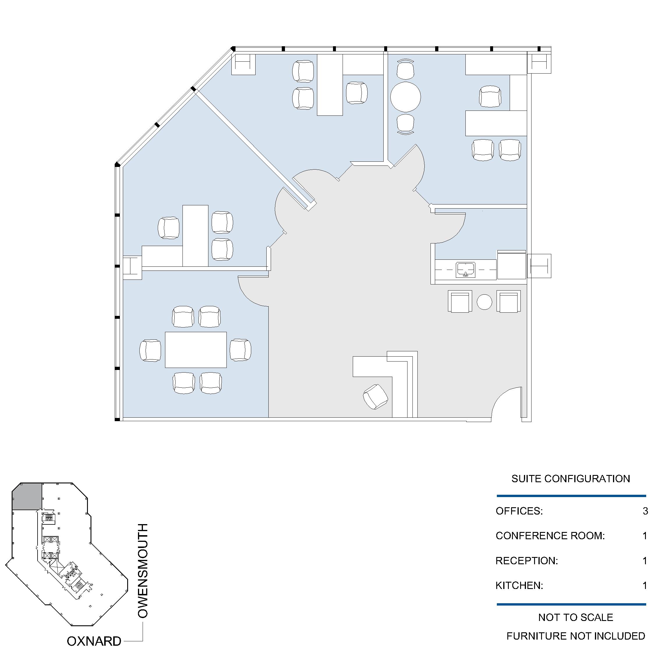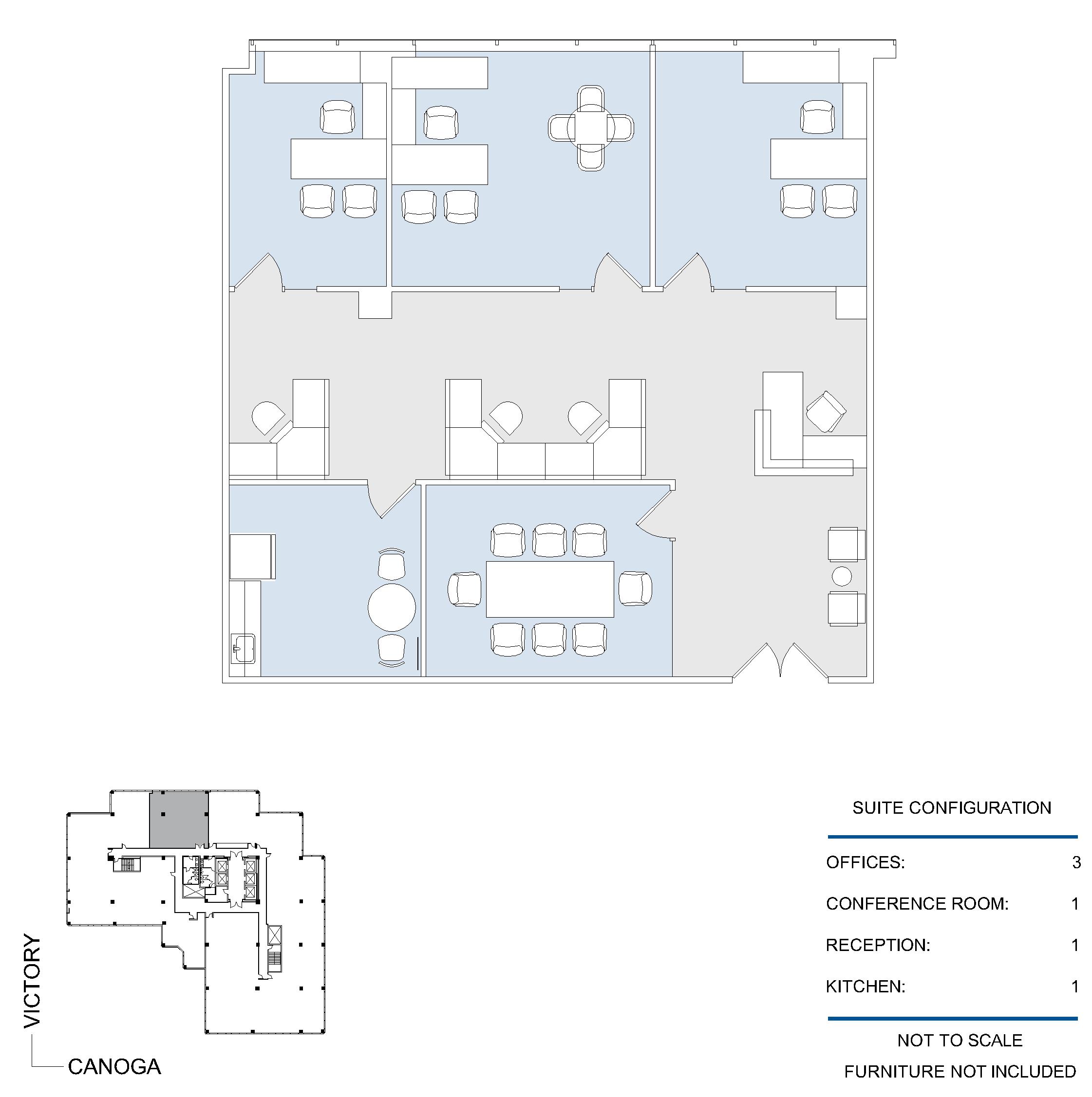 3 window offices, window line conference room, open work area, kitchen and reception area.